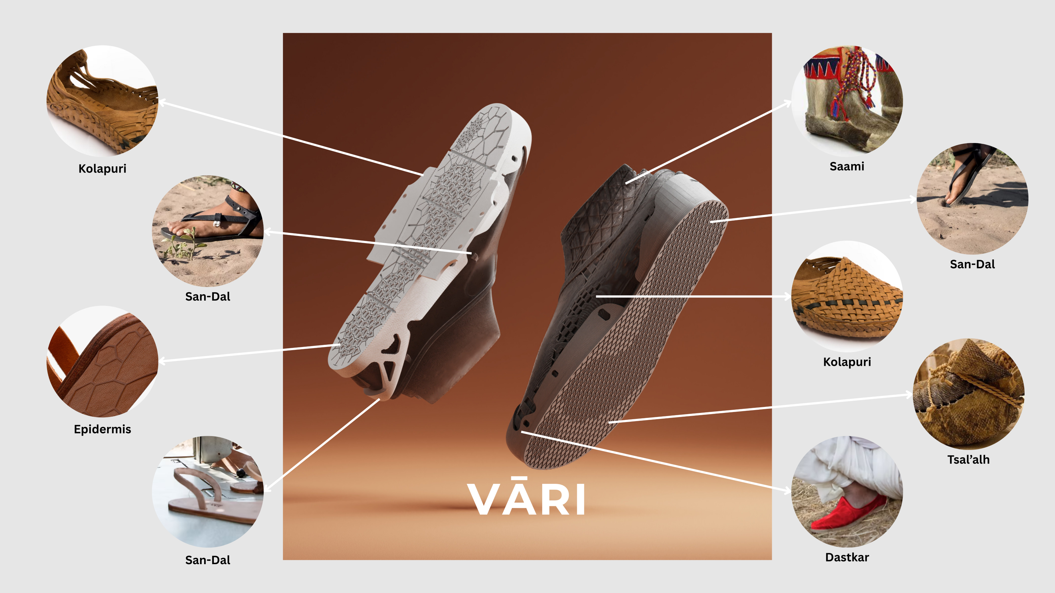 VĀRI is a fully 3D-printed, modular shoe inspired by barefoot ergonomics and traditional cobbler craft. Made entirely from TPU, it features interchangeable outsoles that adapt to different terrains and activities (walking and running). The mono-material design enables complete recyclability, worn parts can be shredded and reprinted. Comfort, flexibility, and support are digitally tuned through infill patterns, creating a customizable, circular, and glue-free footwear system for modern needs.