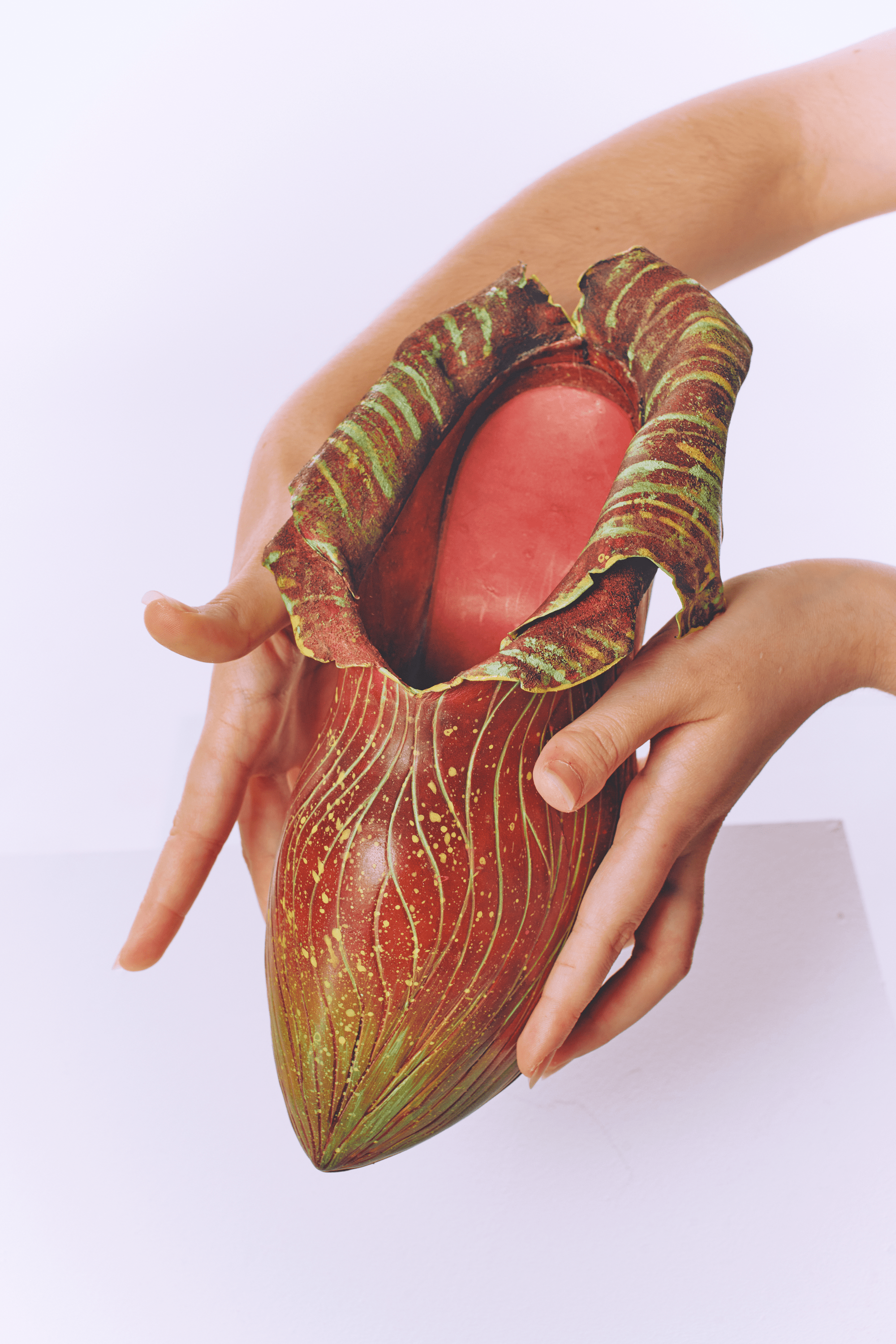 The “huntress pouch” is meant to emphasize the double standard of man and woman genitalia. The project represents the vagina as a carnivore plant in a fantastic alienlike look.