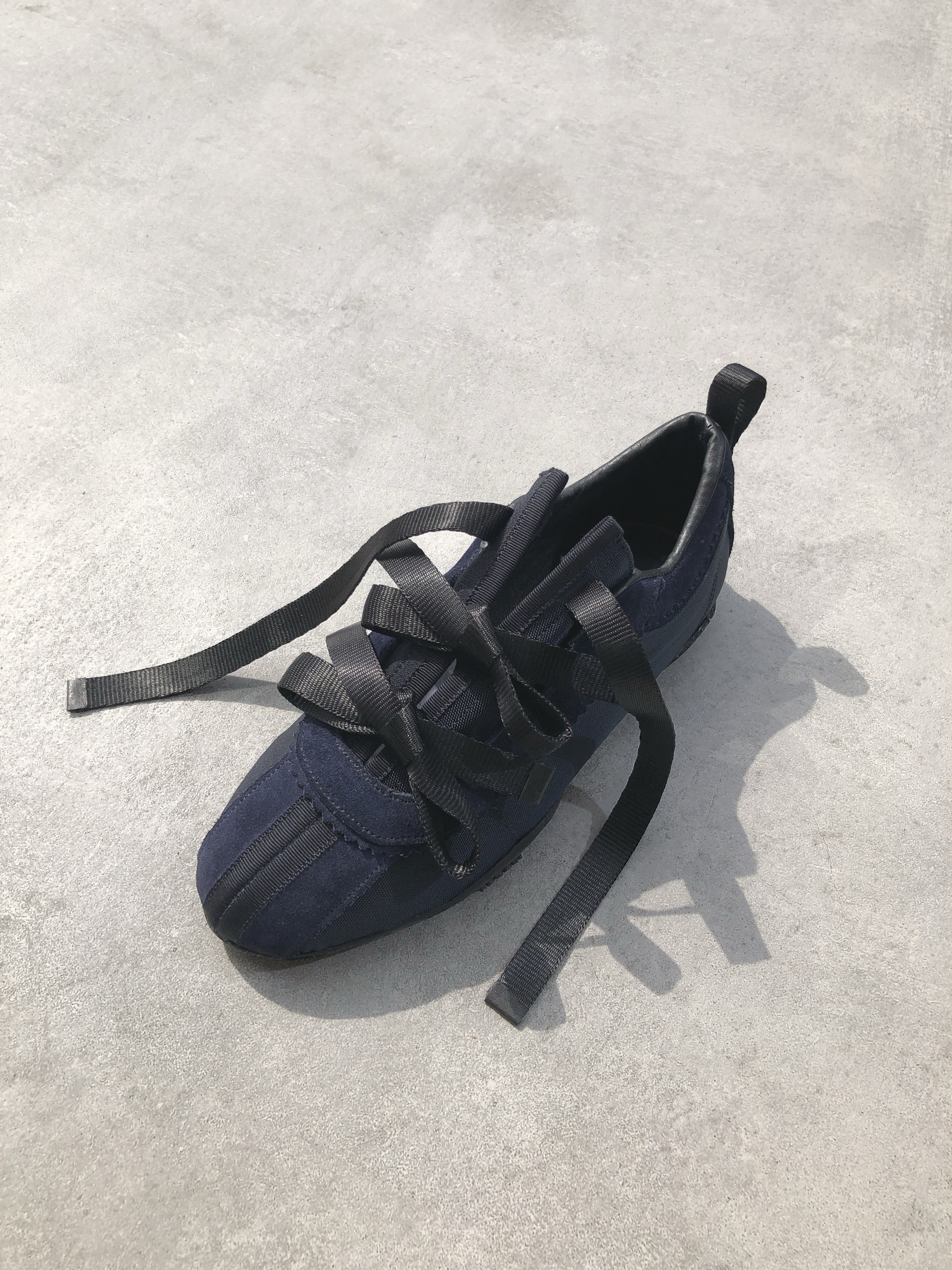 Nu Blue is a laceless sneaker featuring a split tongue as if a sword had pass by. This system is secured by three glossy black straps.