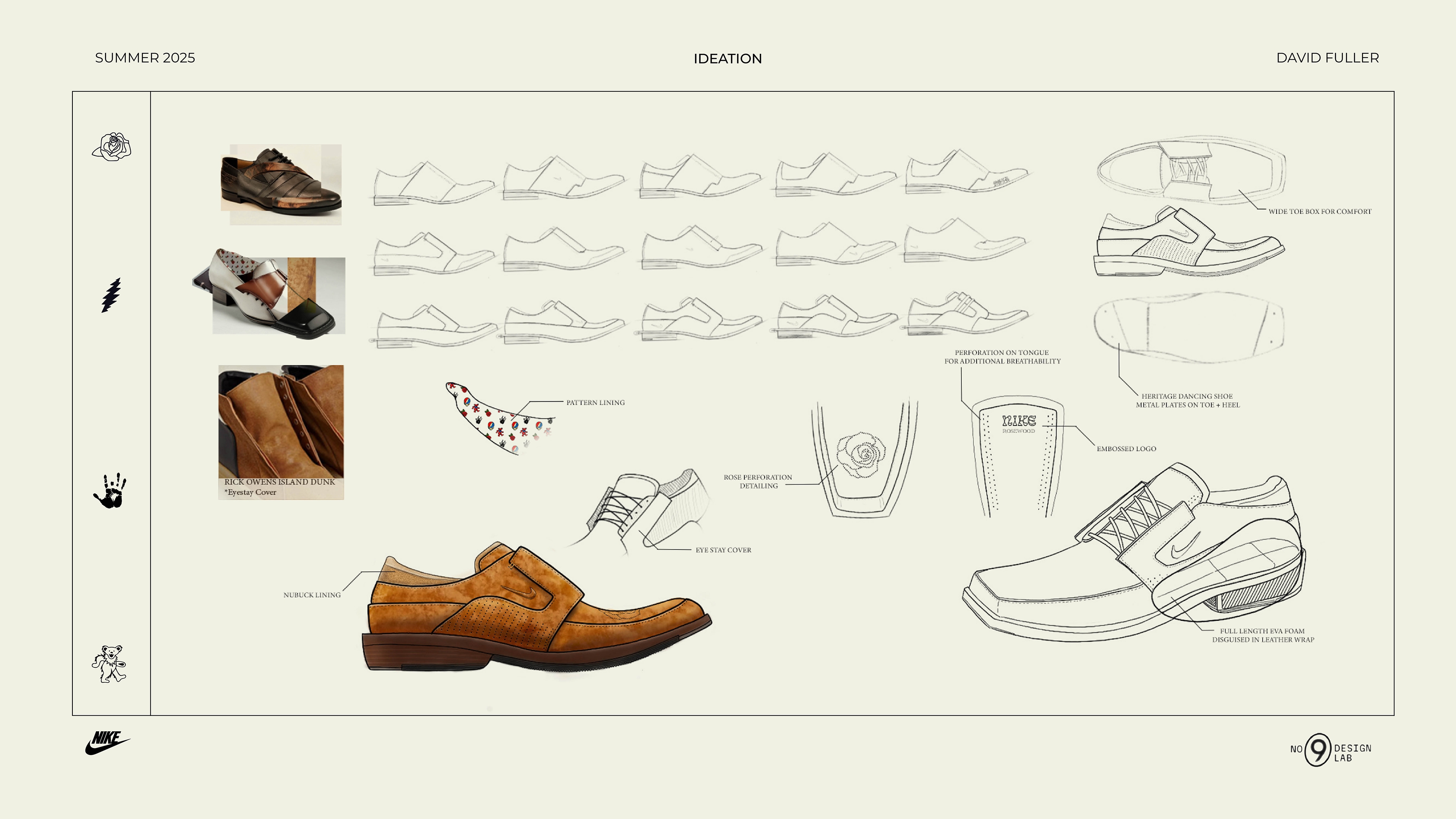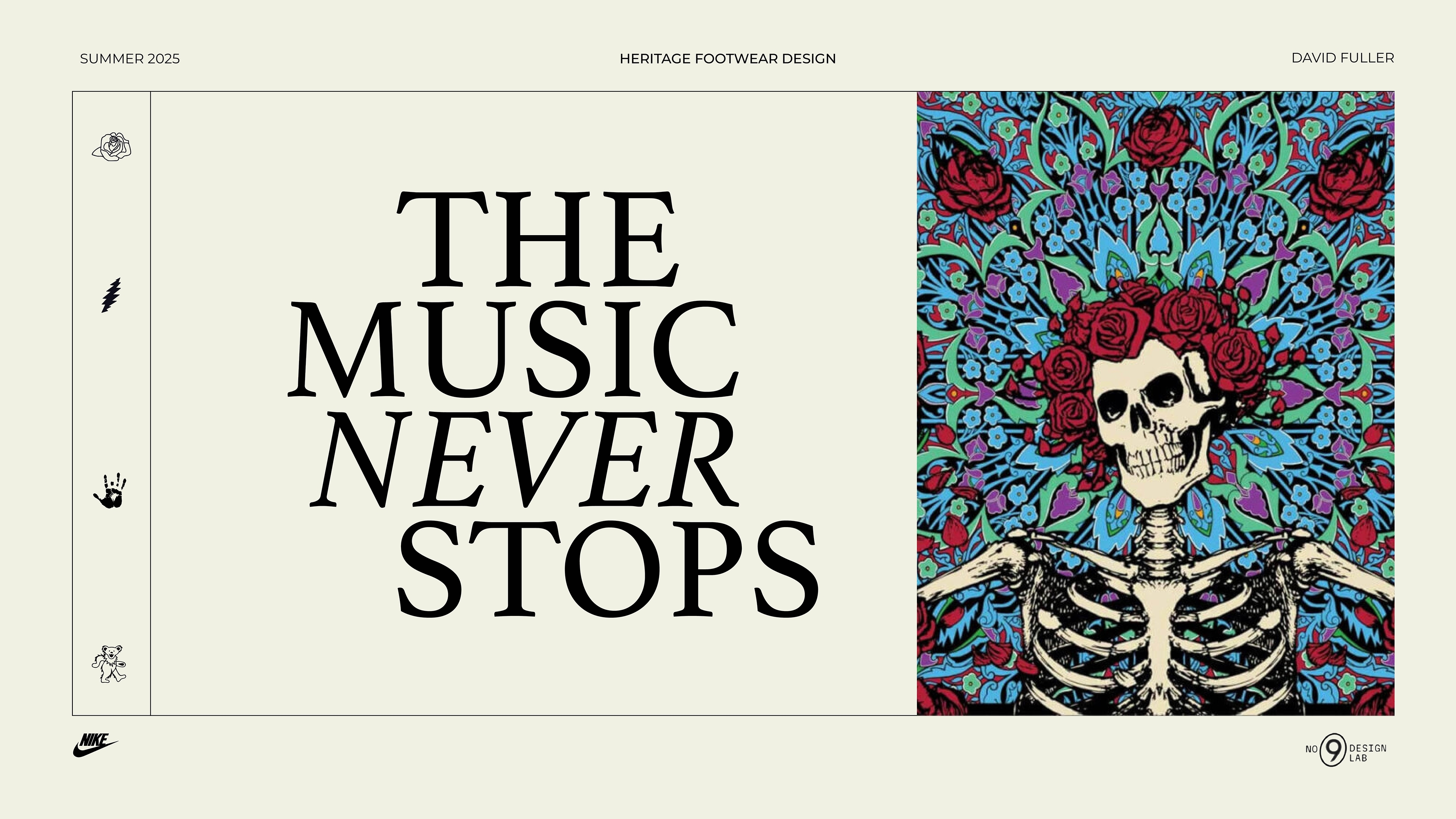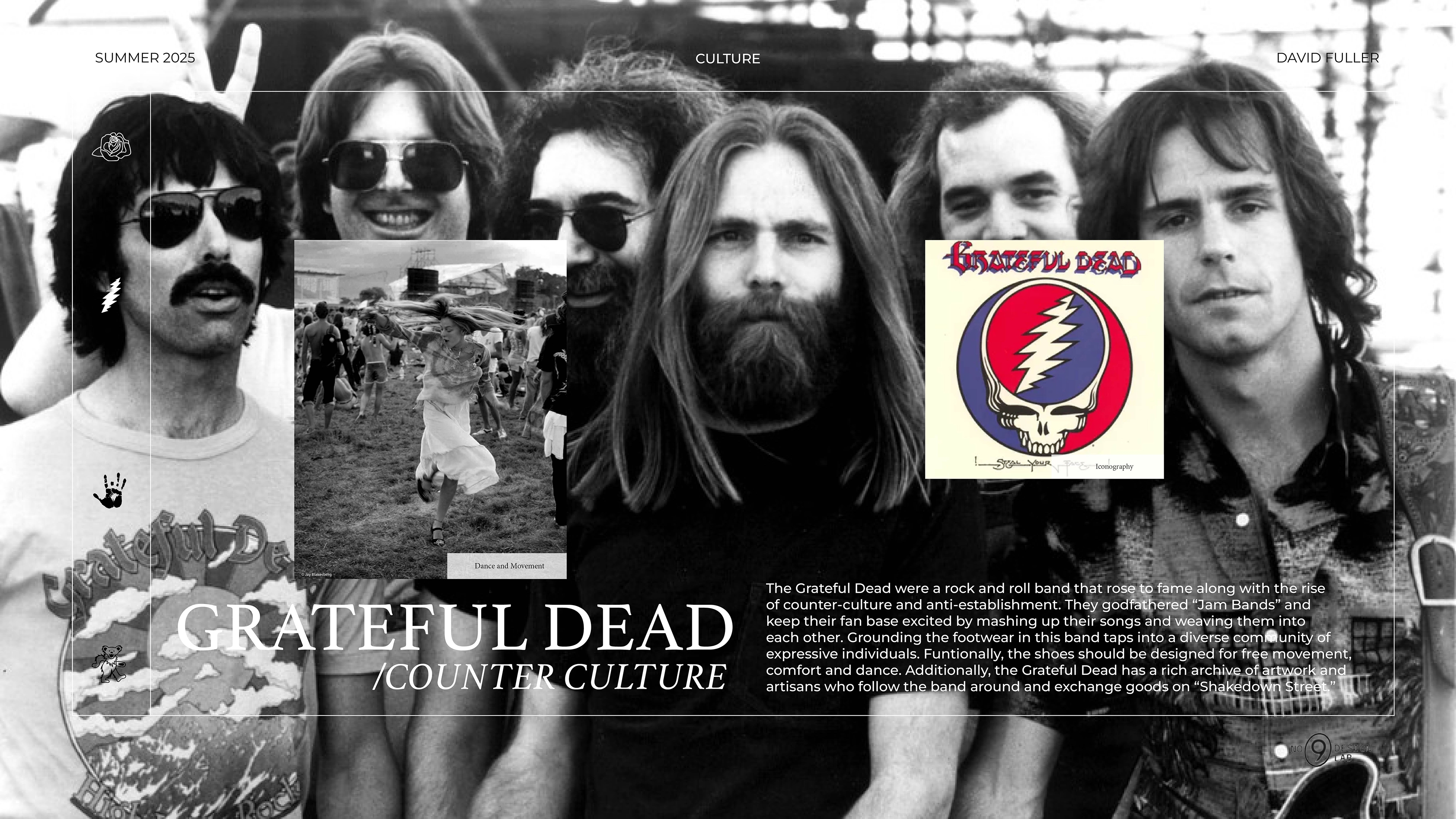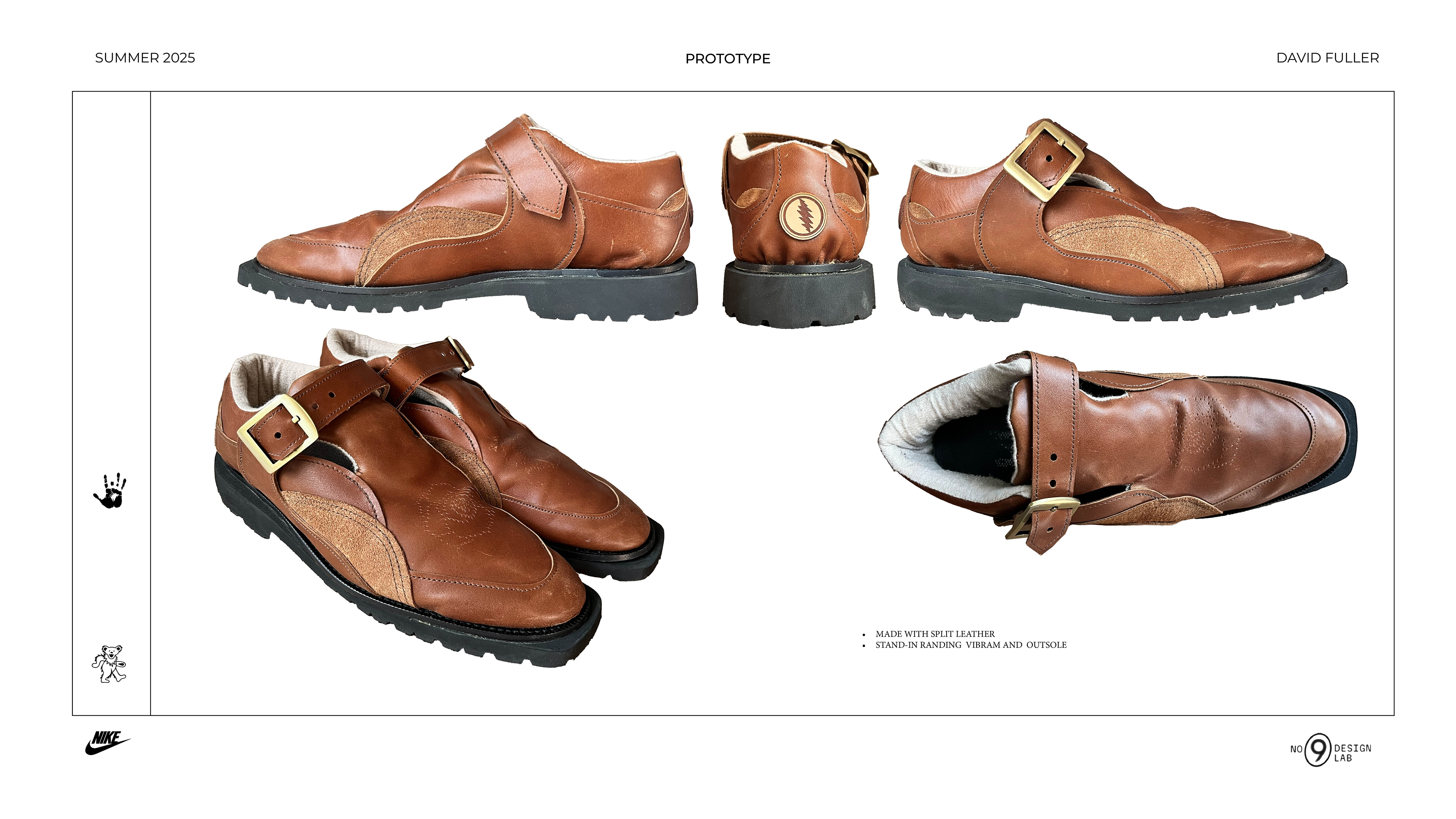 This heritage footwear concept celebrates the enduring legacy of the Grateful Dead, blending heritage craftsmanship with the band’s free-spirited counterculture roots. It merges the sophistication of a dress shoe with the comfort and freedom of a sneaker, incorporating sustainable materials, iconic artwork, and subtle nods to the community’s artistry and built for those whose style whispers rebellion while honoring a timeless cultural movement.