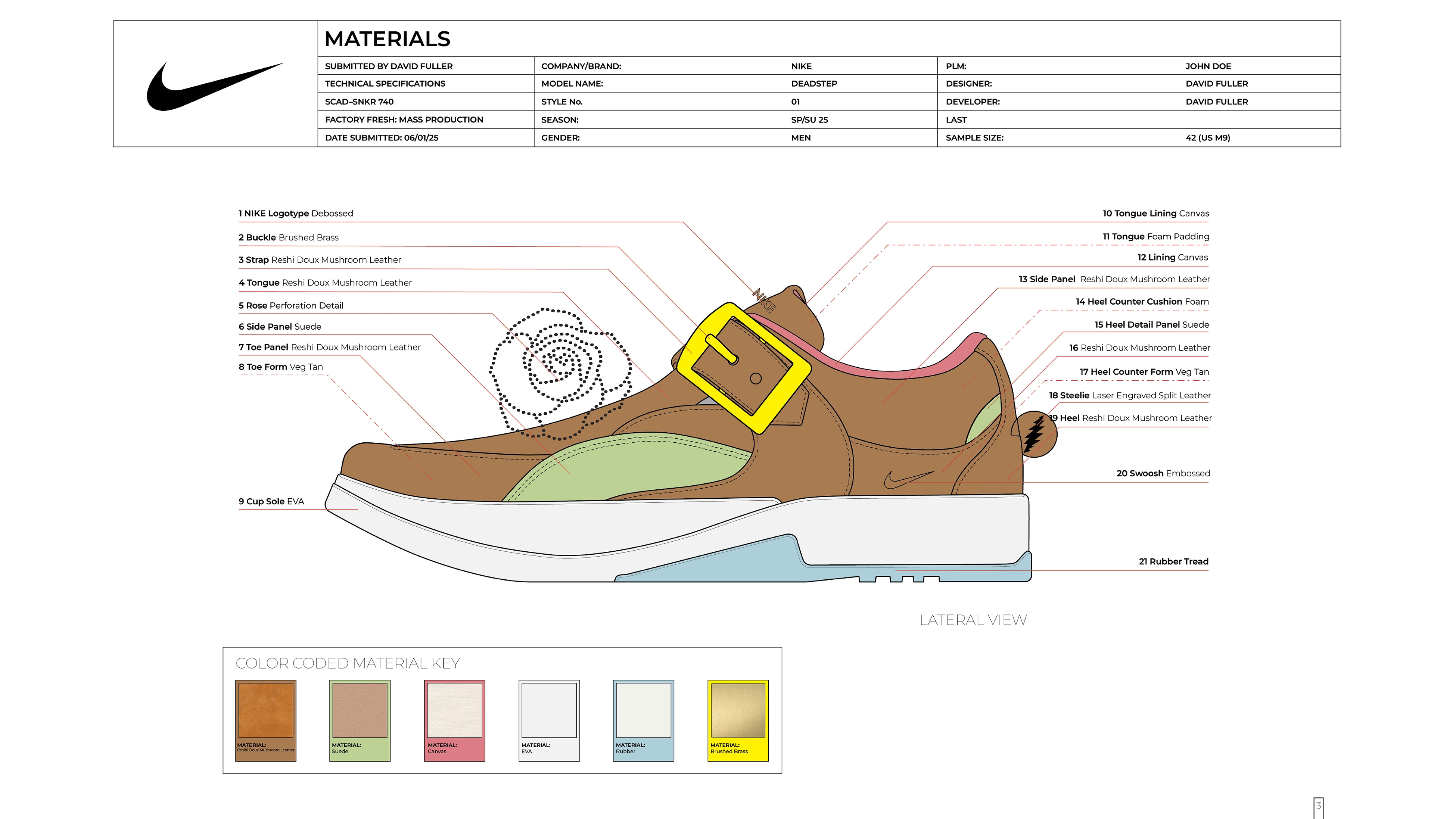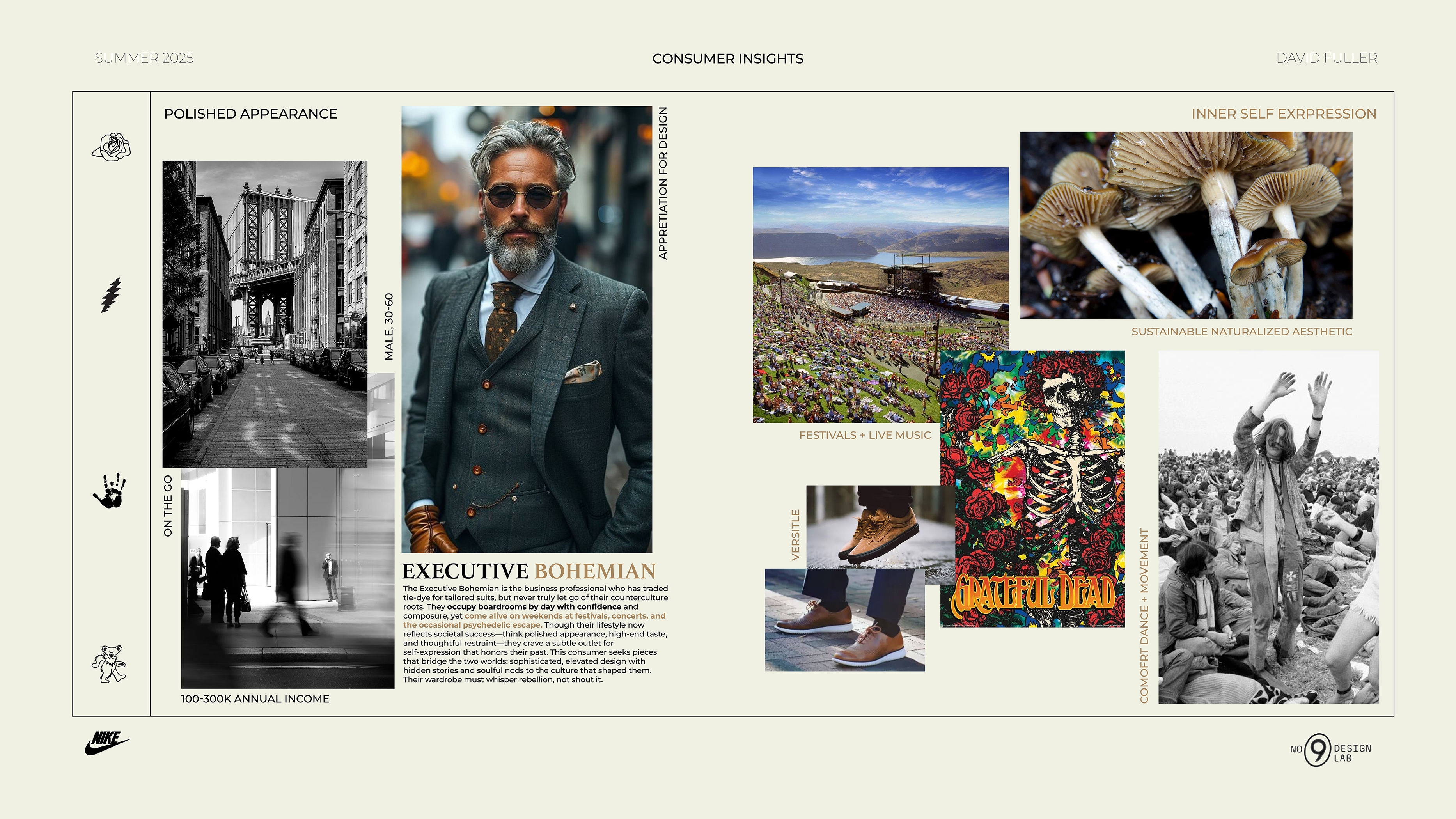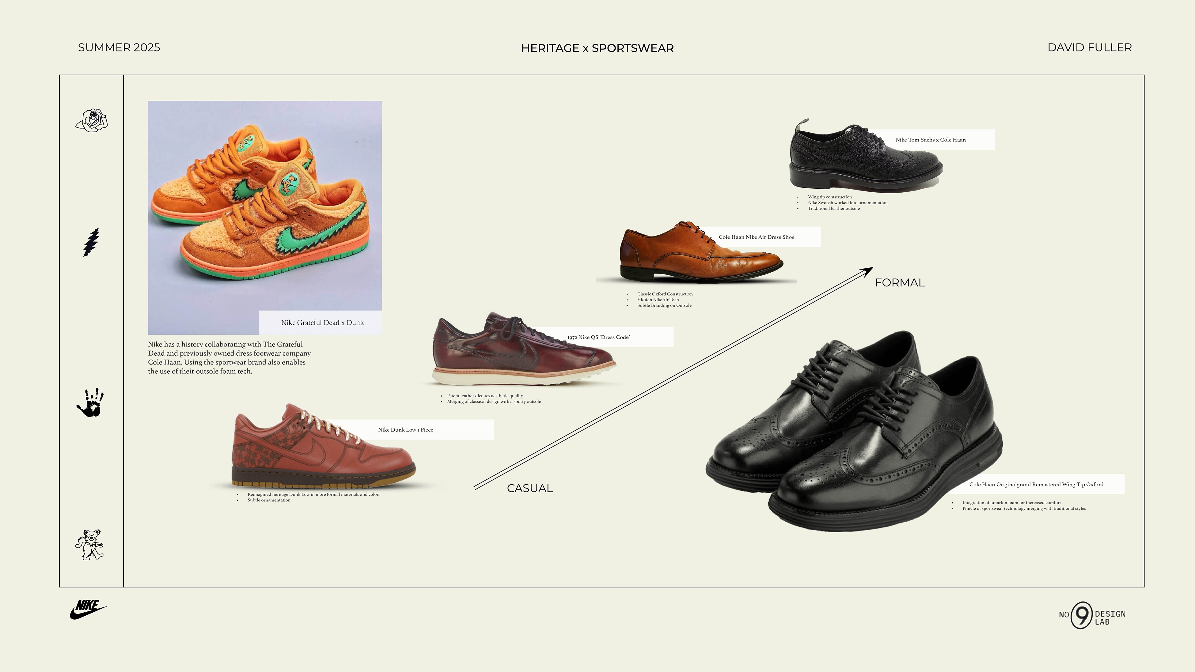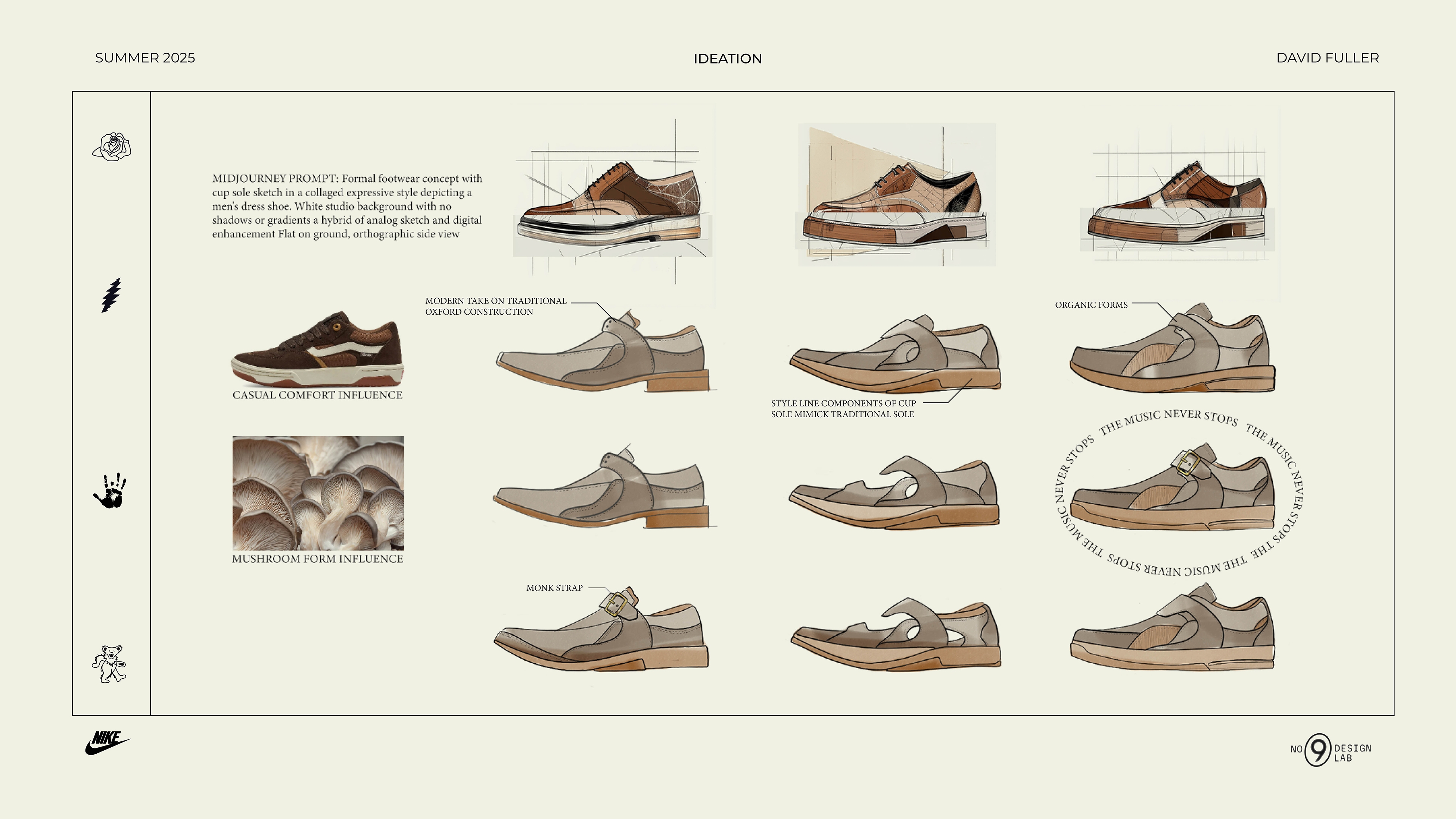 This heritage footwear concept celebrates the enduring legacy of the Grateful Dead, blending heritage craftsmanship with the band’s free-spirited counterculture roots. It merges the sophistication of a dress shoe with the comfort and freedom of a sneaker, incorporating sustainable materials, iconic artwork, and subtle nods to the community’s artistry and built for those whose style whispers rebellion while honoring a timeless cultural movement.