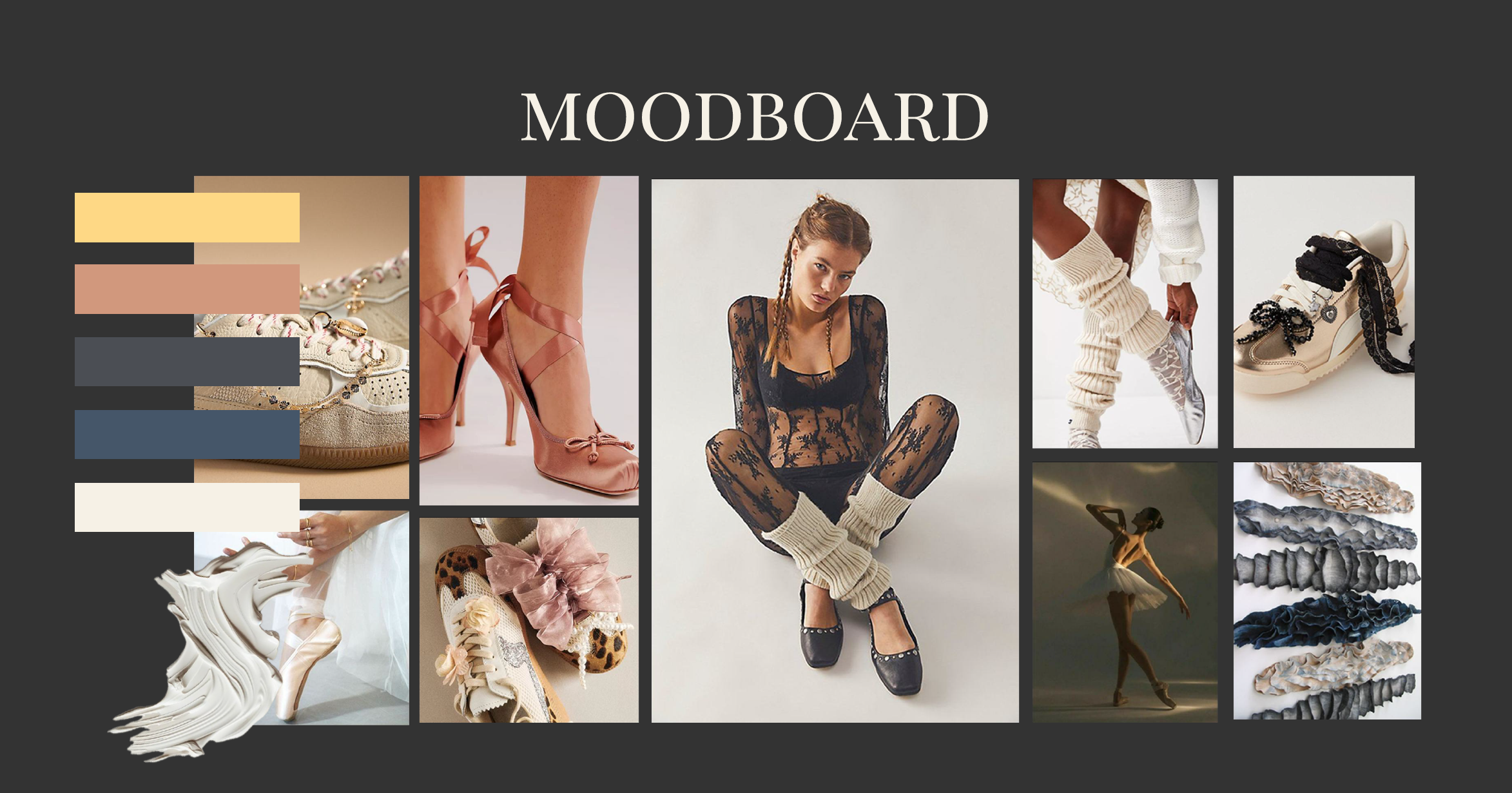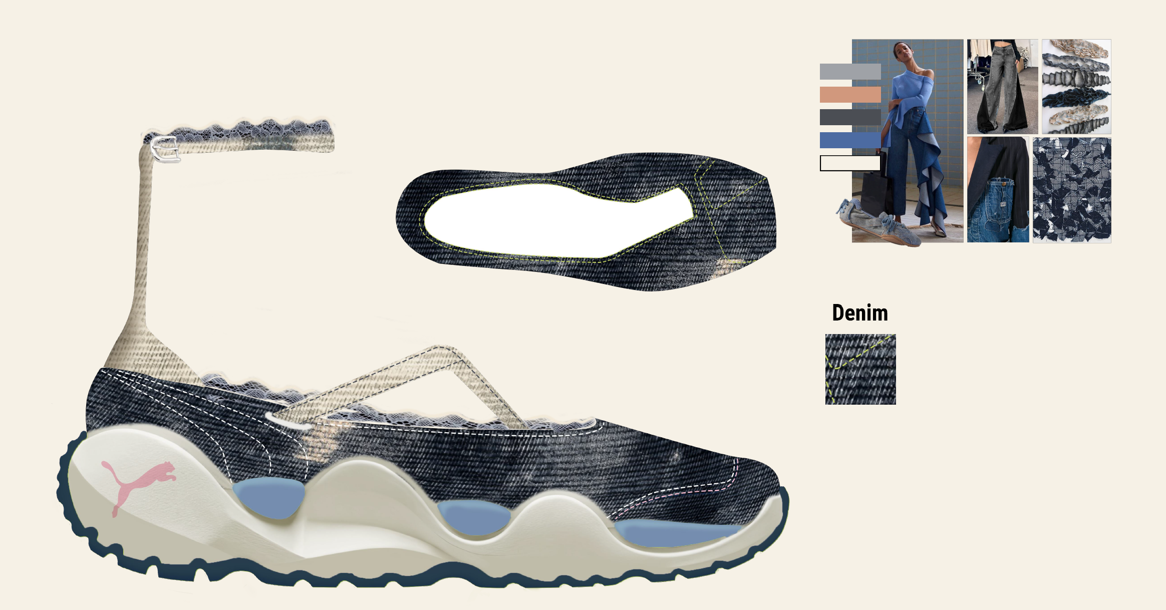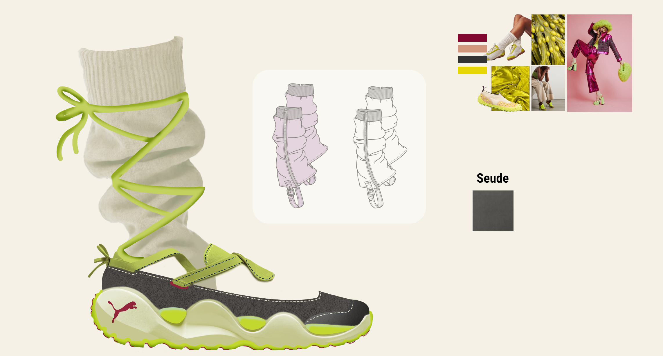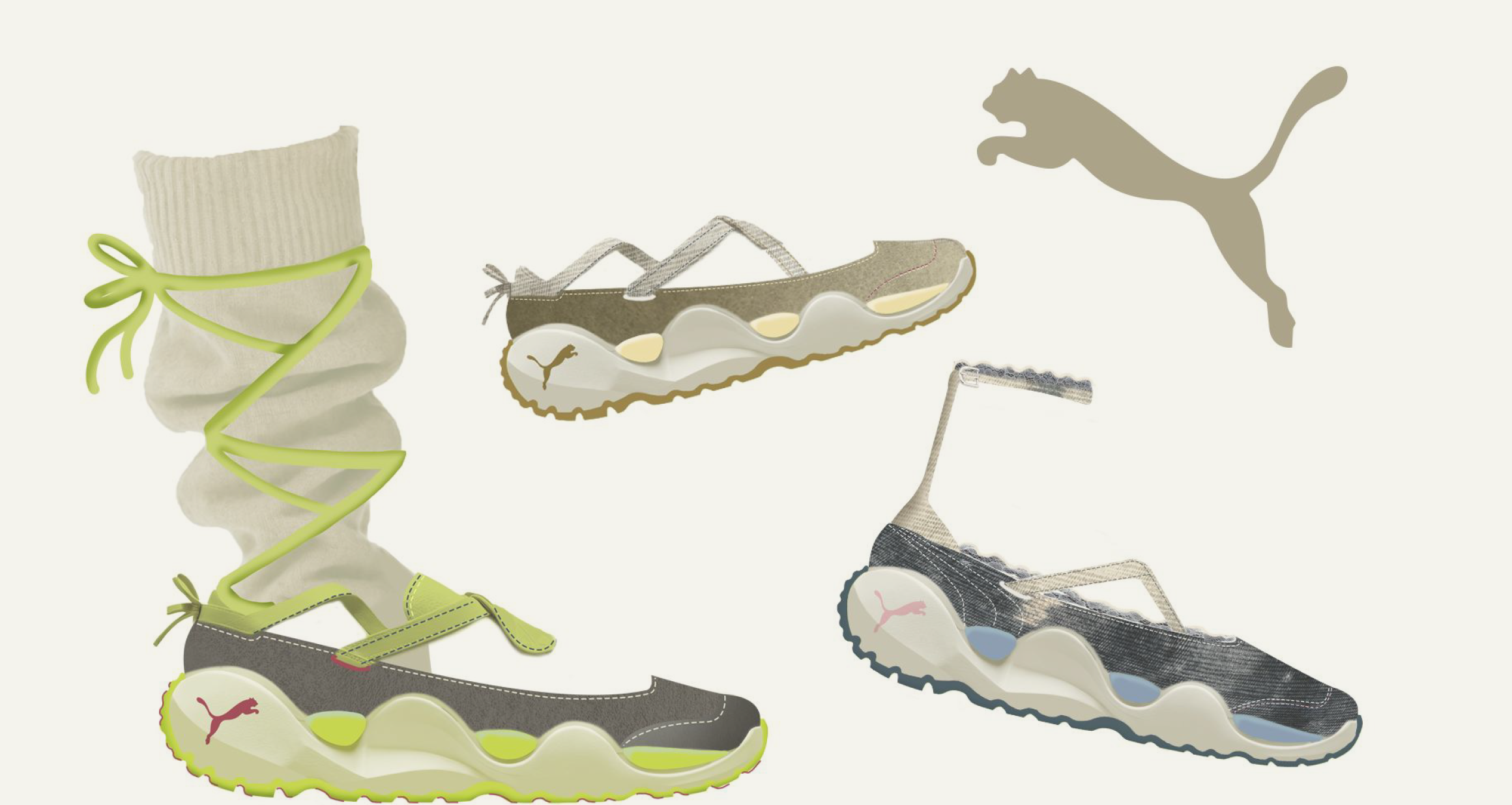 This concept is a modern take on the ballerina silhouette which brings in more exaggerated sneaker inspired volumes and at the same time being versatile and feminine.