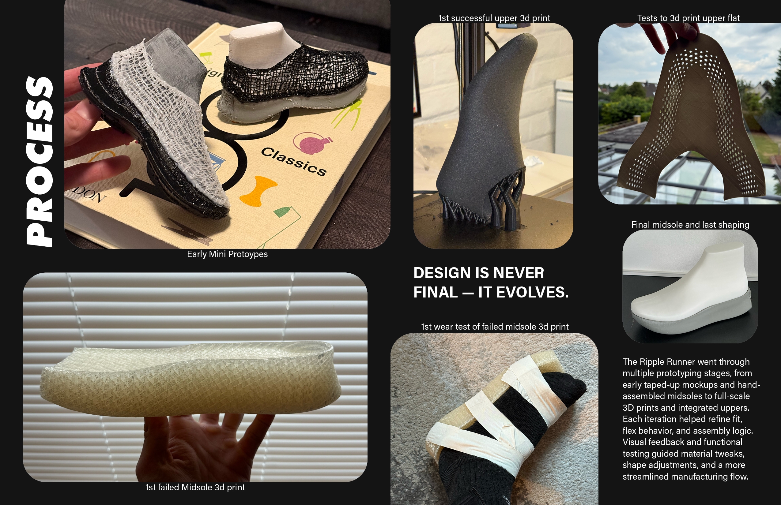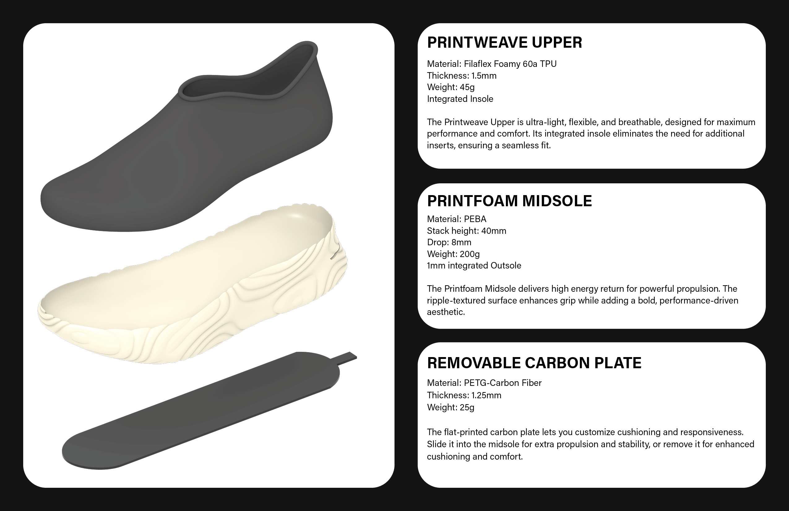 RIPPLE RUNNER is fully 3D printed and engineered to combine elite speed, everyday comfort, and bold design. Featuring a removable carbon plate, high-energy return Printfoam midsole, and breathable Printweave upper, it adapts to both training and competition. Inspired by ripple textures and foot pressure mapping, the design responds to movement with customizable performance. Built for runners, athletes, and creators alike, this shoe moves seamlessly from tempo runs to gym sessions and daily wear.