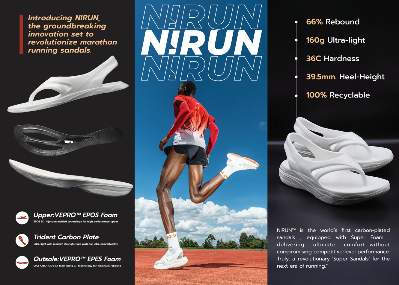 Nirun blends cutting-edge performance technology with sustainability, making it ideal for runners of all levels. Featuring a unique Carbon Plate and VEPRO Tuned Foam, Nirun offers superior efficiency, speed, and shock absorption, rivallin traditional shoes. It' eco-friendly design uses sustainable materials and minimizes waste through an energy-efficient process. Weighing just 167g (Size 42 / US 9) with an internal length of 270 mm, Nirun’s breathable and flexible structure ensures unmatched comfort for every runner, from casual joggers to elite athletes, across various distances and terrains.