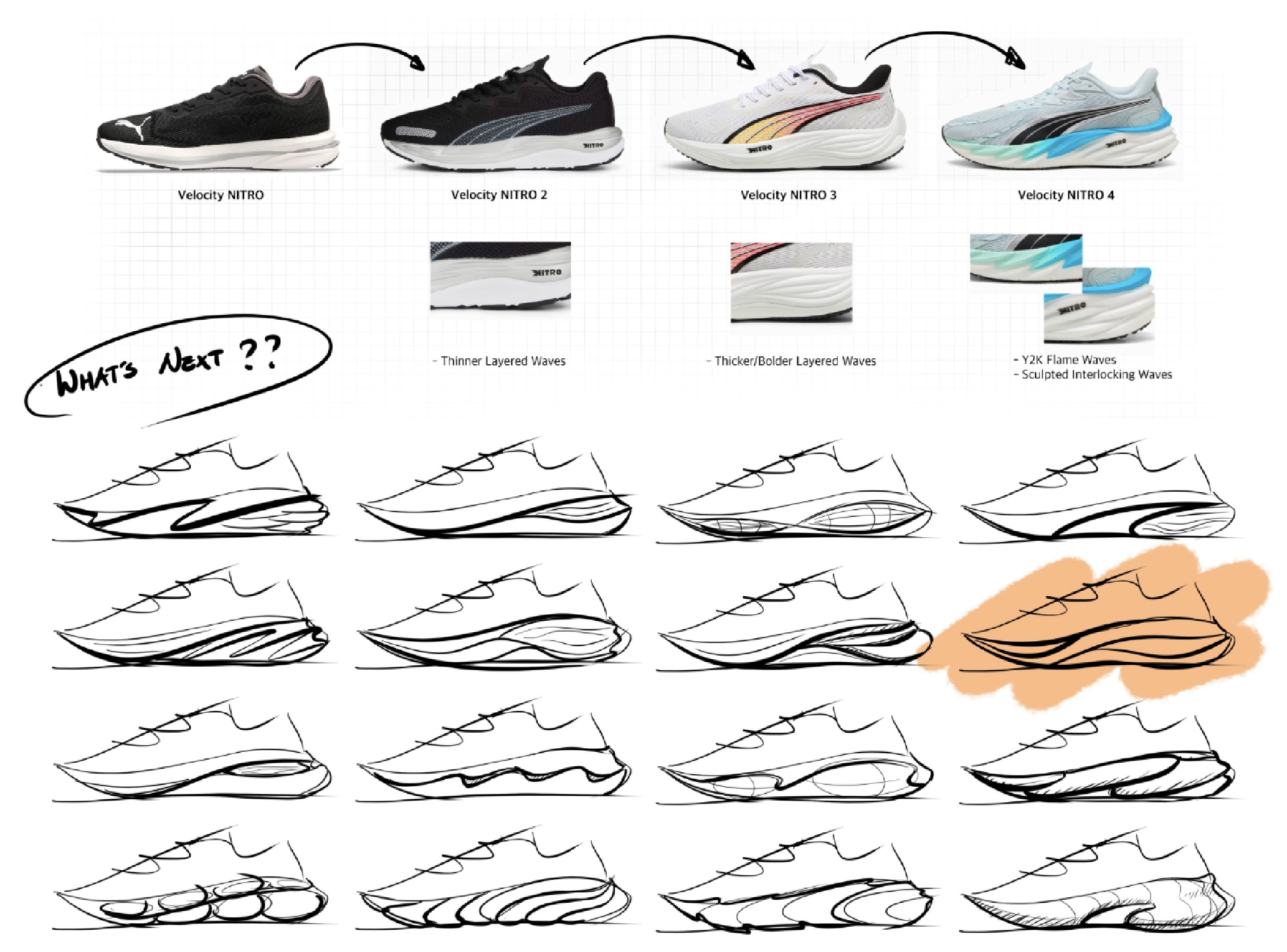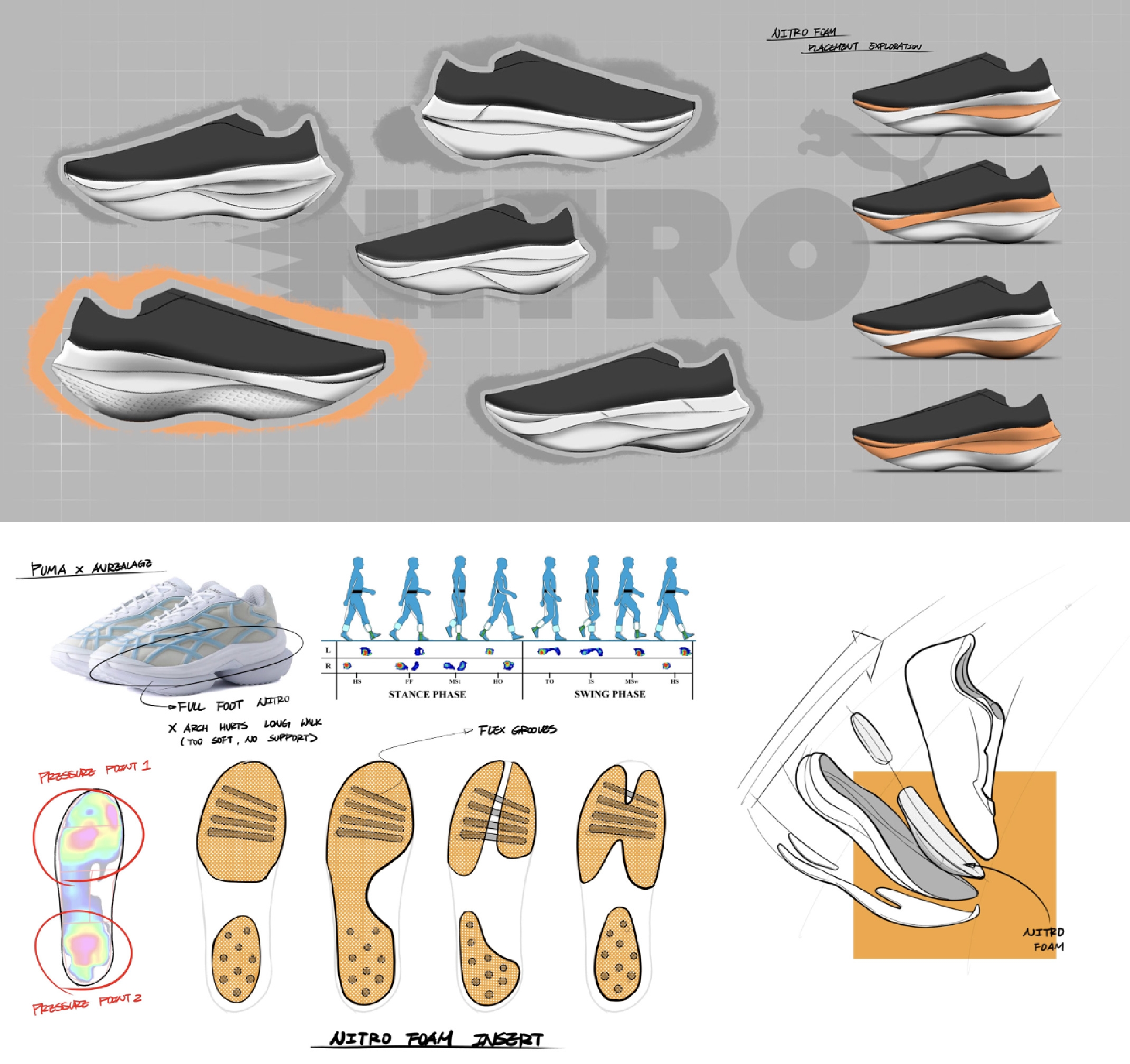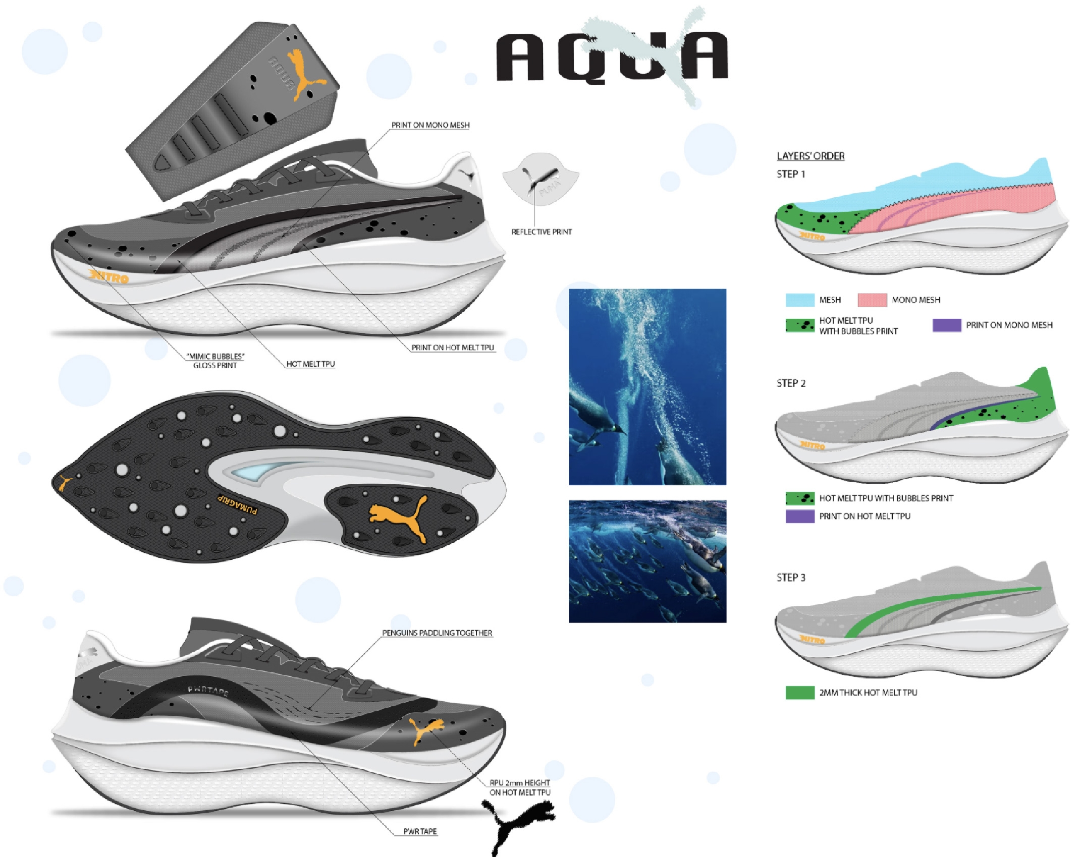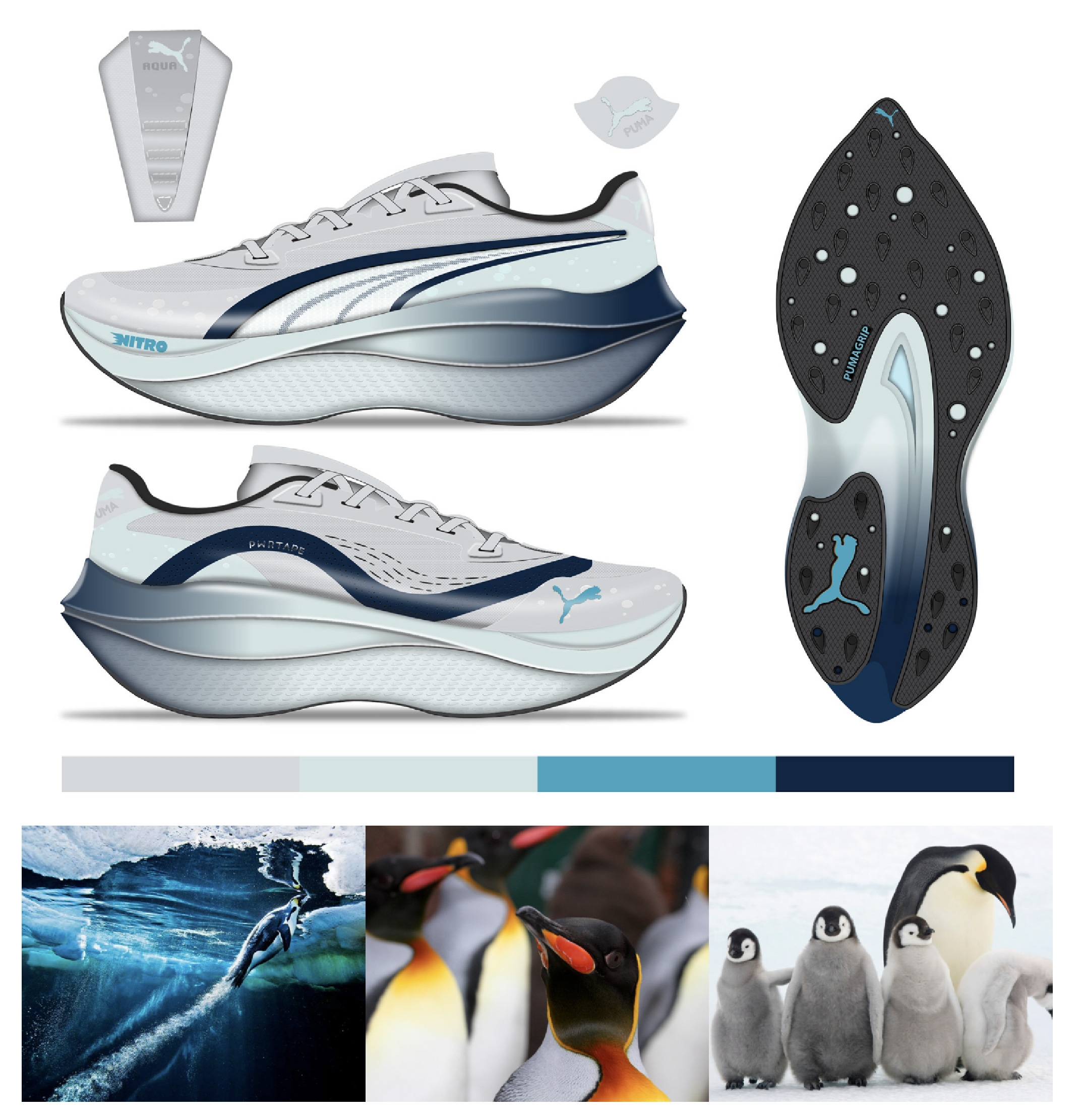 Inspired by penguins at the New England Aquarium, the Puma Aqua blends playful charm with racing performance. Rounded lines and a rocker sole echo a penguin’s belly and tail, while Nitro foam and PowerTape deliver speed and support. A translucent Formstrip window adds “ice” breathability, and feather-shaped grips with bubble cutouts lighten the outsole, mimicking penguins gliding through water—soft, inviting, yet built to fly on the run.