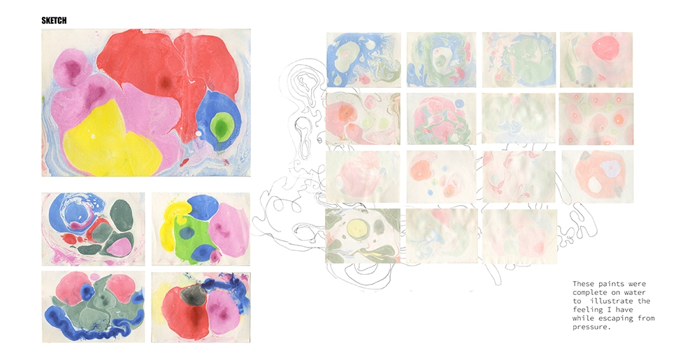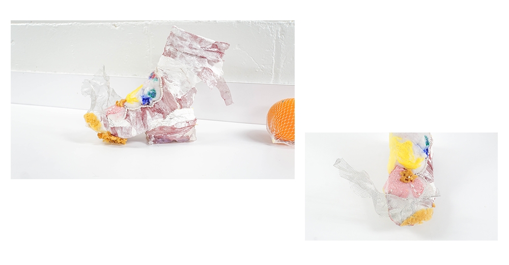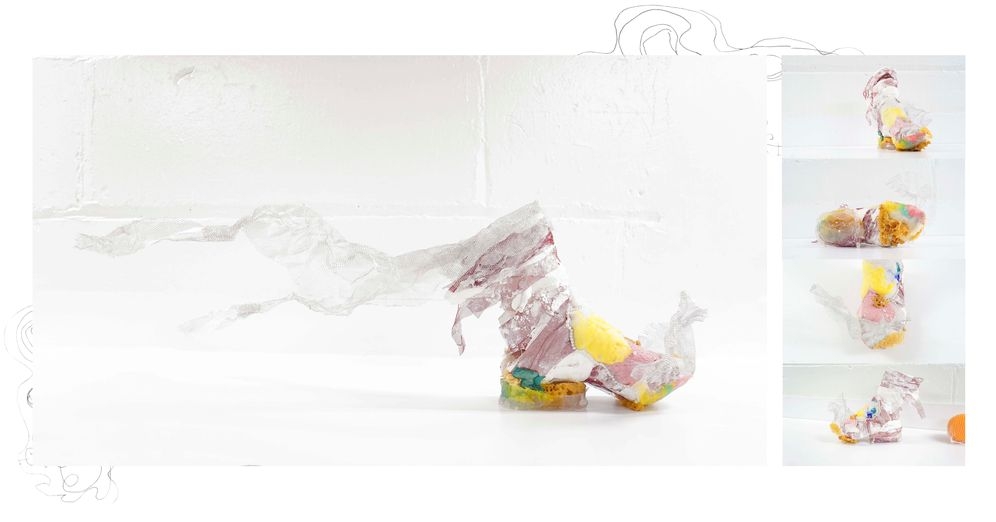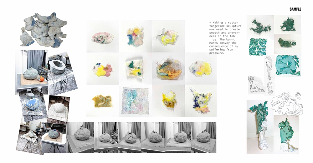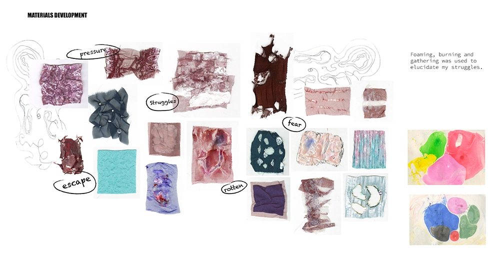 This work expresses vulnerability that has been inside me for a long time. When I was in a bad relationship. I was afraid I would be blamed by others if I broke up with the person. I would drag the relationship on until it was rotten. I got used to Escaping because I couldn’t suffer from pressure and blame. So I use some methods such as sewing, heating and hot waxing was used to create smoothness and unevenness in the fabrics. The burnt marks convey the consequence of my suffering from pressure. And the use of medical materials like plaster bandages to express "injury" and "vulnerability".