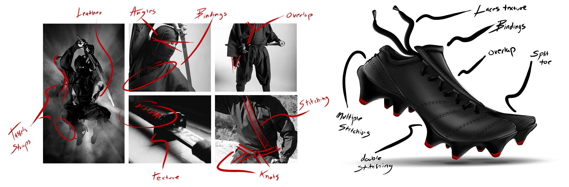 The cleats draw inspiration form traditional Japanese ninja warriors who adopted the tabi in their warrior attire.