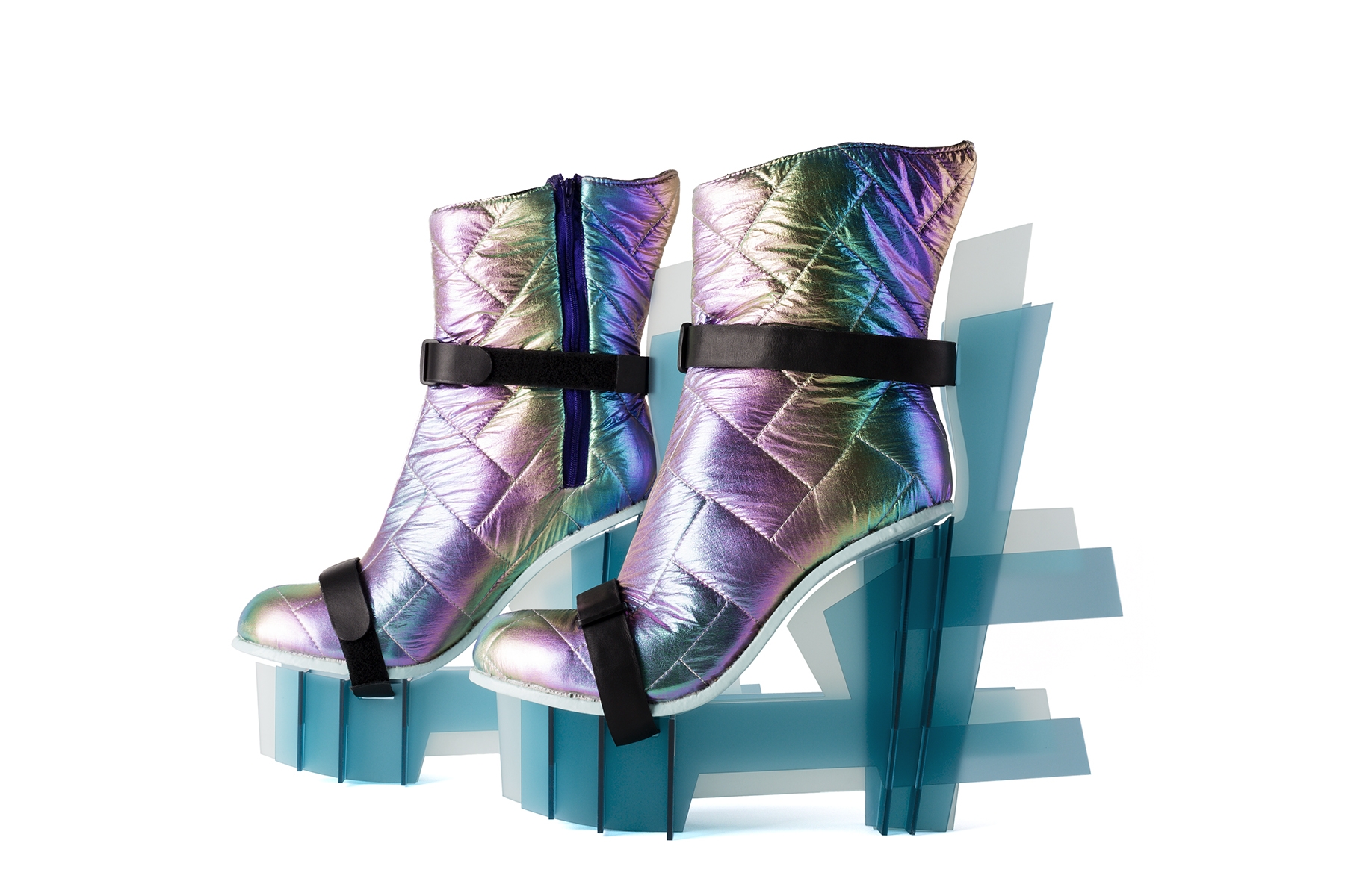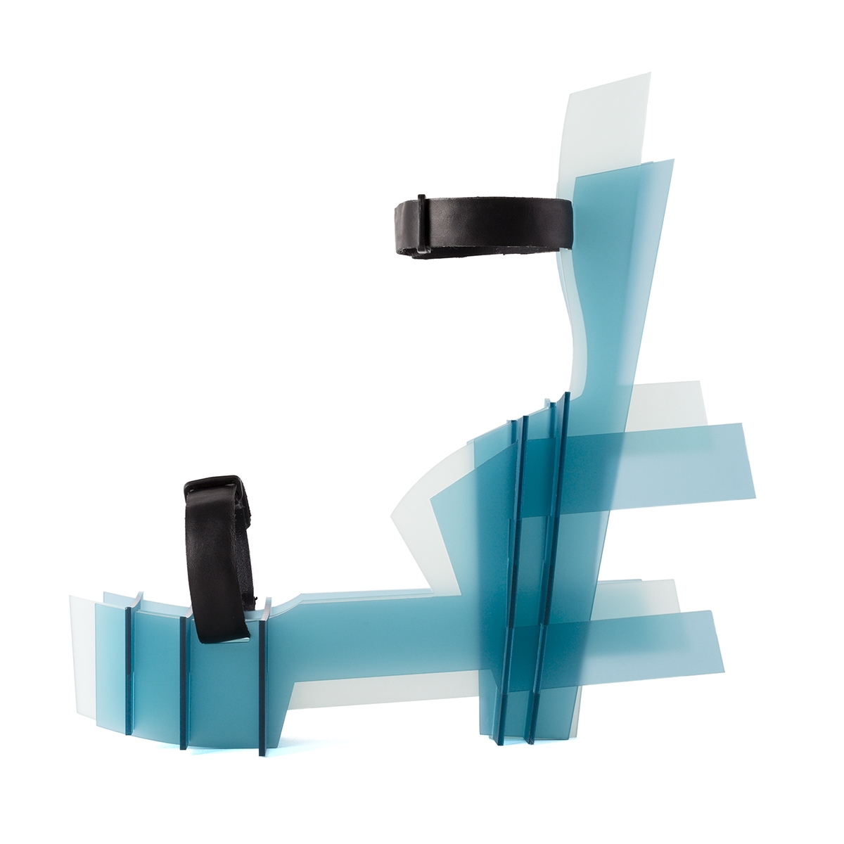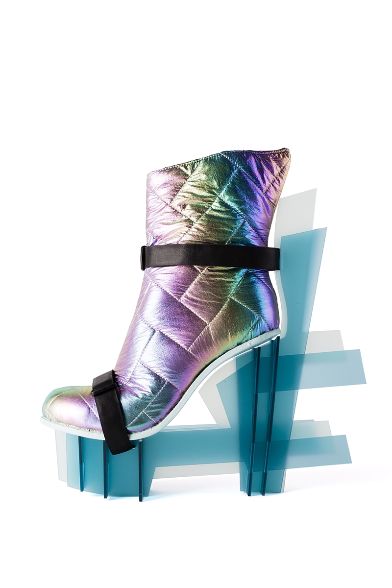 Painters make use of composition with the aim of expressing the flat surface of the imaginary space. As a designer this is a element that fascinated me&I asked myself whether you could also bring a 3D object back to the flat surface. To be able to reassemble it later as a 3D form or object for use. This is where my inspiration started, also I was fascinated by something else,I got the plan to make a shoe design, that is possible to put it together and to disassemble it again. This is a new way of looking at footwear, and there are endless new options. It is made rest material plexiglass.
