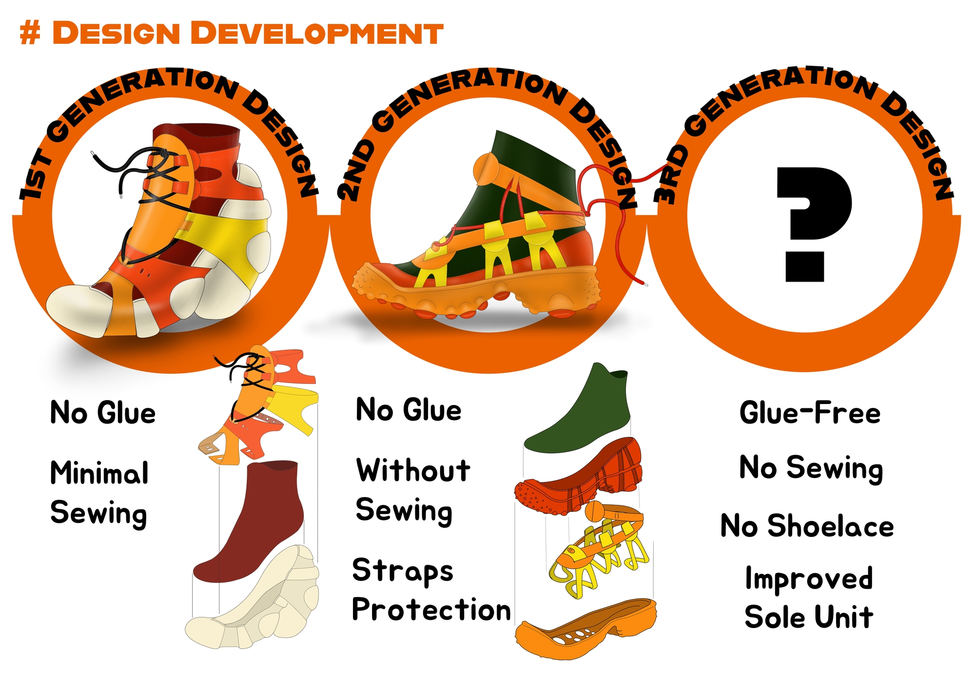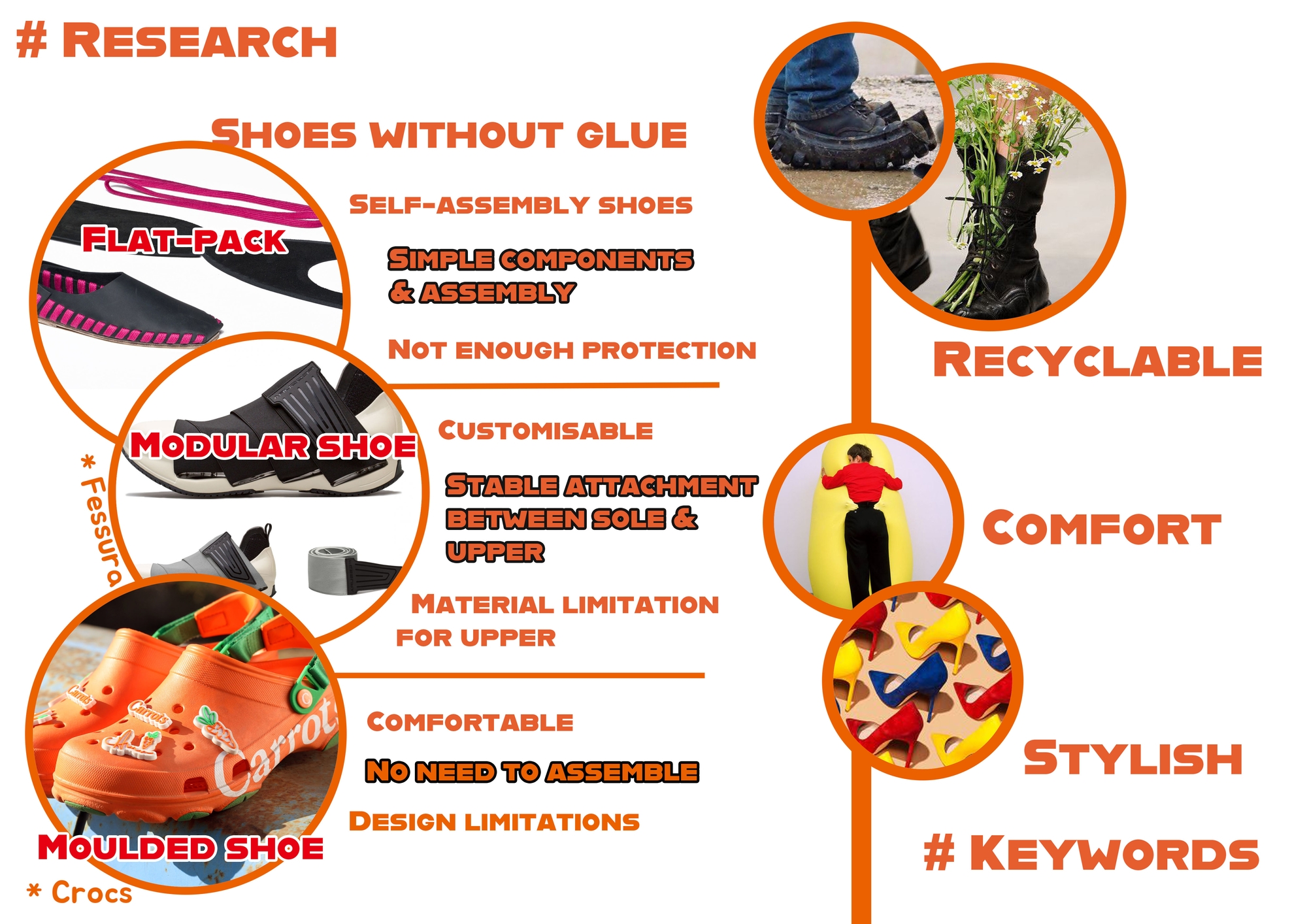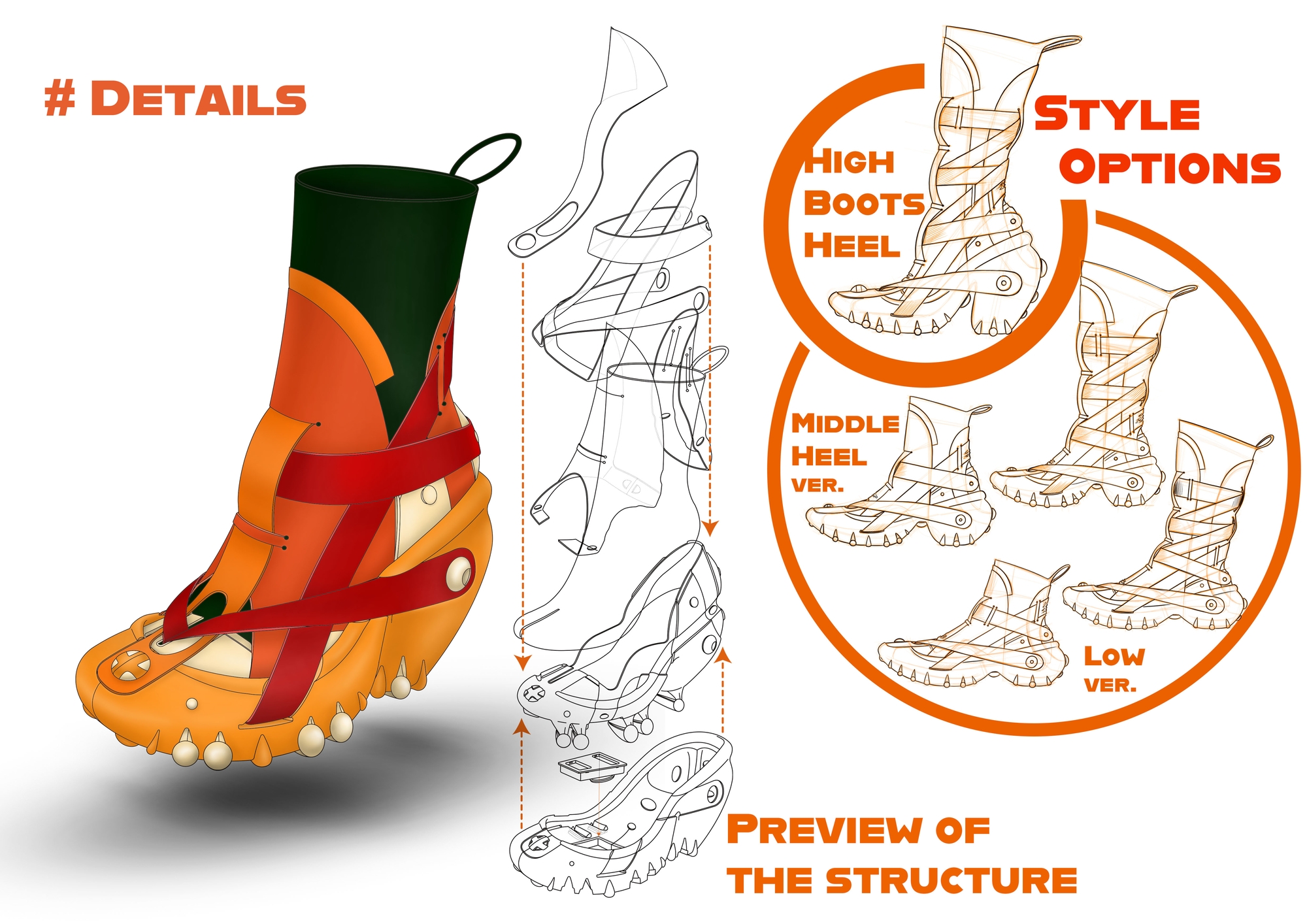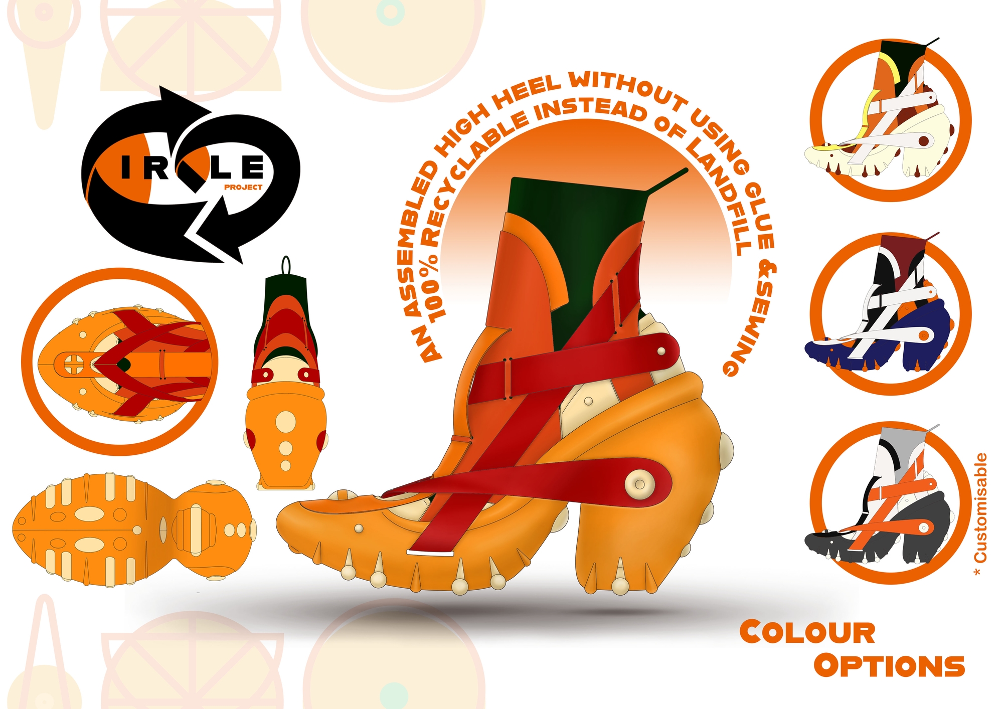 The project was designed to be inspired by the unique structure and repeated circular shapes of the citrus fruits. This high-heel design is a modular shoe that does not require glue use and sewing and can be separated and discharged 100%. Since this shoe does not use glue, it was tried to solve the health deterioration of production workers caused by using glue and change the non-recyclable state that occurs when disposing of them by breaking the mixed form of various materials. In addition, the design was devised as a shoe that can be worn for a long time by paying attention to sustainability