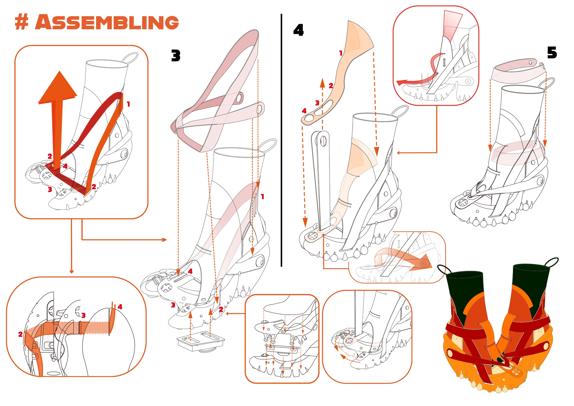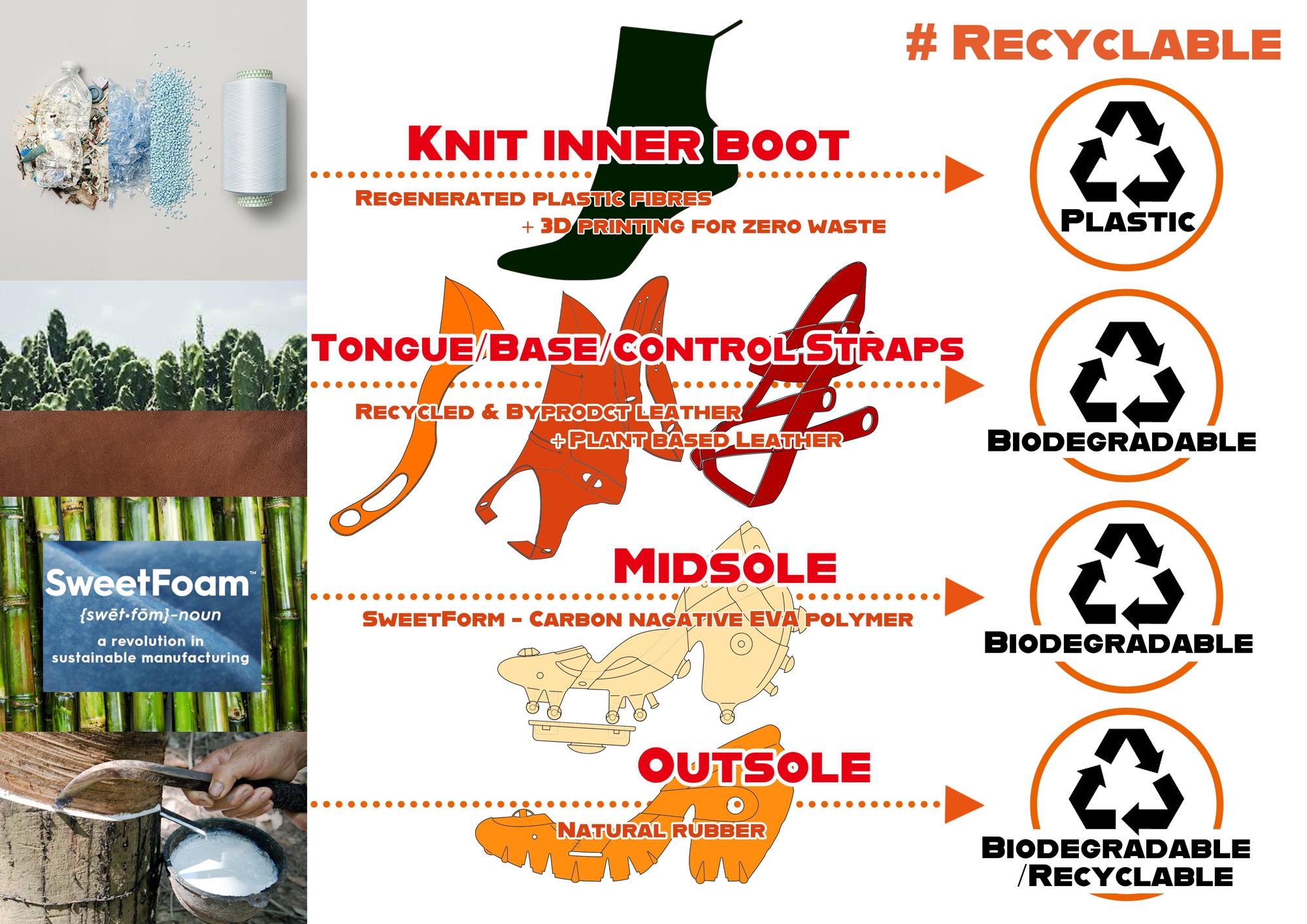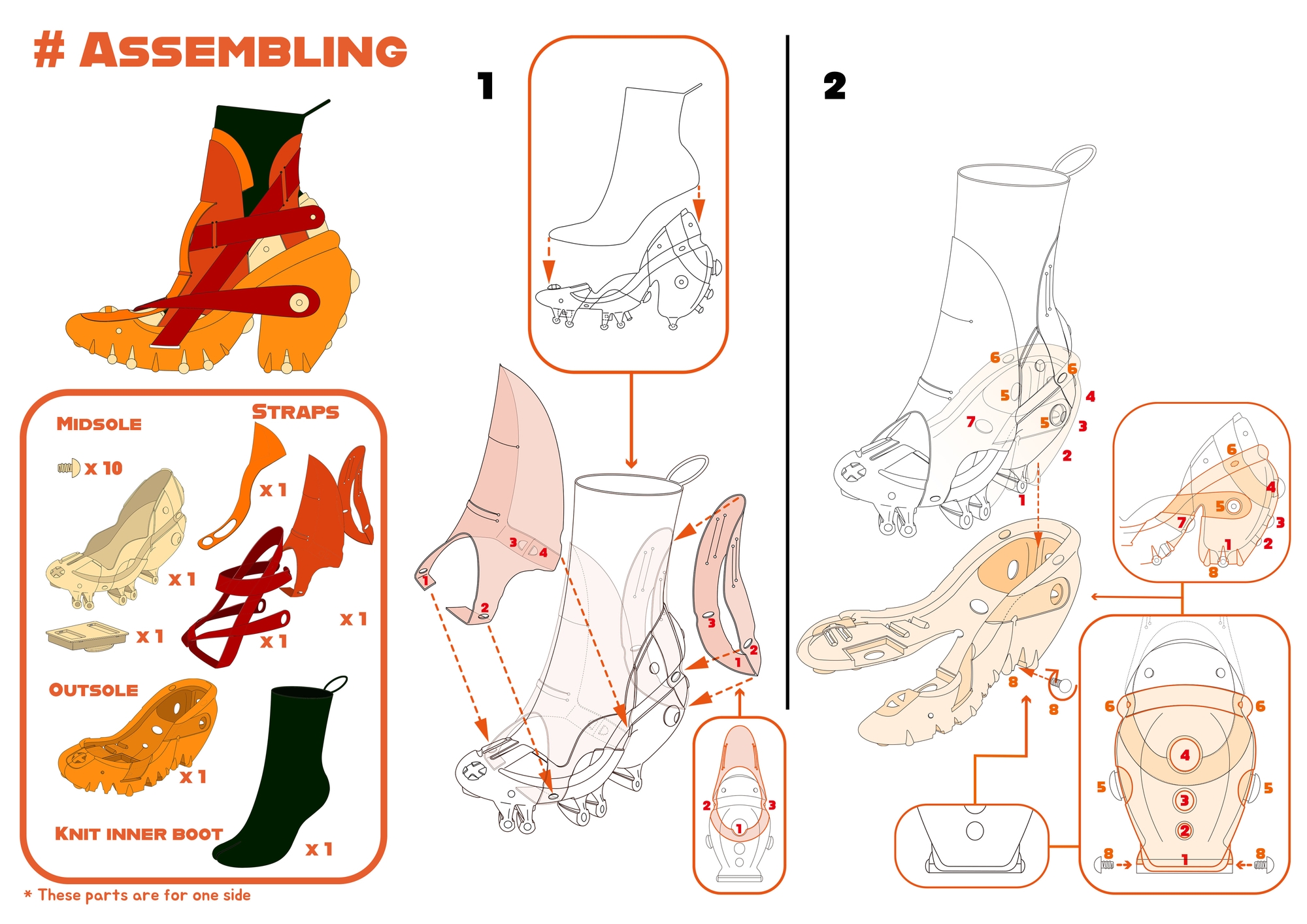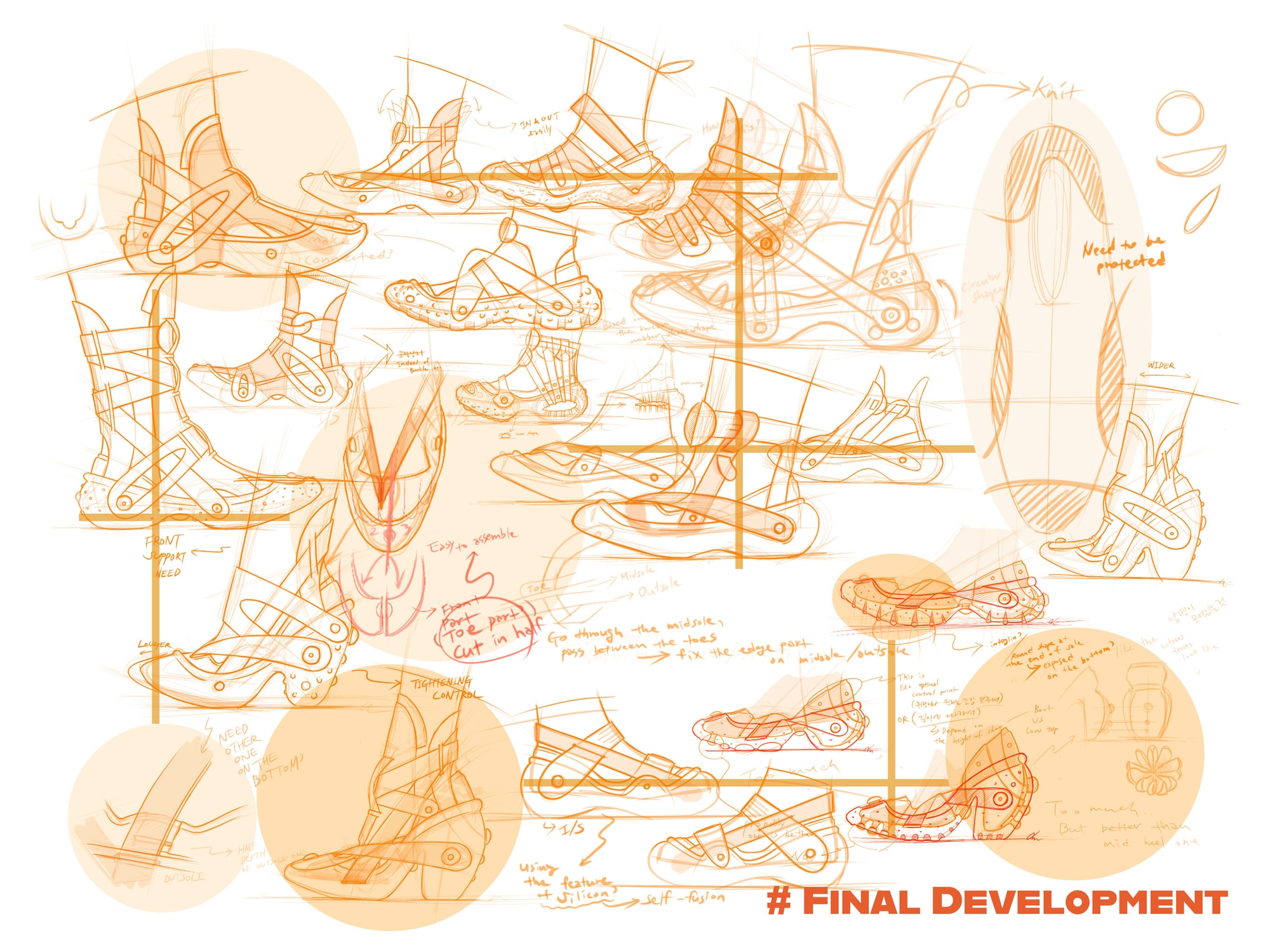 The project was designed to be inspired by the unique structure and repeated circular shapes of the citrus fruits. This high-heel design is a modular shoe that does not require glue use and sewing and can be separated and discharged 100%. Since this shoe does not use glue, it was tried to solve the health deterioration of production workers caused by using glue and change the non-recyclable state that occurs when disposing of them by breaking the mixed form of various materials. In addition, the design was devised as a shoe that can be worn for a long time by paying attention to sustainability
