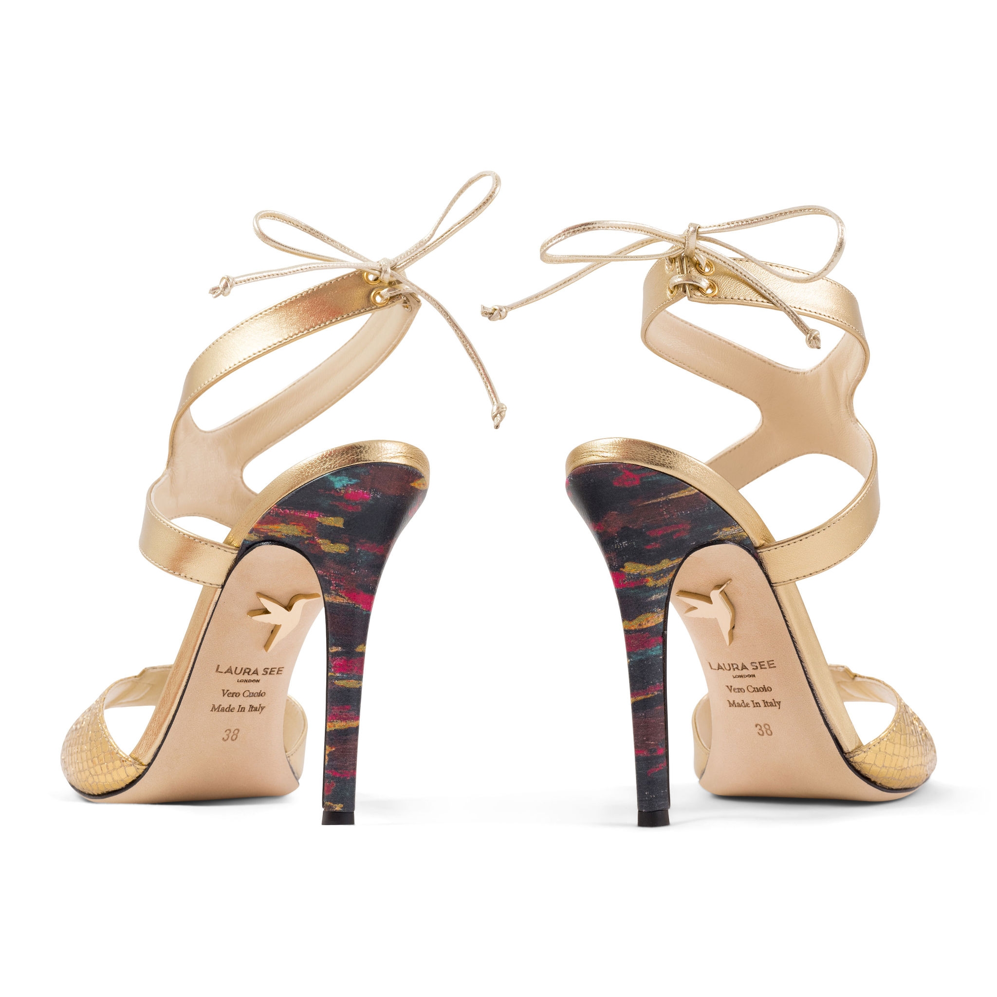 I am a new independent brand and ESMERALDA 105 is from my second small collection of shoes designed by me and hand made in Italy. ESMERALDA is a striking shoe with soft cow leather (from the food chain) and faux snake. My own original artwork is printed onto the leather which adorns the heel, bridging the gap between footwear and art. This style is sleek, creative and made to be worn by positive, fun and fearless women. There is a small gold hummingbird on the sole of every shoe which represent determination, agility and beauty.