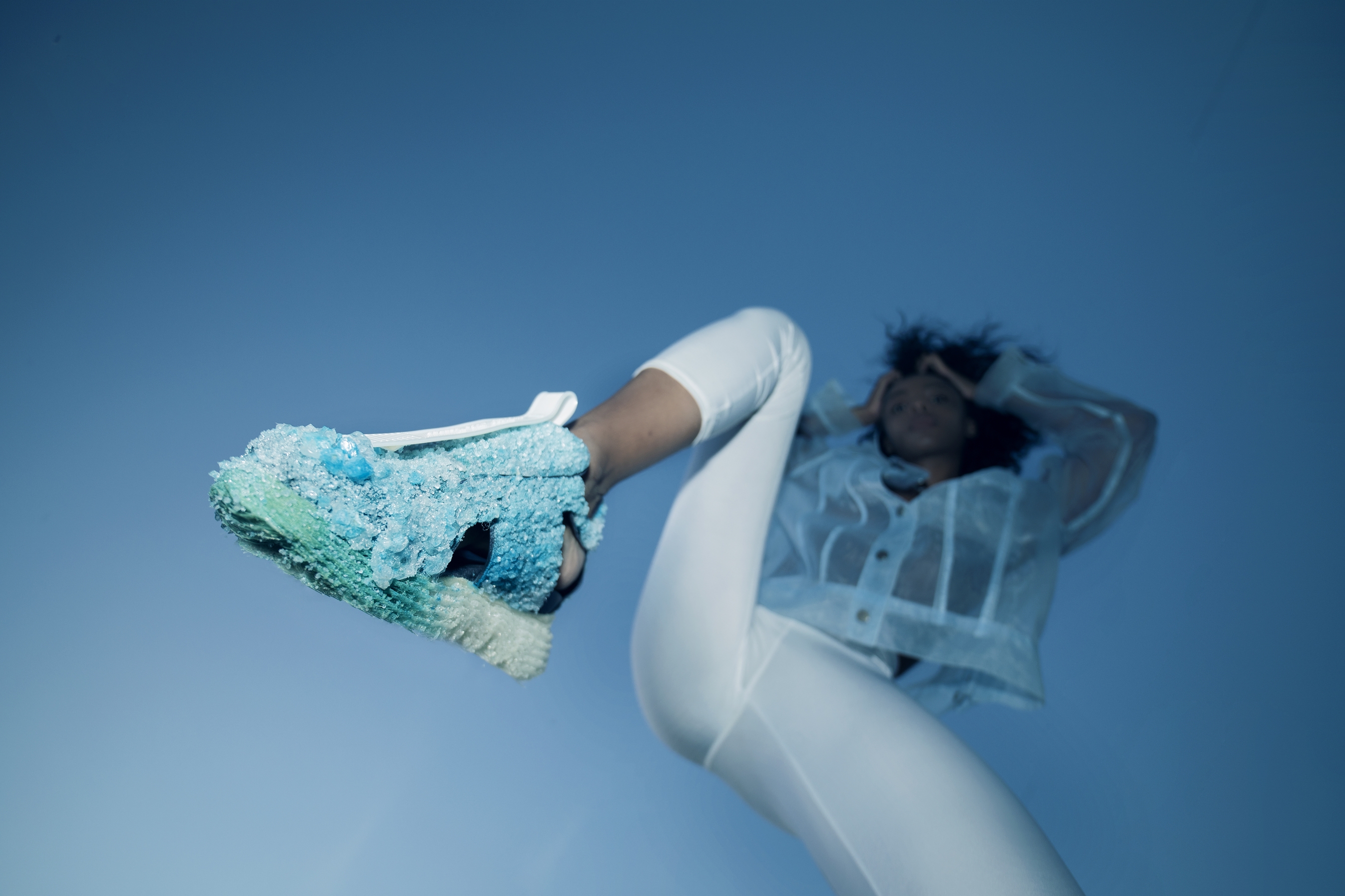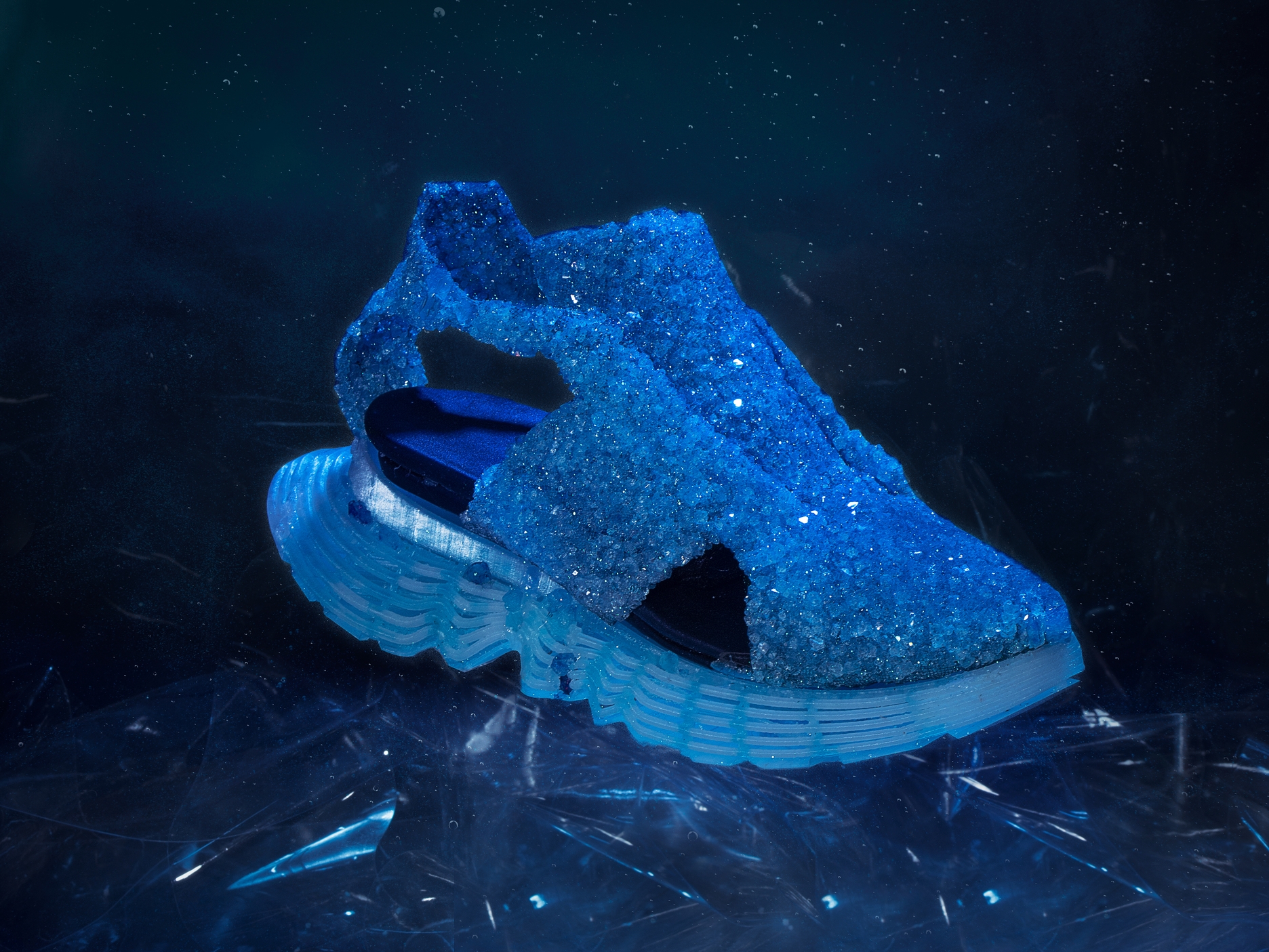 The Shift from Sustainable to Regenerative Design. An eco-futurist sneakers´ capsule collection. The outcome of cross-contamination between digital fabrication, biology and innovation, while creating urban aesthetics focused on responsible, comfortable and stylish mobility. After a year of research and development I present "CrystalWalk". A sneaker that is crystallized directly on the last, without adhesives or consumption of resources, but through over-mineralization that allows natural crystals to grow on the shoe, and you can even renew and personalize the crystal growing into the ocean.