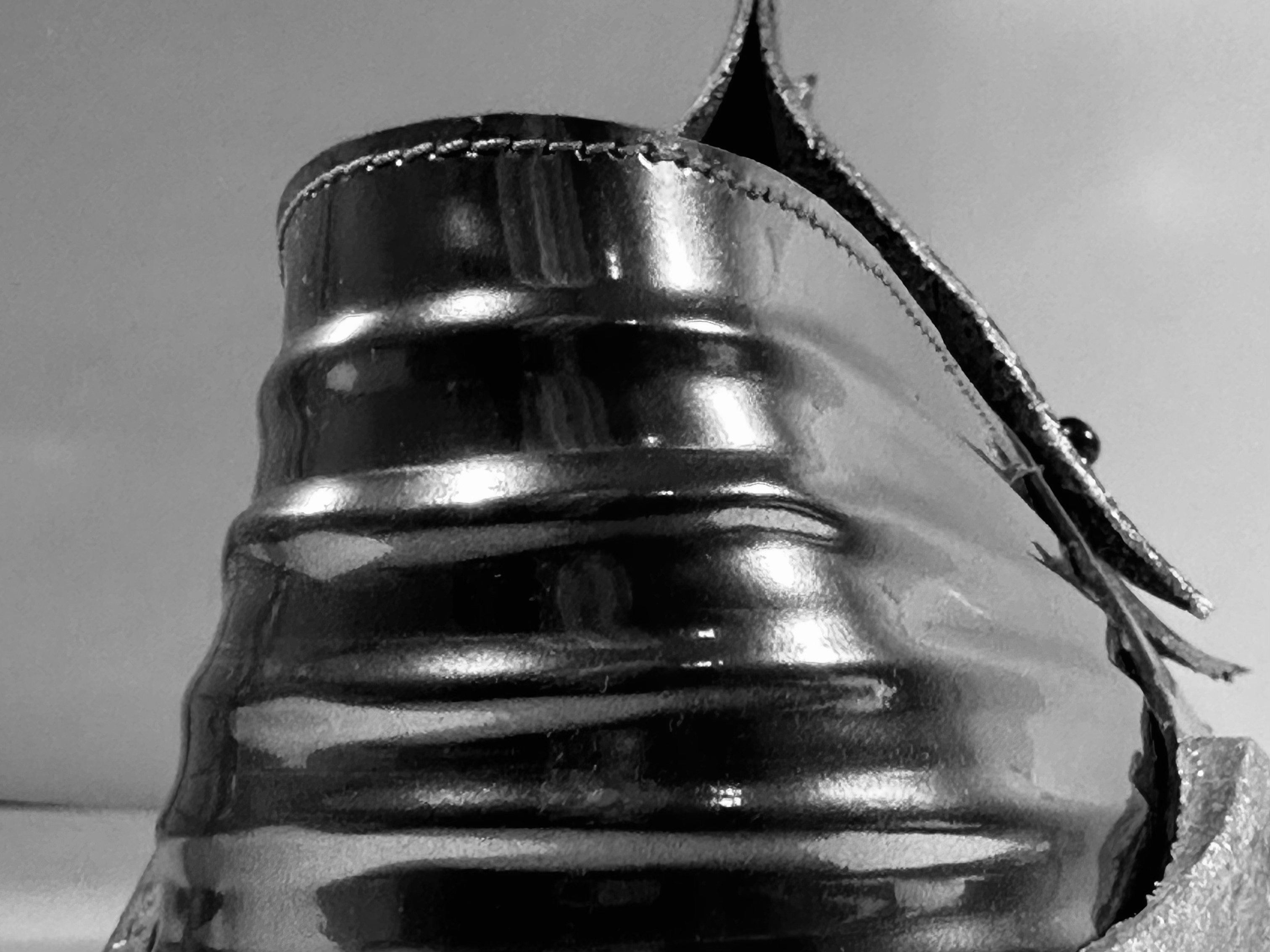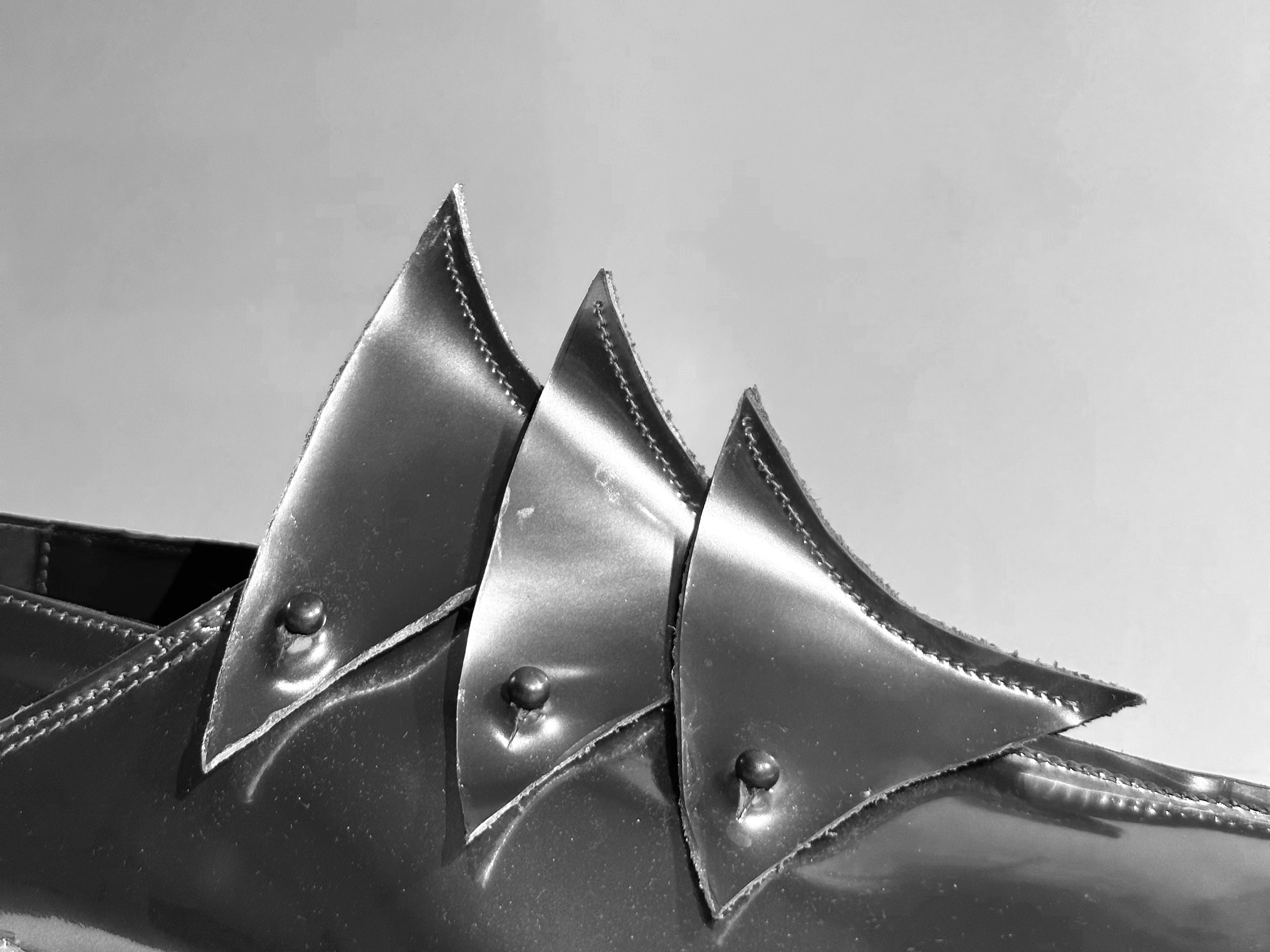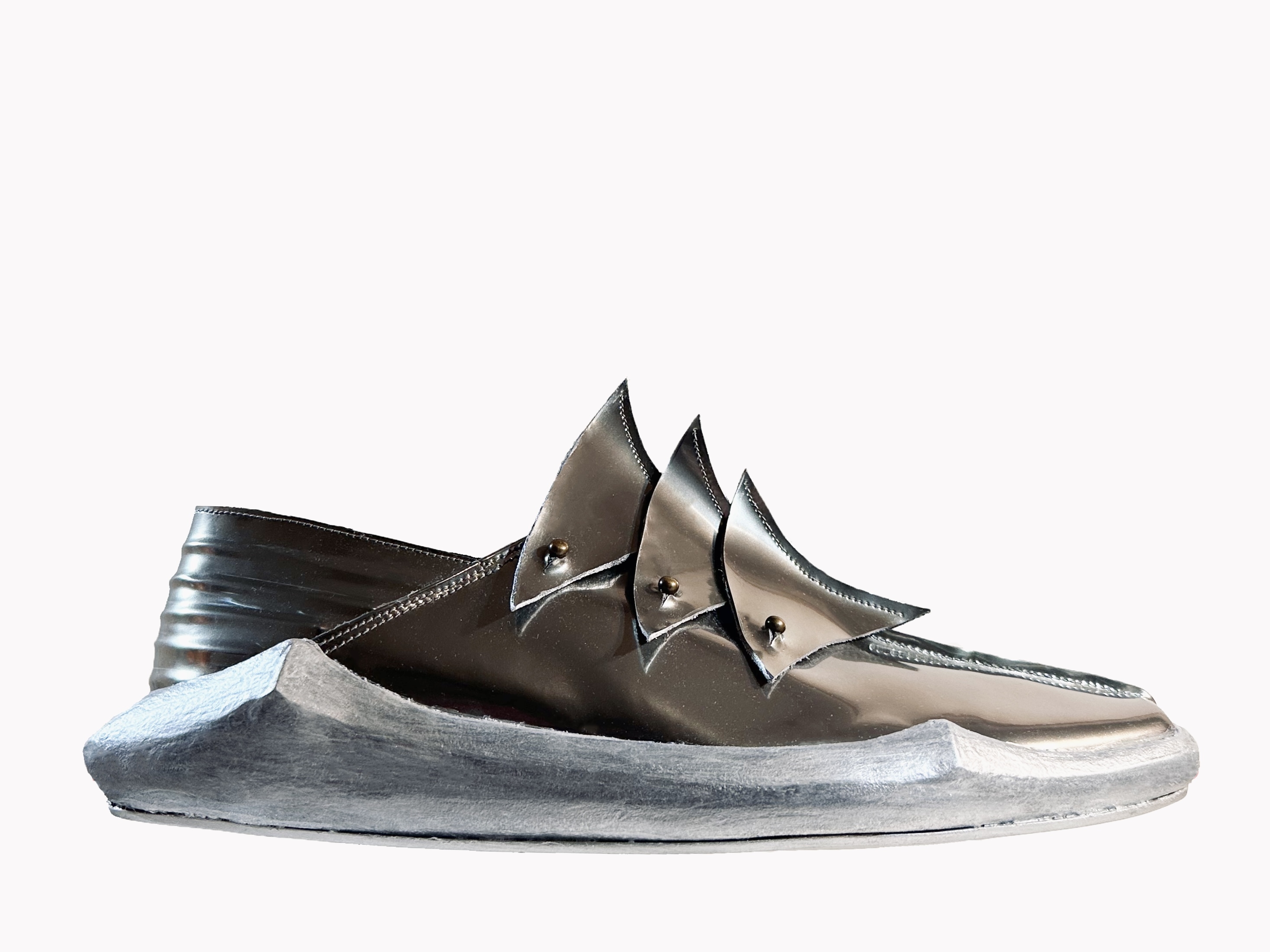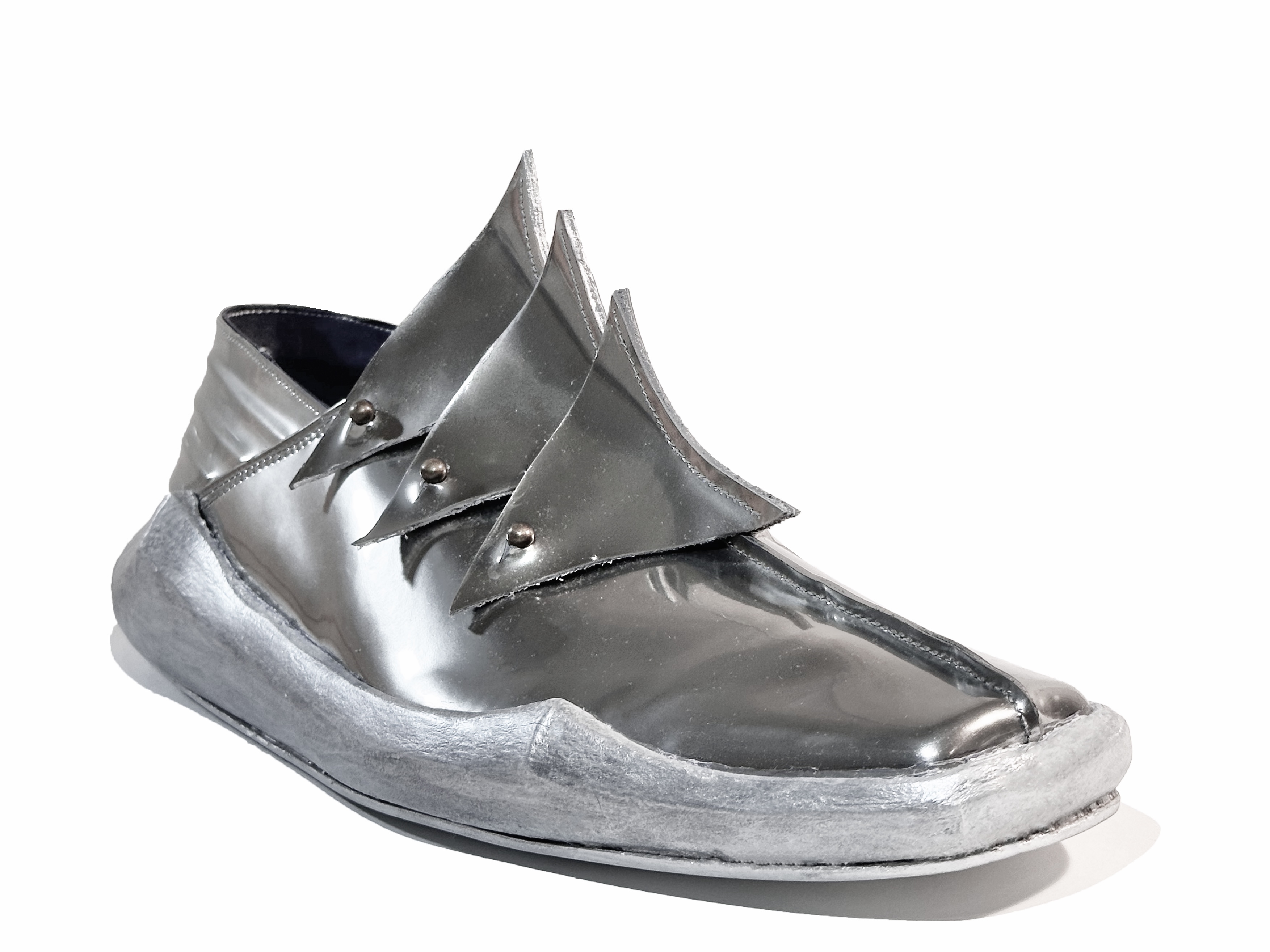 This pair of shoes has sharp lines. High shine Crome Leather looks like metal with a modern design language. Three detachable pieces are also the classic element of armor.