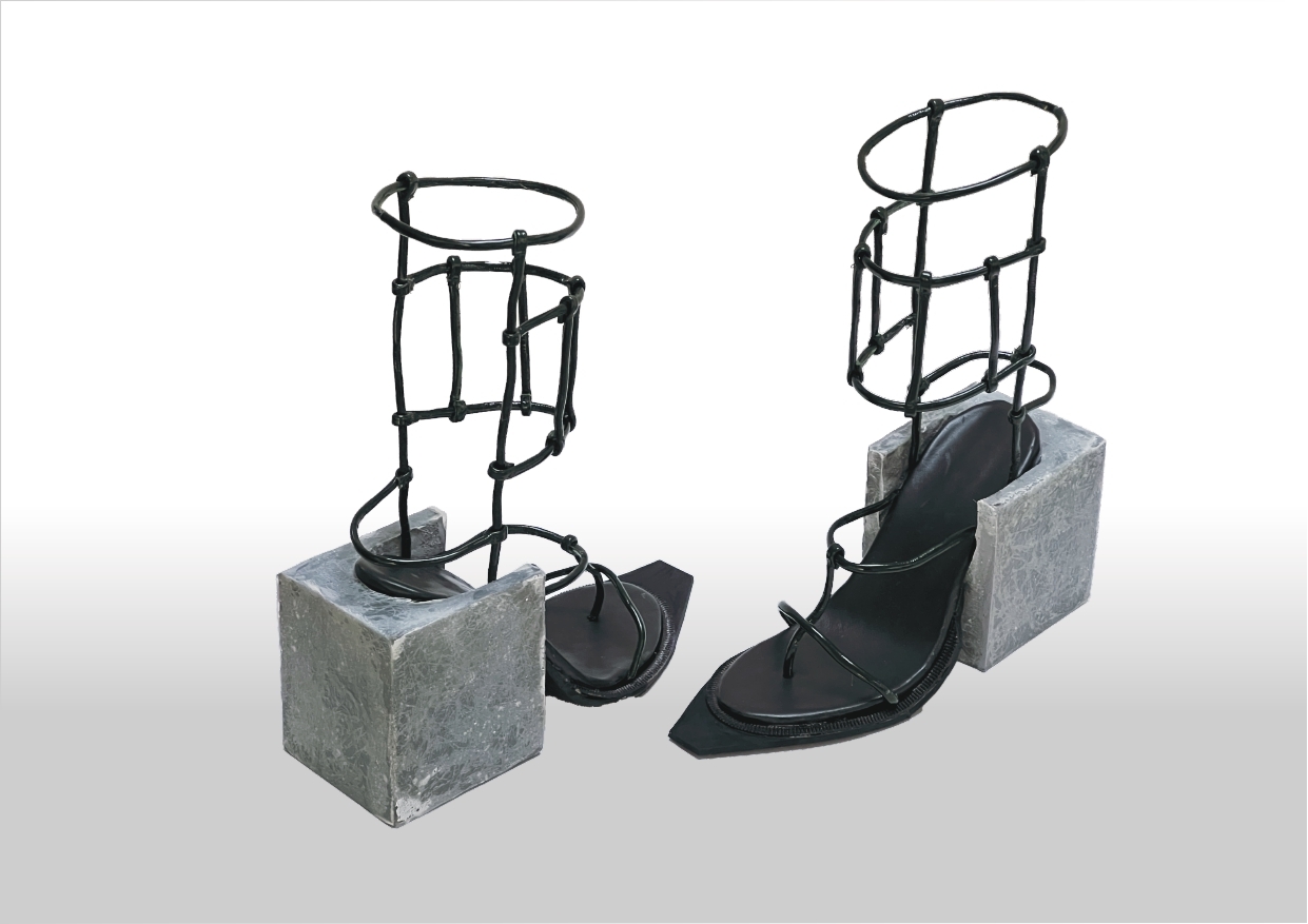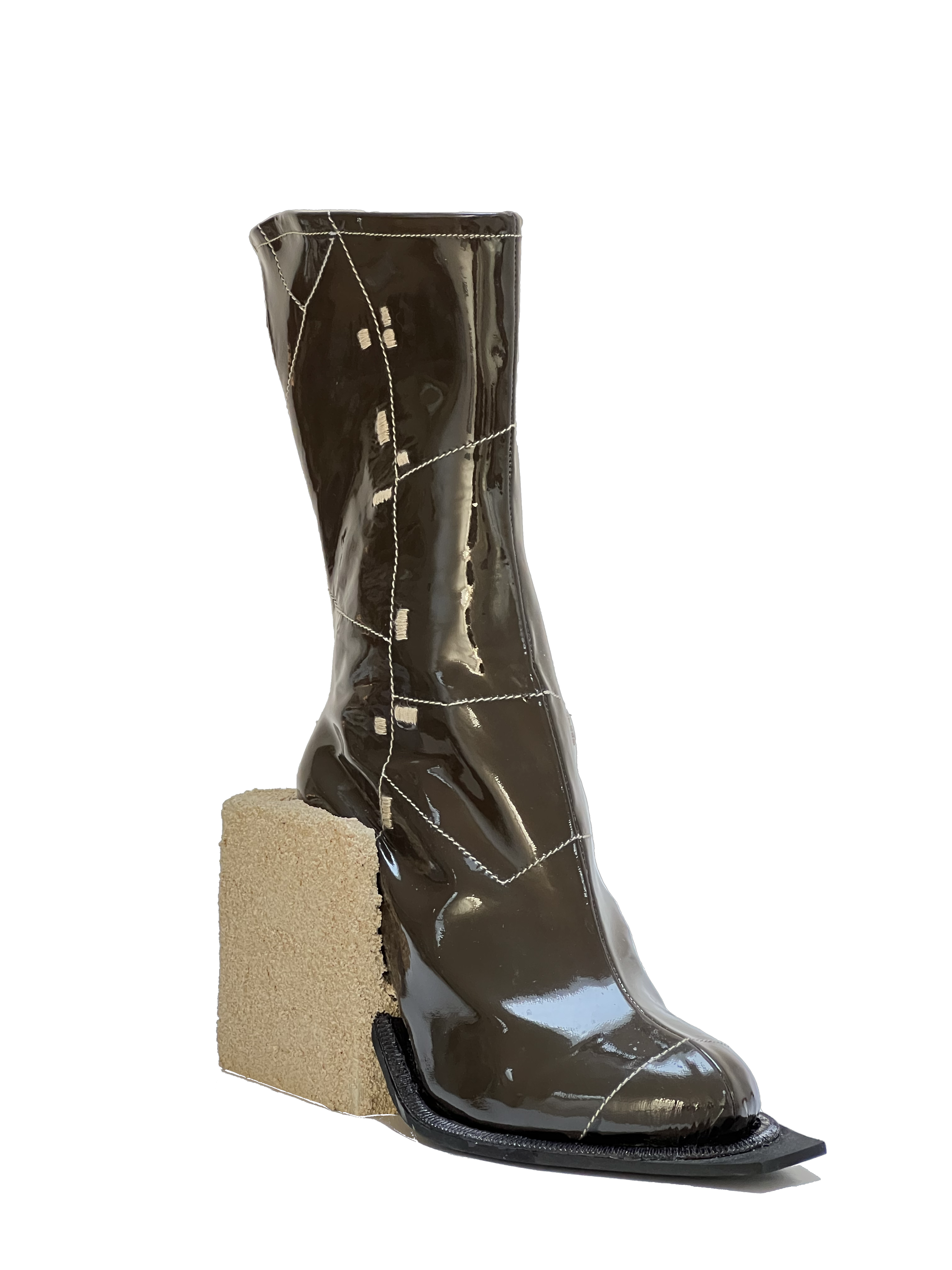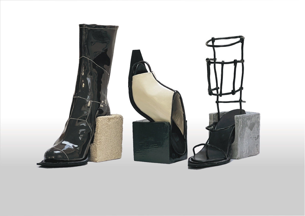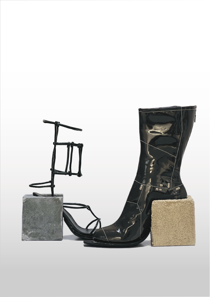 Materials: Patent leather, EVA sole, MDF heels covered in: brick joint material, glass fiber and metal lacquer.