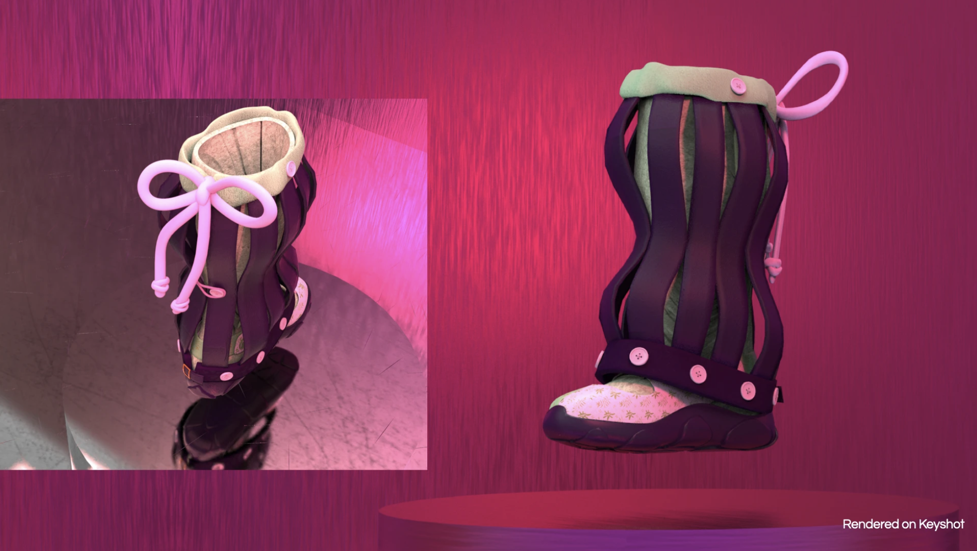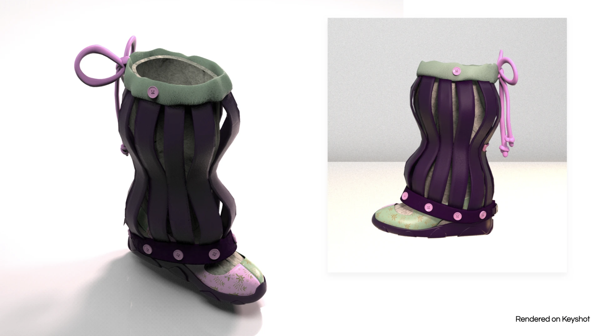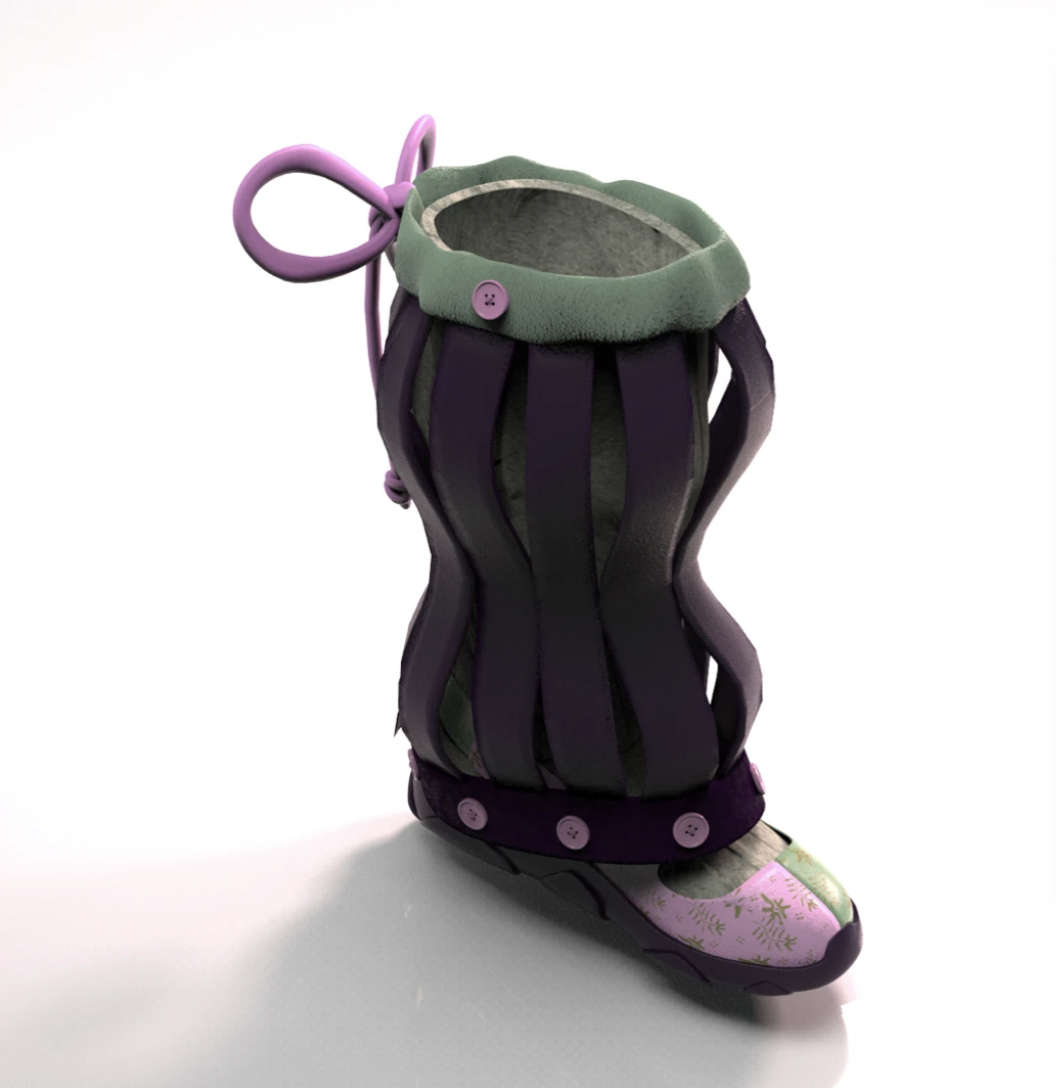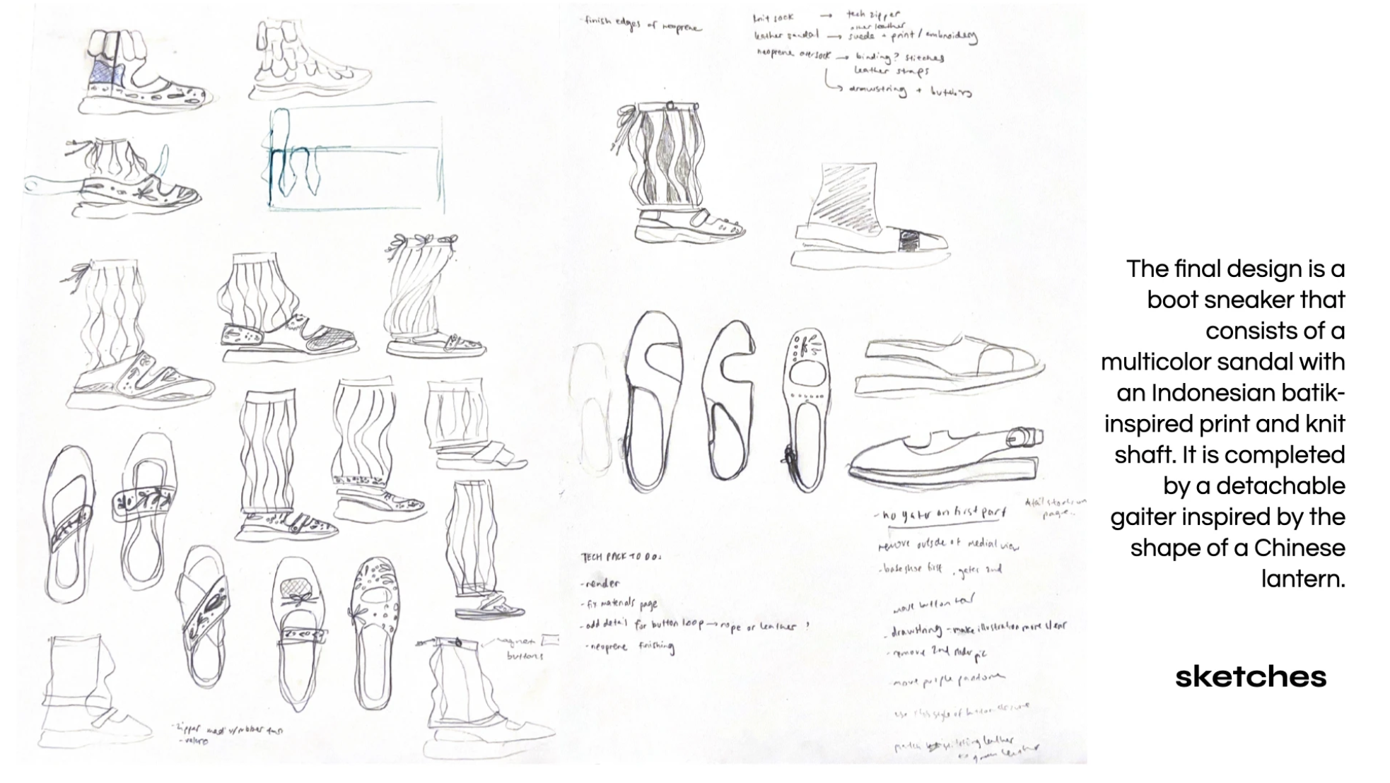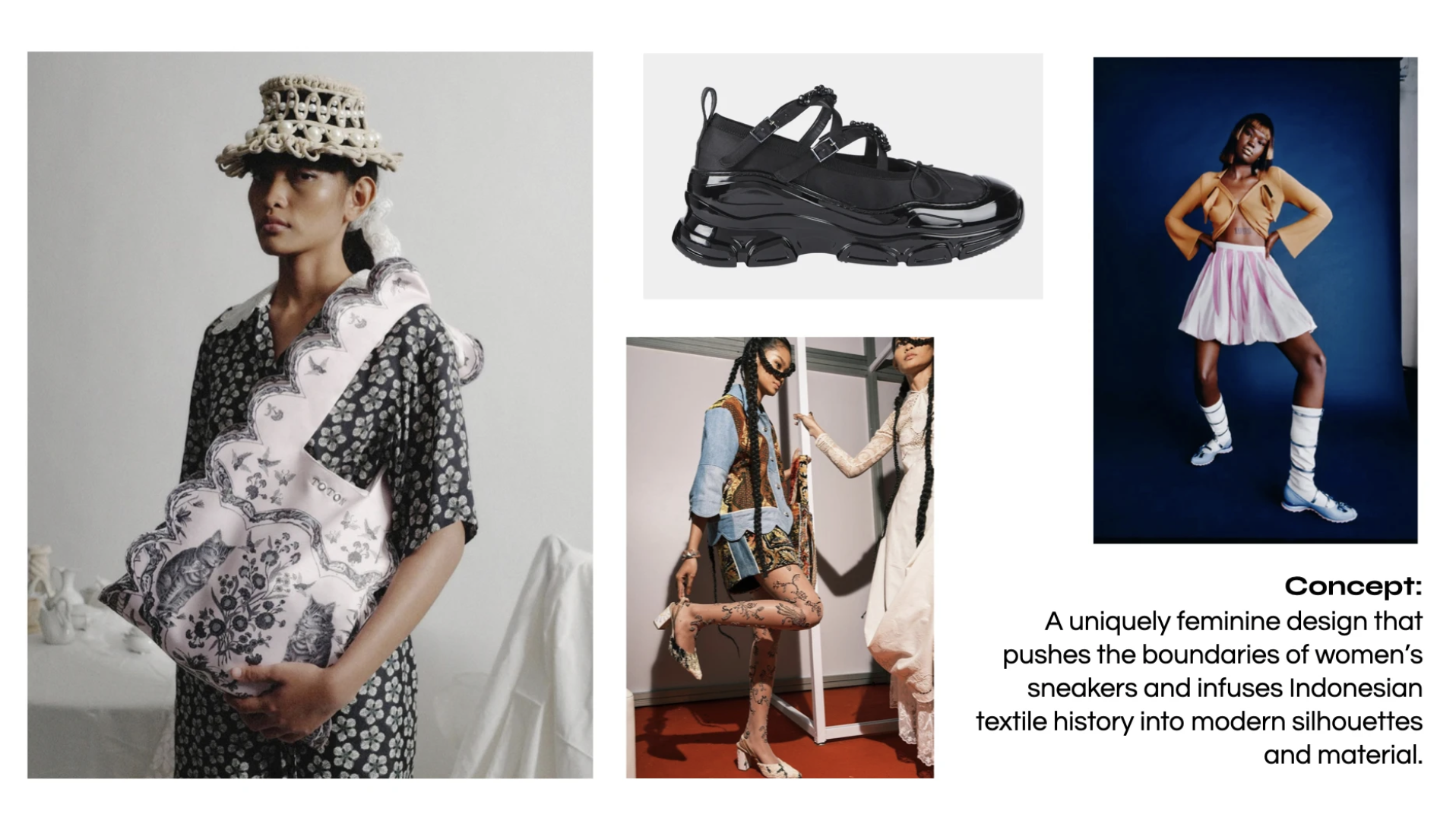 The Bunga Sneaker (Indonesian for flower) is a uniquely feminine design that pushes the boundaries of women's sneakers and infuses Indonesian textile history into modern silhouettes and materials. The shoe consists of a Mary Jane and knee-high sock hybrid and a detachable decorative shaft, inspired by the construction of a paper lantern.