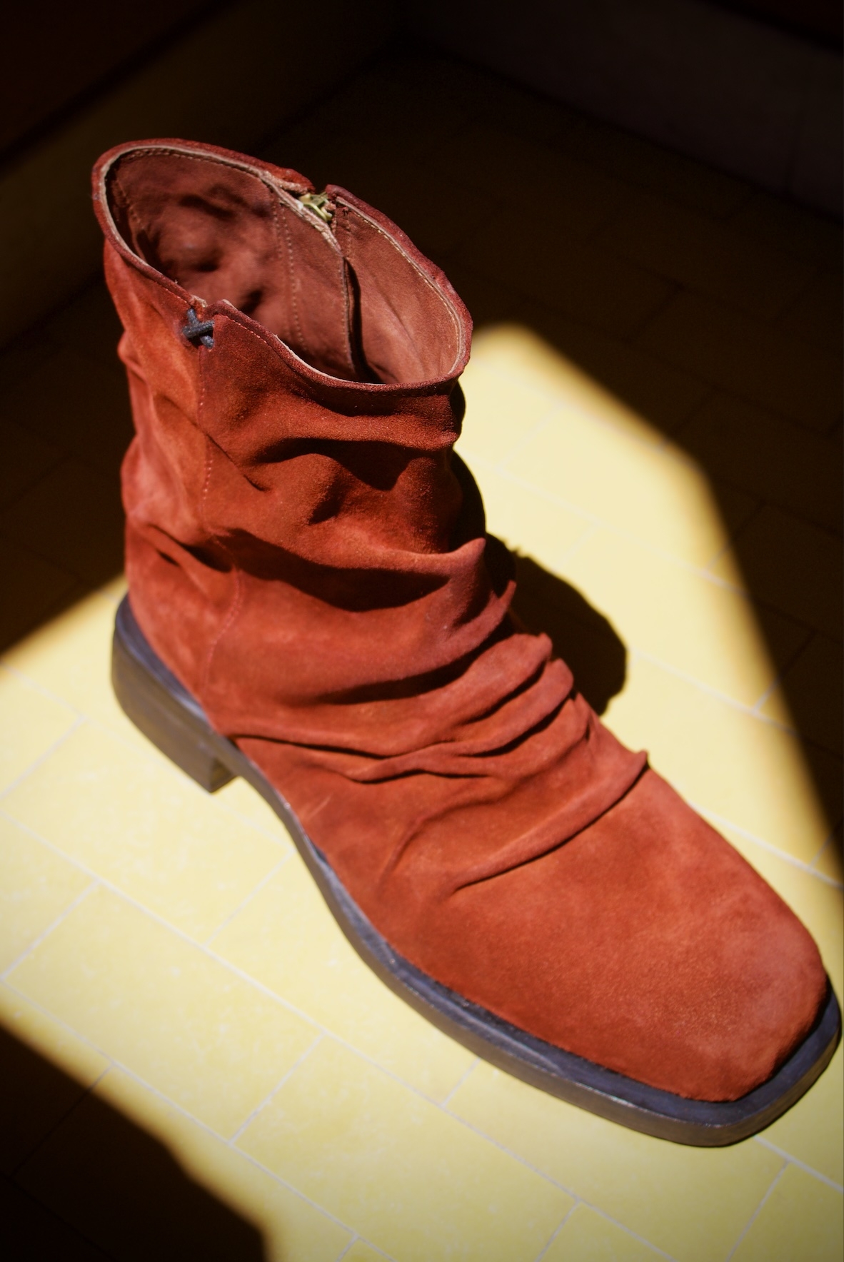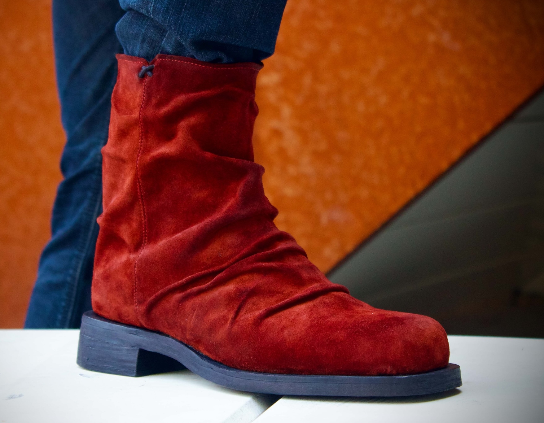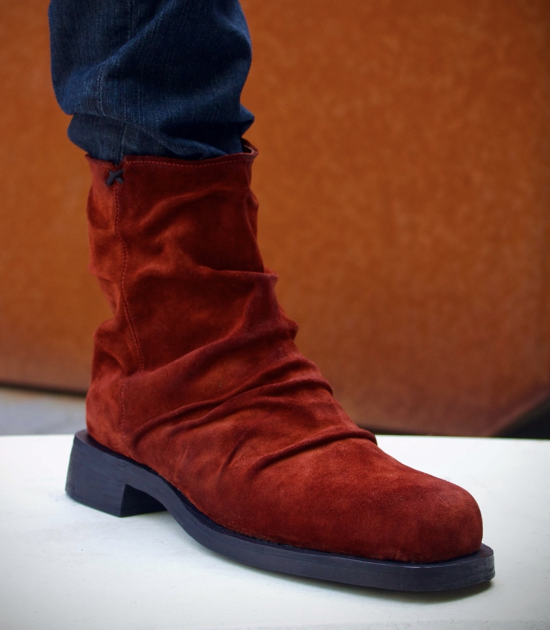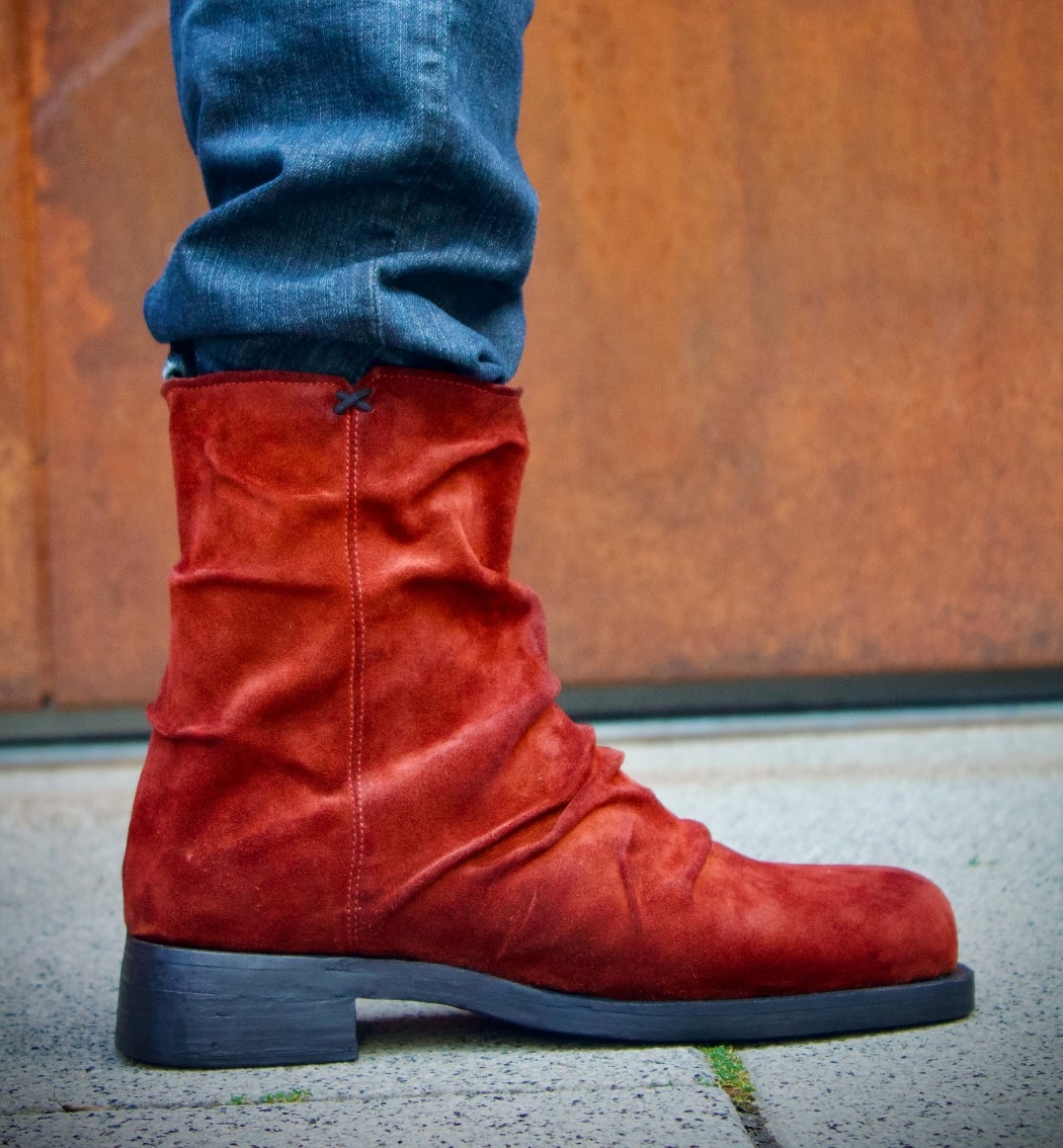 A premium design made with an extreme attention to detail. Each pair is its own due to the artisanal folds that are hand placed on each shoe. This boot gives off a vintage aesthetic and is bold with rock’n’roll attitude. Made with a fine Italian suede upper and leather lining, as well as, a handmade stacked leather outsole. This boot is intended for those who want to make a statement.