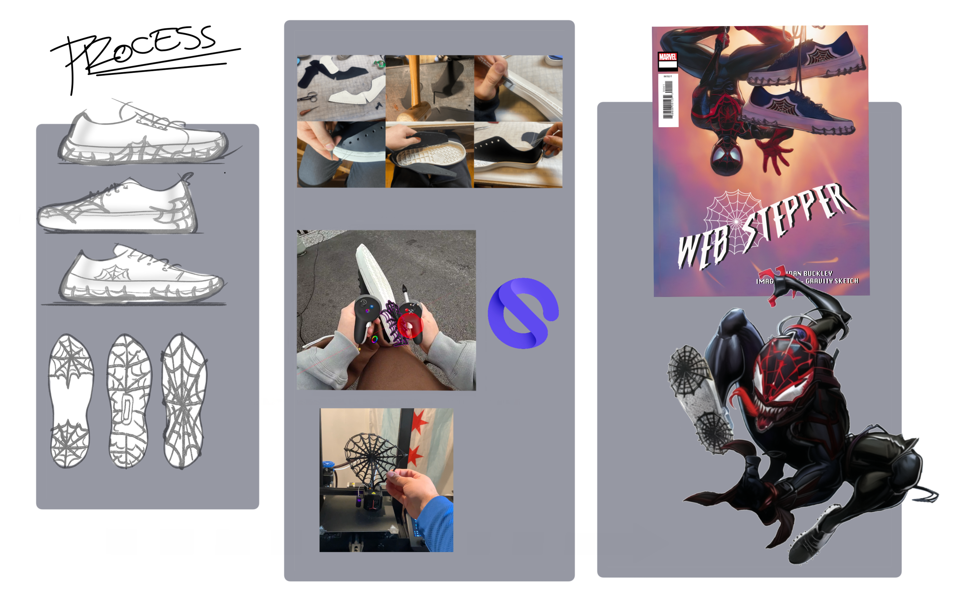 The "Web Stepper" sneakers merge comic book storytelling with innovative footwear design. Mixing traditional sneaker construction, AR technology, and 3D printing, this project transforms footwear into a narrative medium. Inspired by the world of Miles Morales (Spider-Man), the Web Steppers depict an encounter with a symbiote in the Spider-Verse.