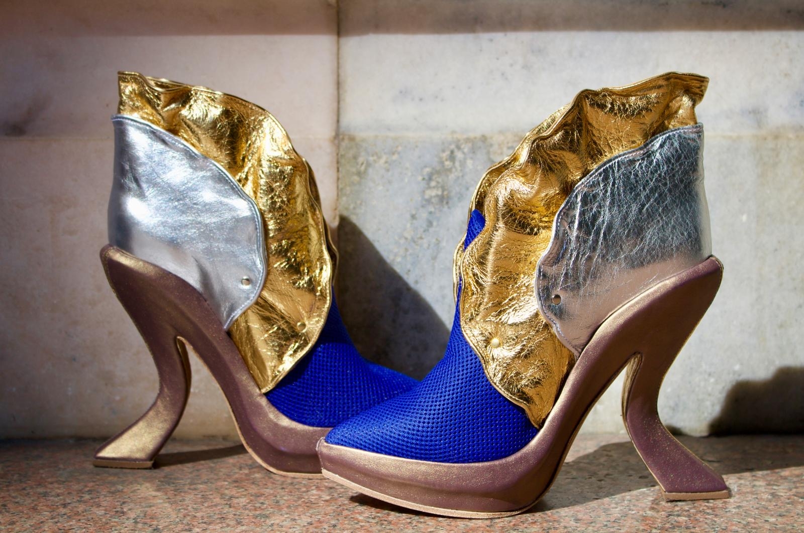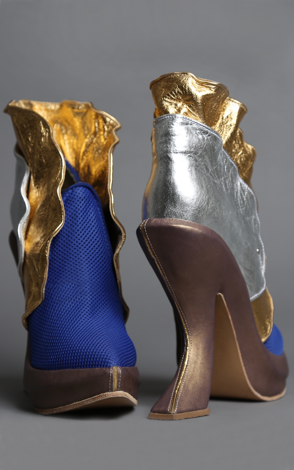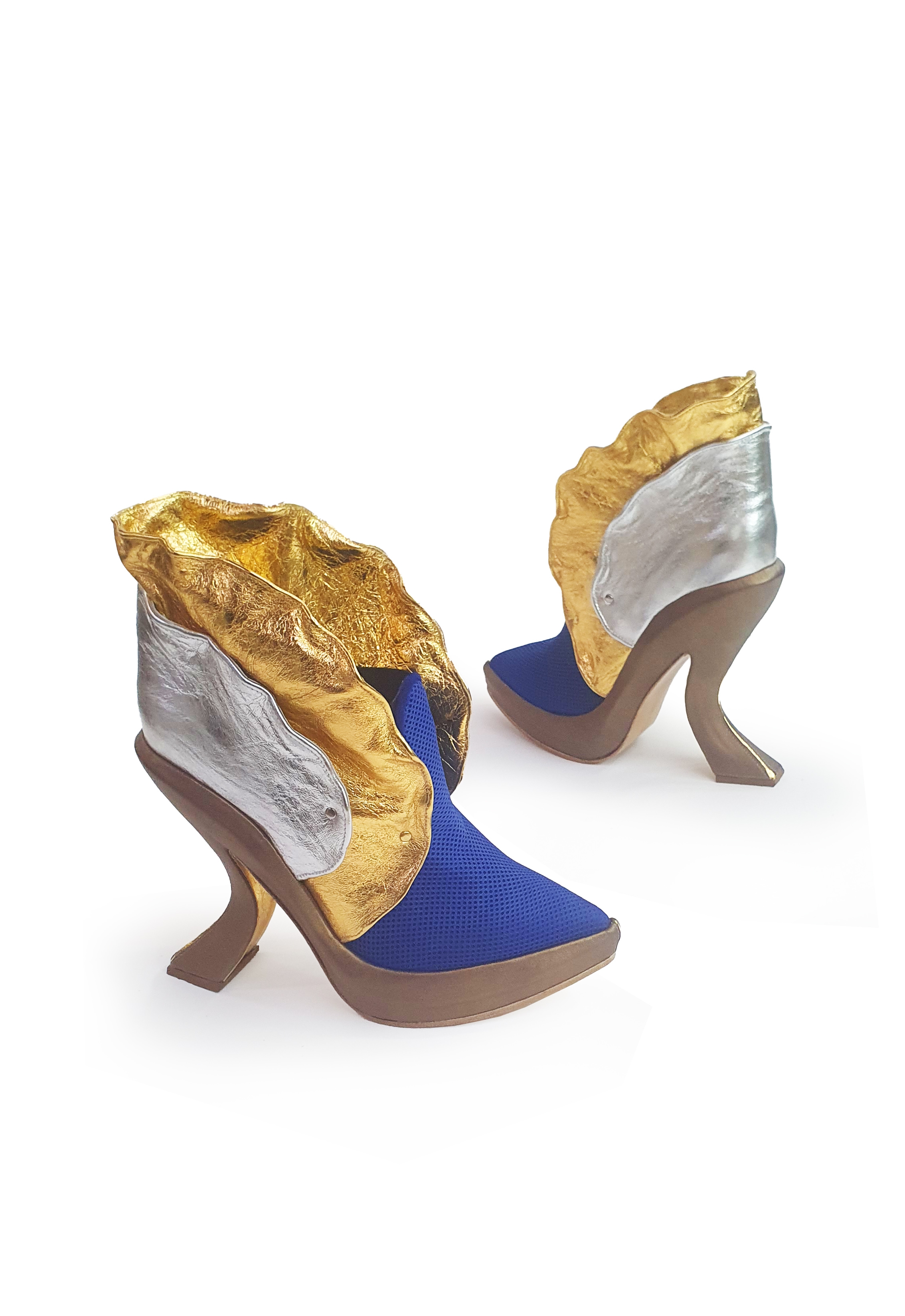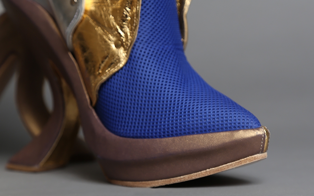 This boot was inspired by Thrya, Queen of Denmark who was known as the “strength” or “salvation” of Denmark. Clad in traditional Danish colors, the vamp is a modern royal blue mesh ensconced with silver/gold leather quarters. “Chelsea boot” upper has matching gold and silver rivet hardware in a cup sole platform. The boot is accentuated with its carbon fiber heel wrapped in leather curved heel and toe piping. Together, the elements of gold and silver with the commanding power of a sturdy heel and a slight lift embody regal strength and confidence that I hope is transfers to the wearer.