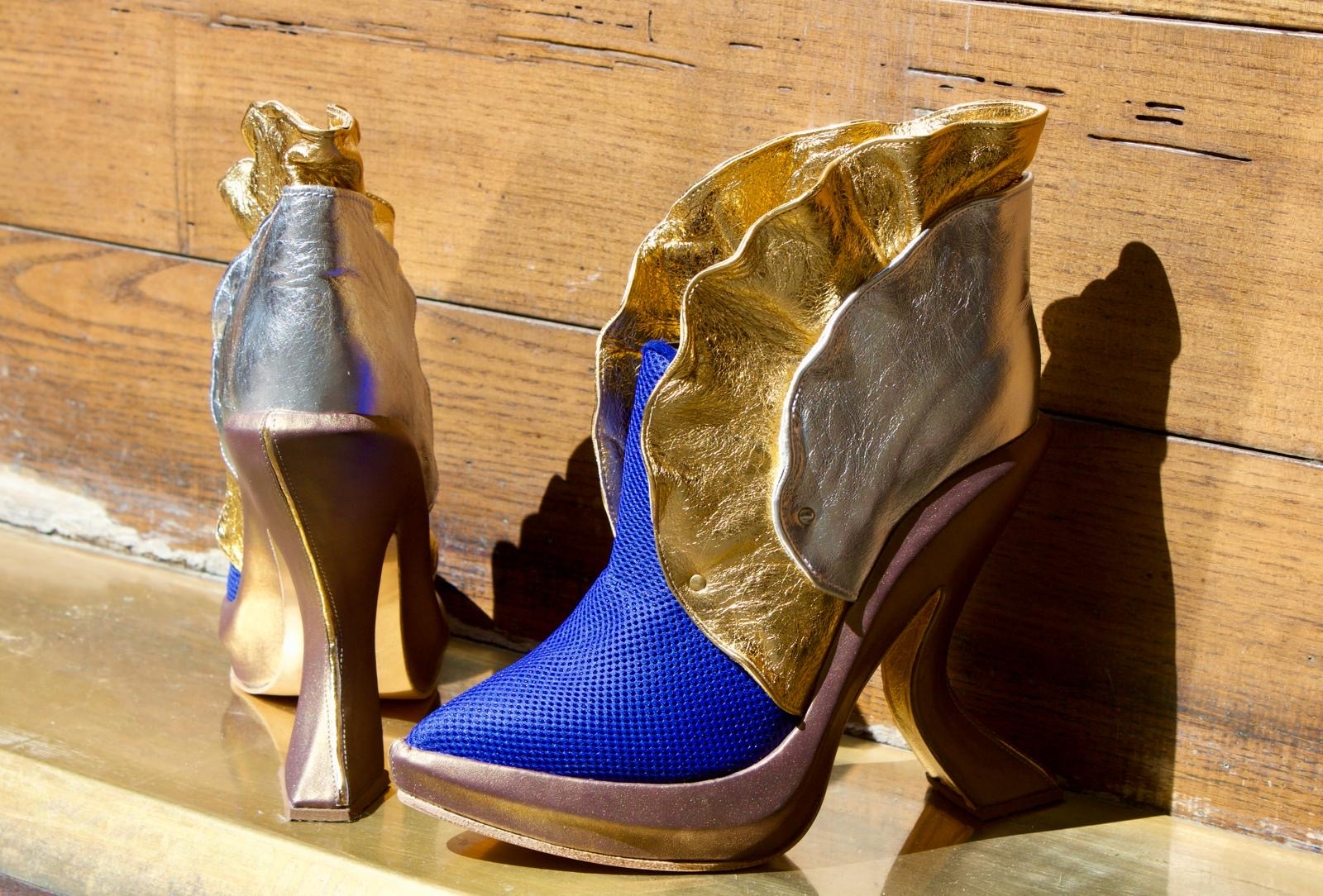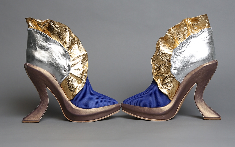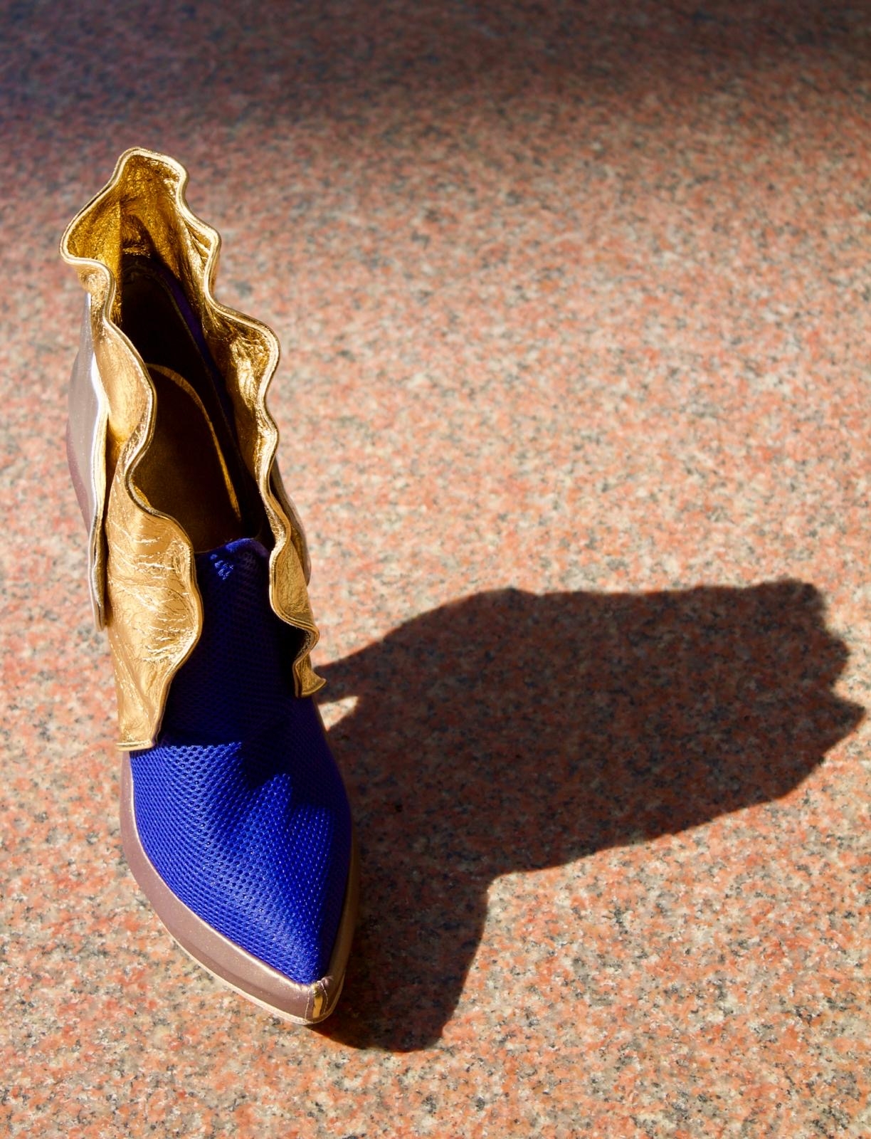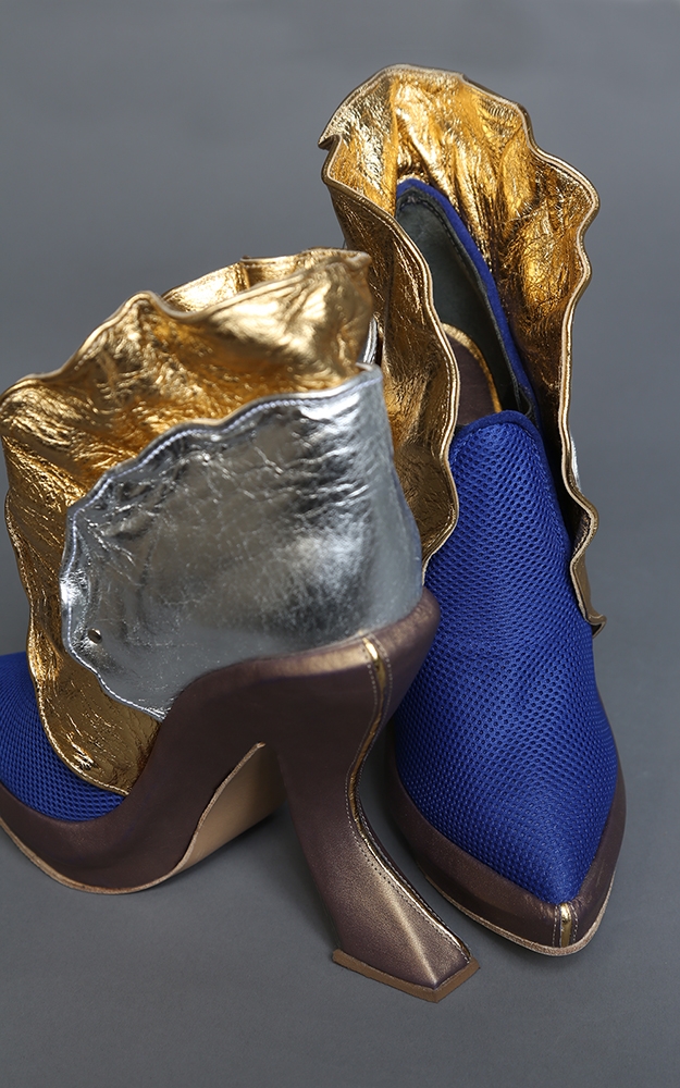 This boot was inspired by Thrya, Queen of Denmark who was known as the “strength” or “salvation” of Denmark. Clad in traditional Danish colors, the vamp is a modern royal blue mesh ensconced with silver/gold leather quarters. “Chelsea boot” upper has matching gold and silver rivet hardware in a cup sole platform. The boot is accentuated with its carbon fiber heel wrapped in leather curved heel and toe piping. Together, the elements of gold and silver with the commanding power of a sturdy heel and a slight lift embody regal strength and confidence that I hope is transfers to the wearer.