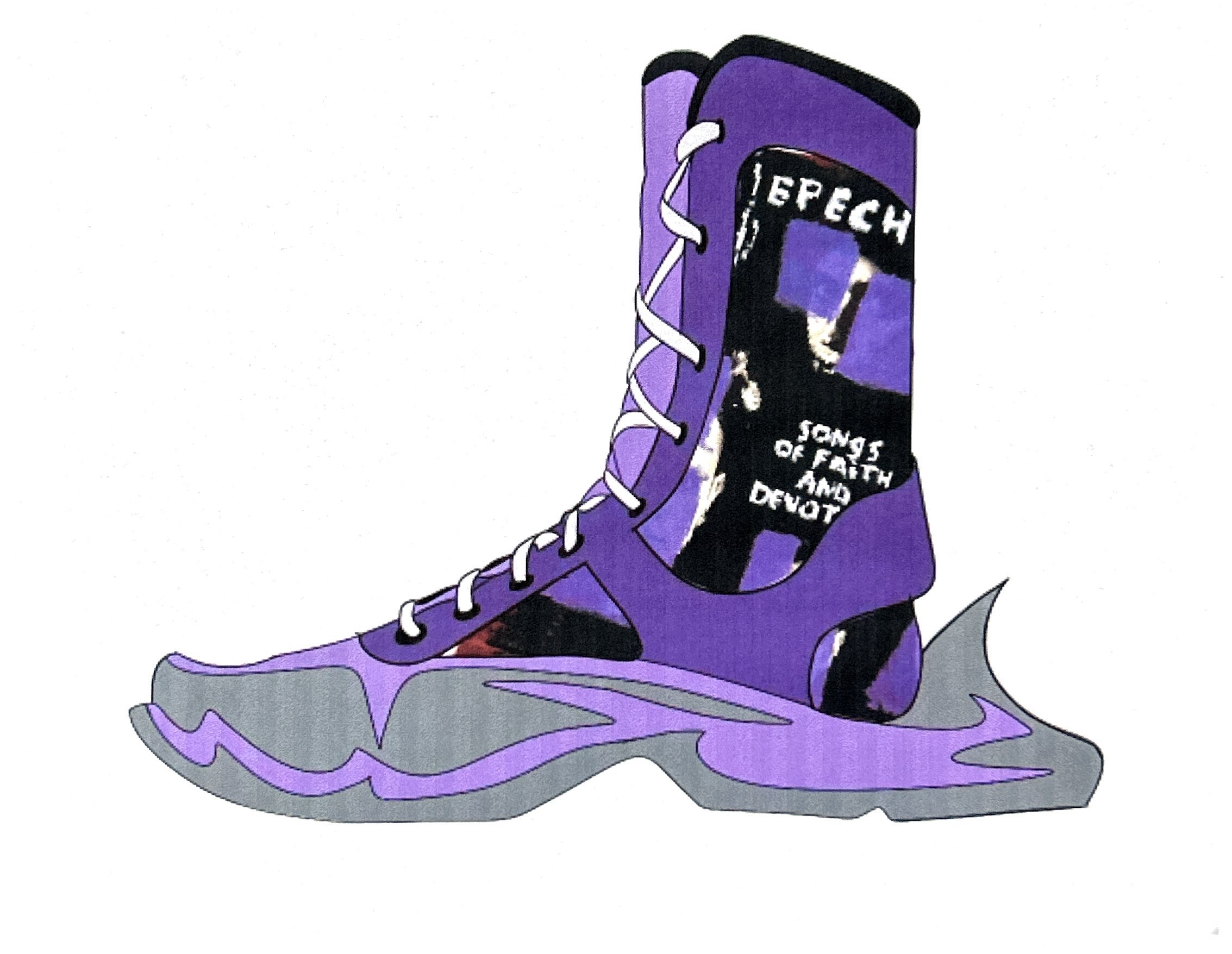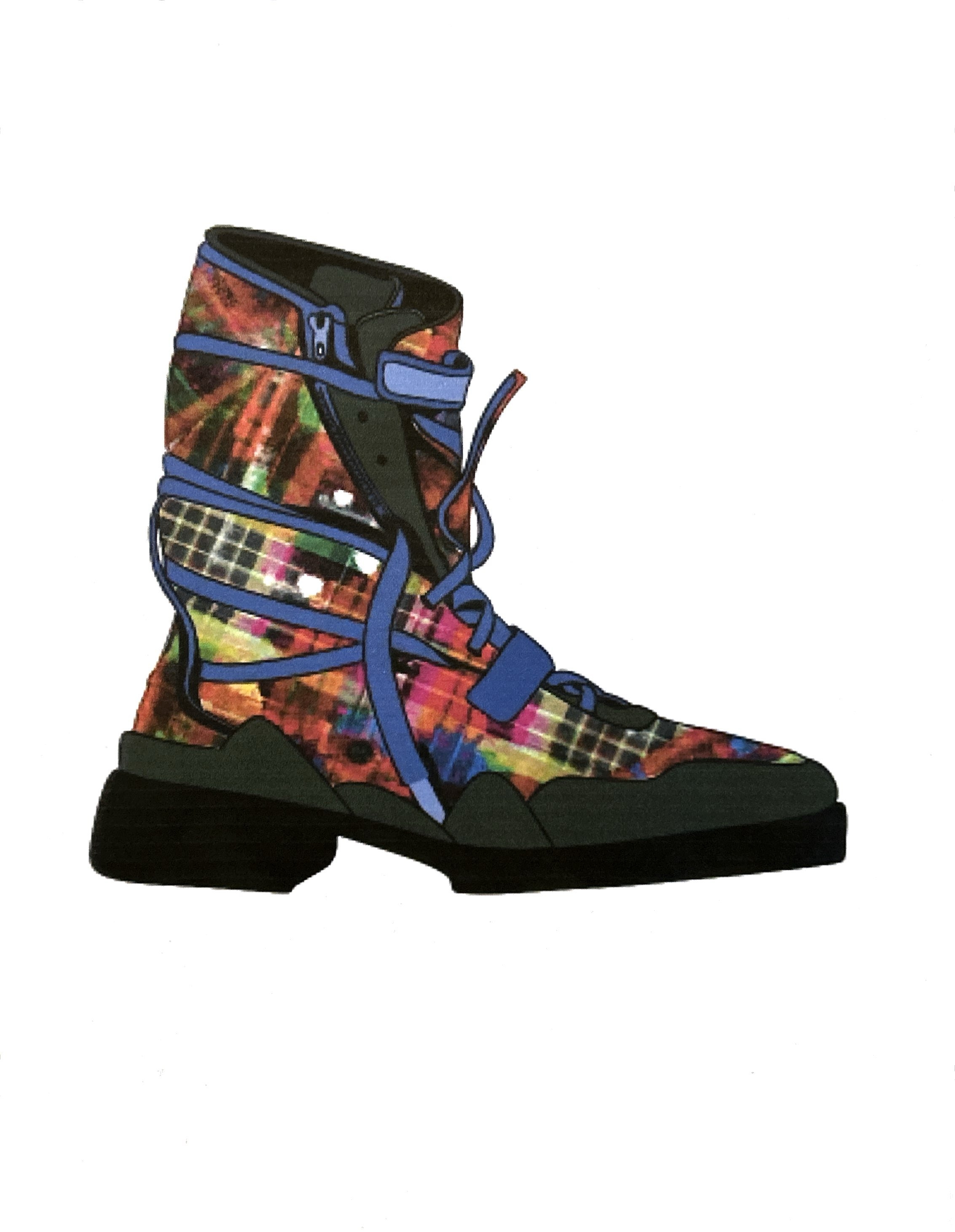 I created a footwear collection to complement a collection from JCRT, a brand I respect because of their emphasis on telling a story with fashion. Taking inspiration from a variety of subcultural sources, JCRT founders say, "Each collection of shirts and trousers reimagines the possibilities of plaid, with proprietary patterns that remix an array of references and inspirations, from military camos and iconic book jackets to classic horror movies and post-punk album covers."