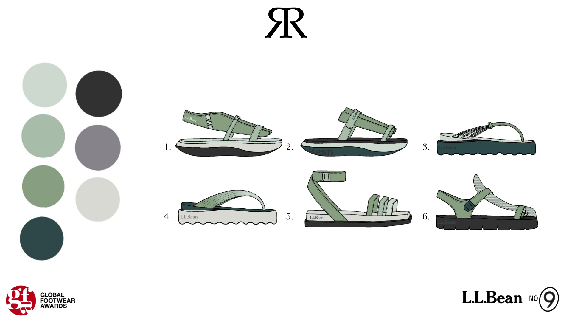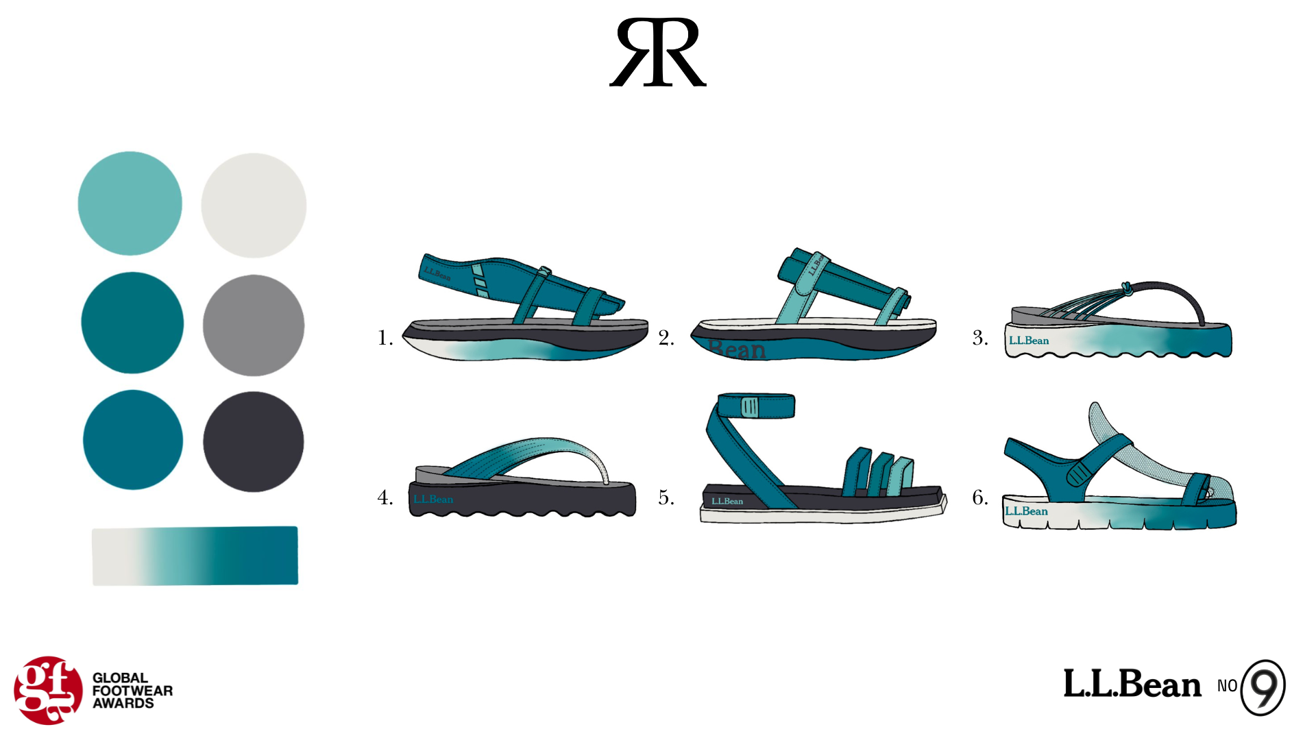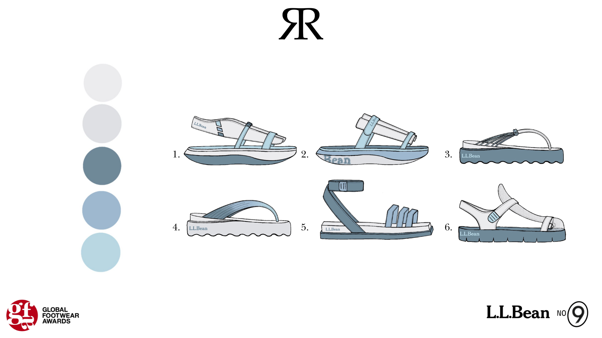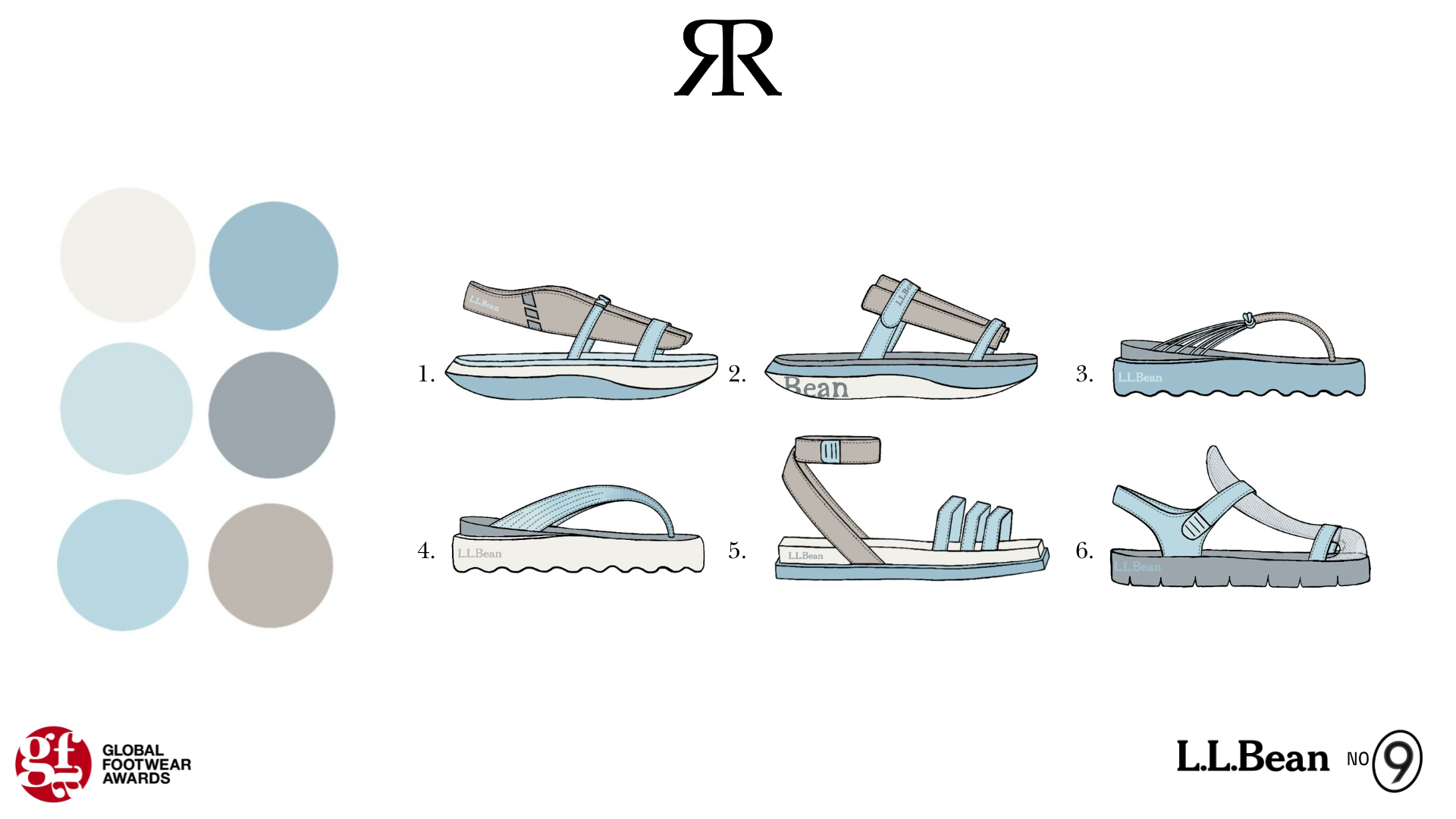 Assortment of concept sandal designs for the brand L.L. Bean. These designs were based on products that L.L. Bean sells on their website. The goal of the design was to create functional shoes that can be worn to the beach and also into town.