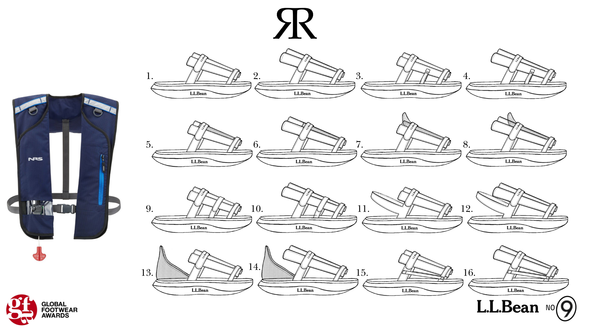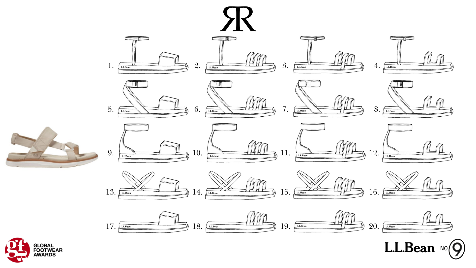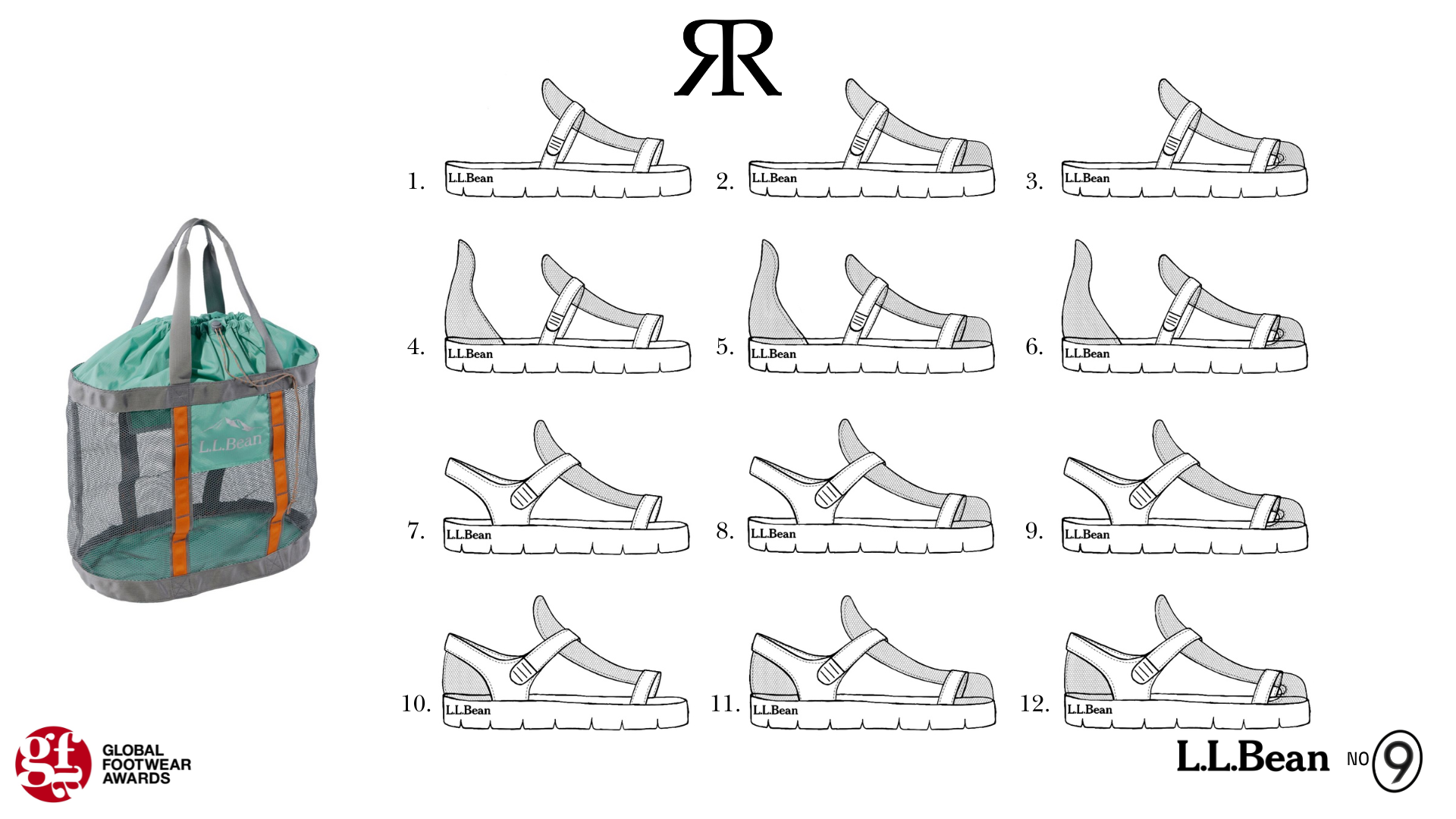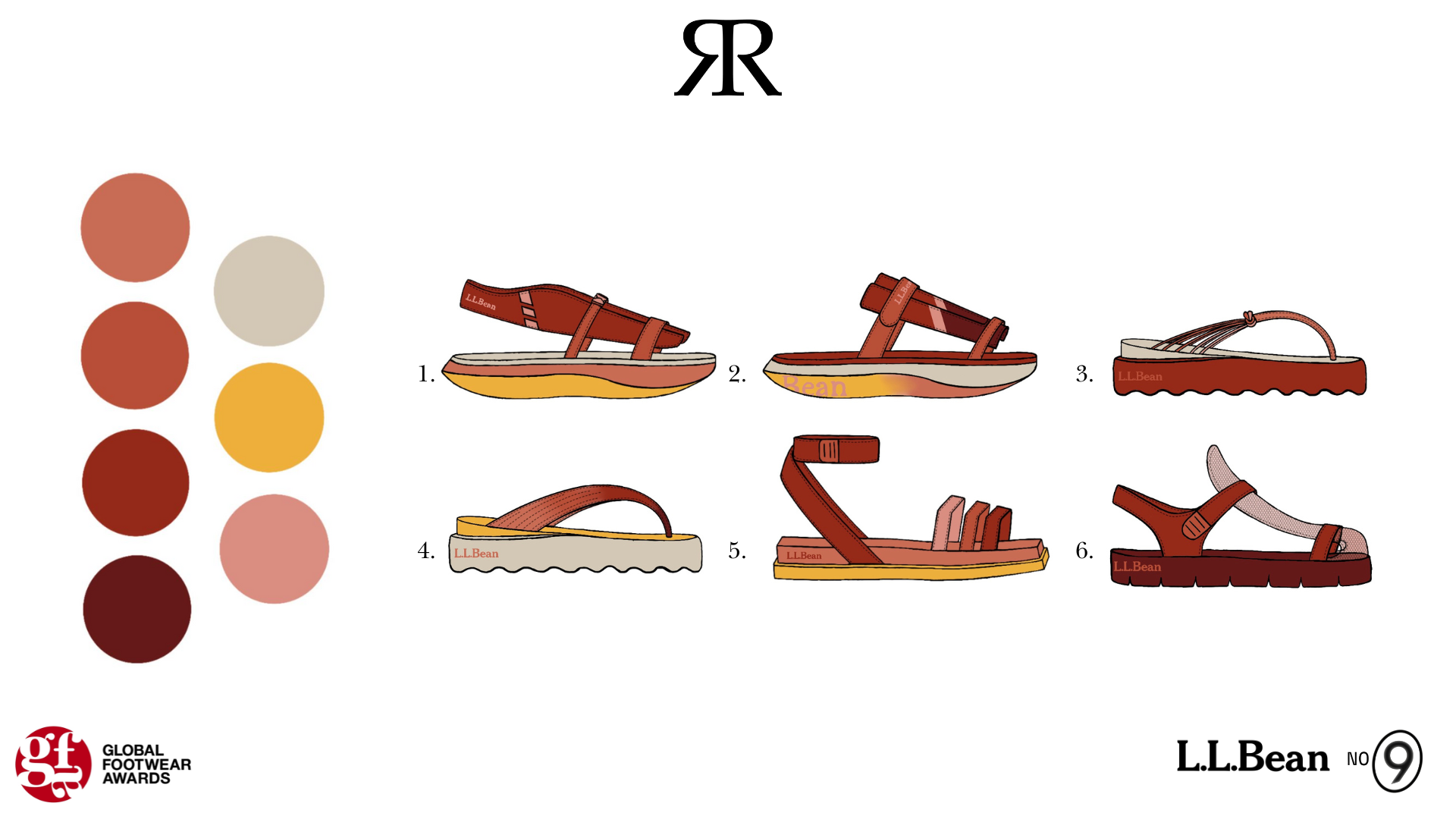 Assortment of concept sandal designs for the brand L.L. Bean. These designs were based on products that L.L. Bean sells on their website. The goal of the design was to create functional shoes that can be worn to the beach and also into town.
