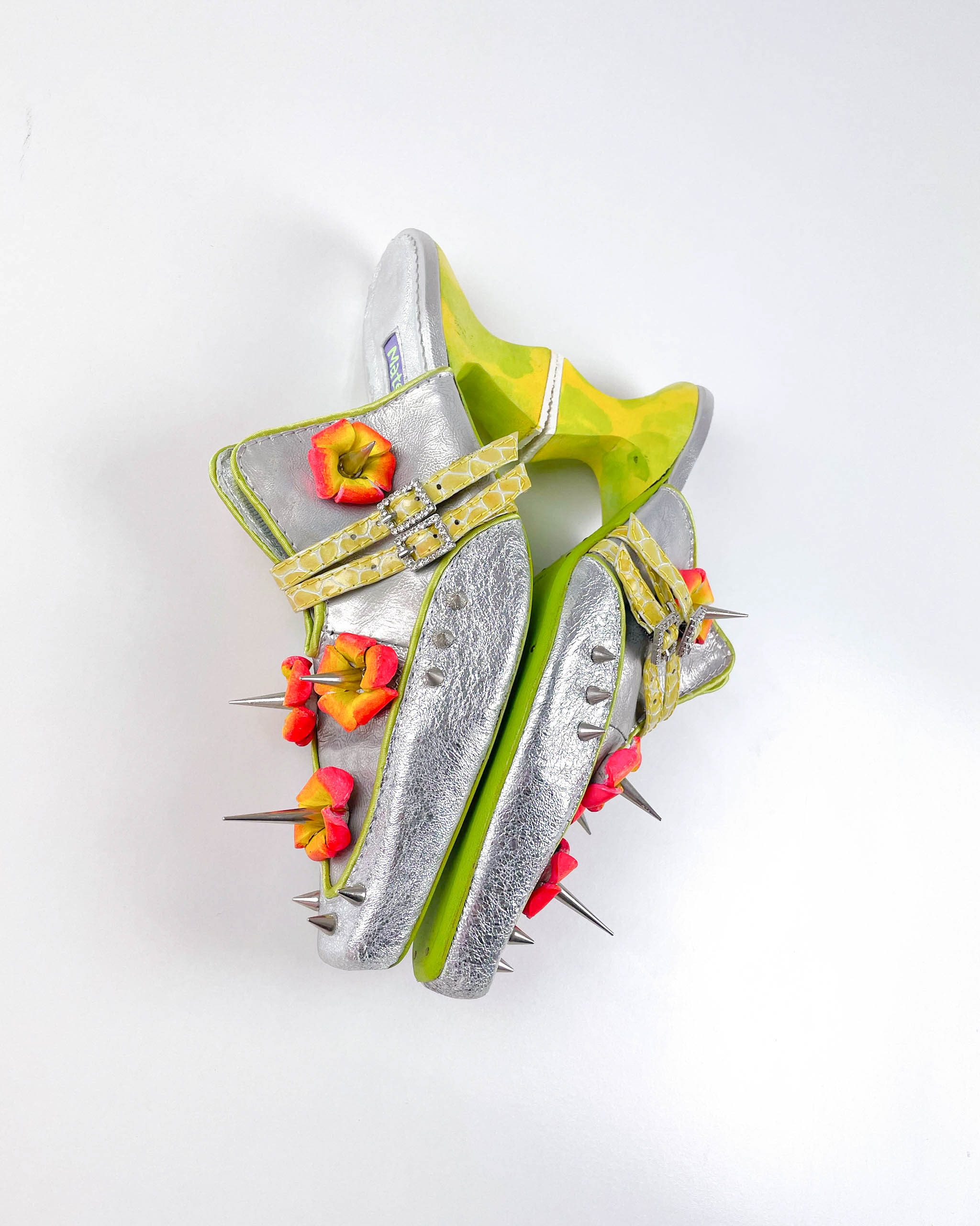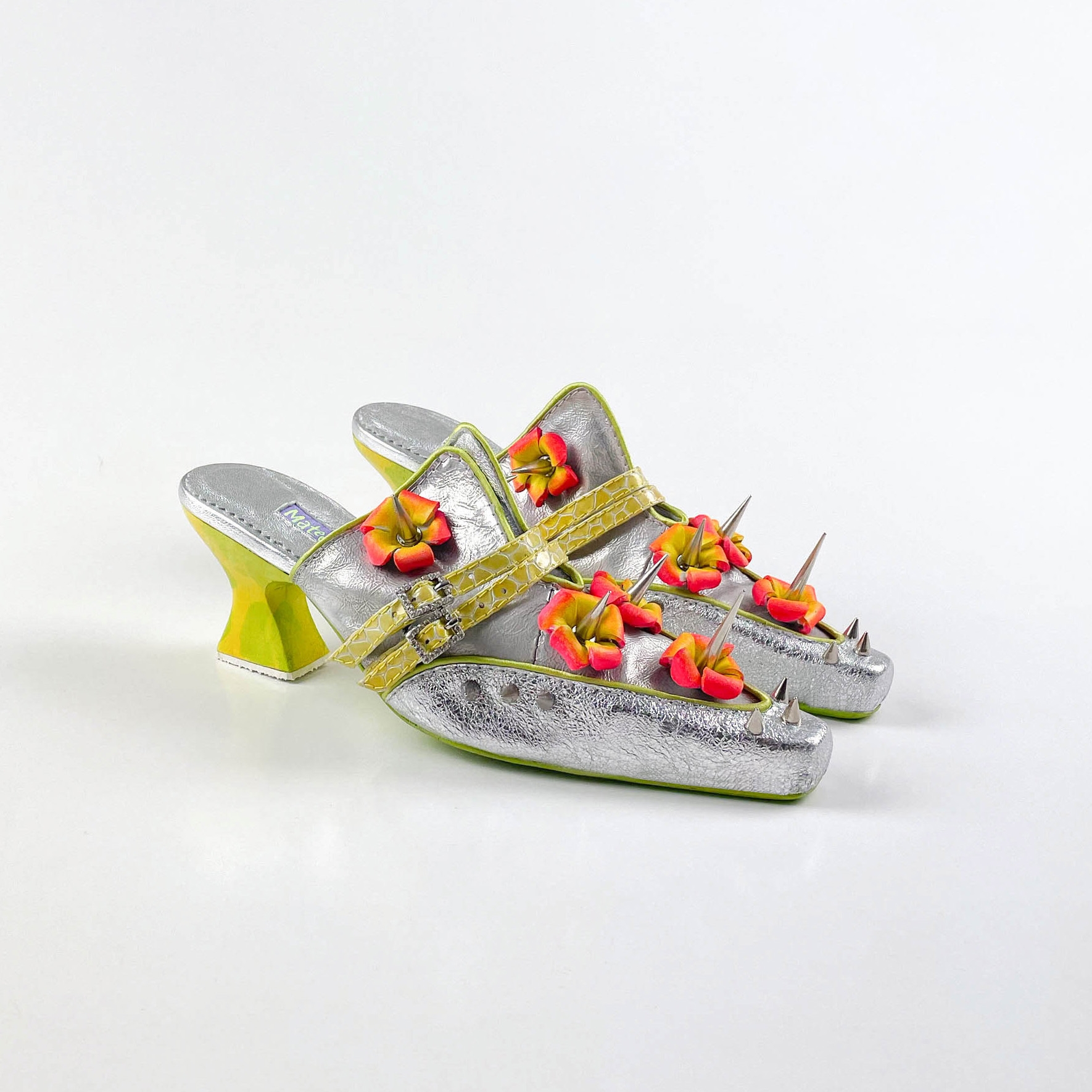 It's the year 3000. You are Ocean Girl. You've entered the Intergalactic Seahorse Competition, aka the ISC. You are sure these silver mules with frangipani flower and spike detailing will get you that trophy - they embody everything the ISC judges look for - elegance, boldness and rave-readiness.