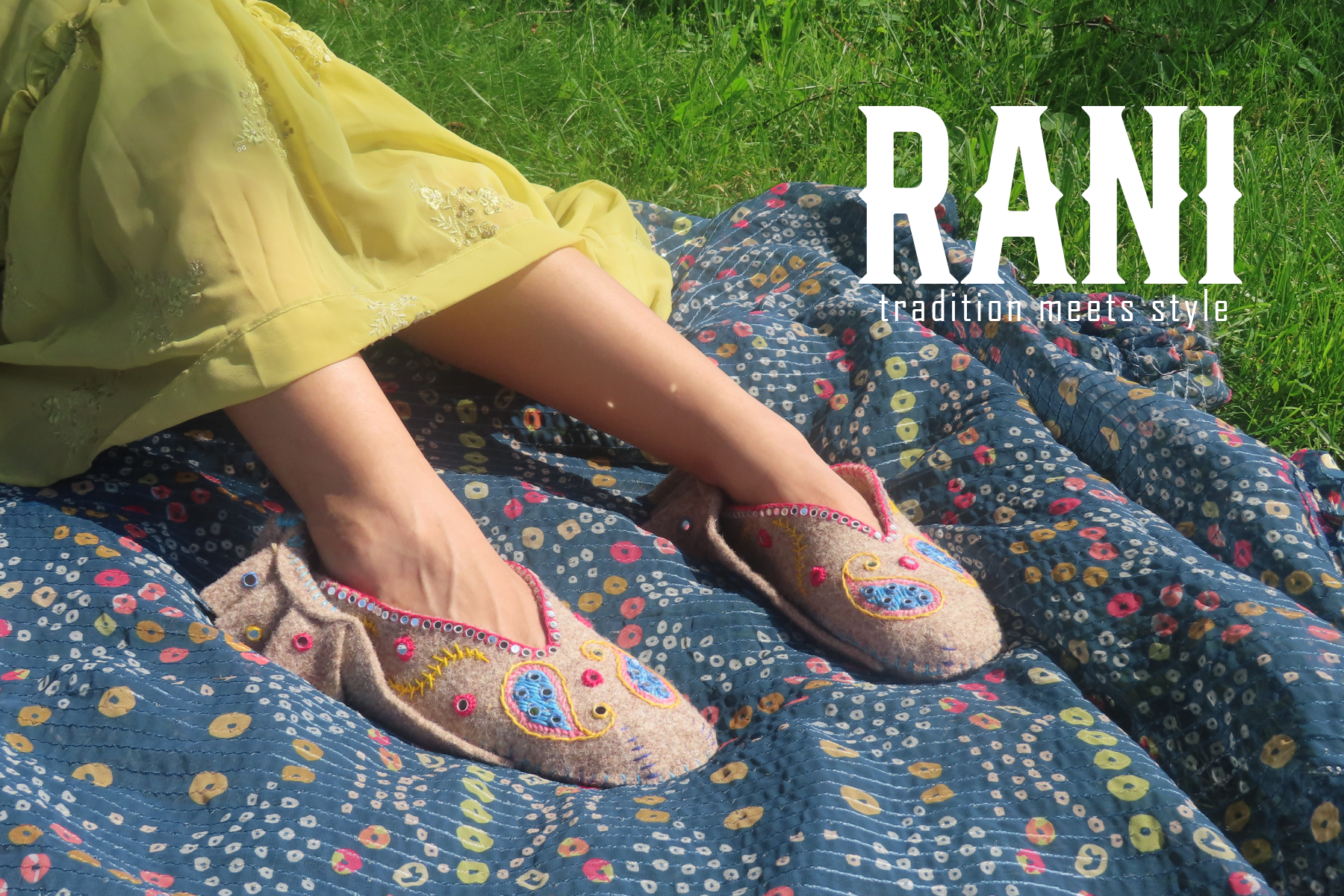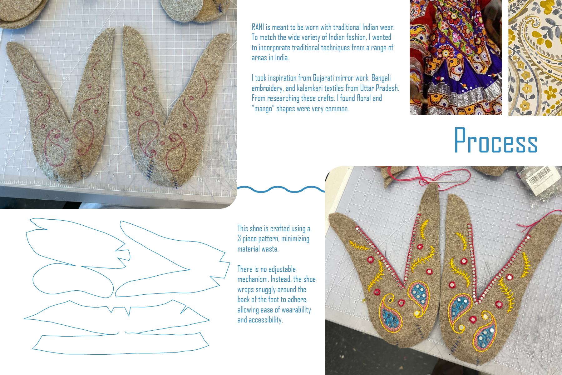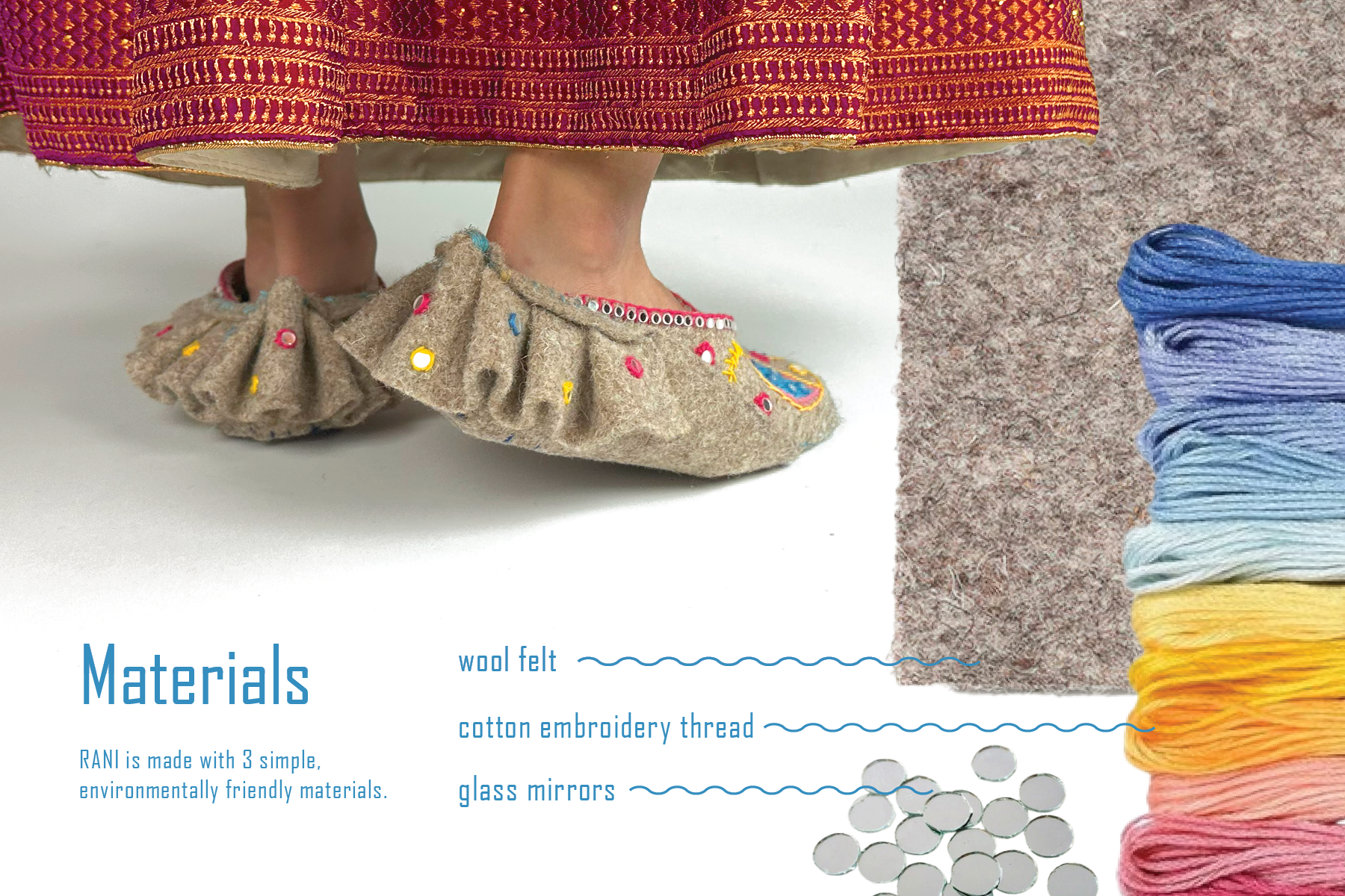 RANI blurs the line between the past and the present by rethinking the traditional Indian mojari shoe, commonplace during traditional Indian festivals and events. Made with a simple 3 piece pattern and 100% wool felt, RANI delivers a bold statement while being sustainable and resource efficient.
