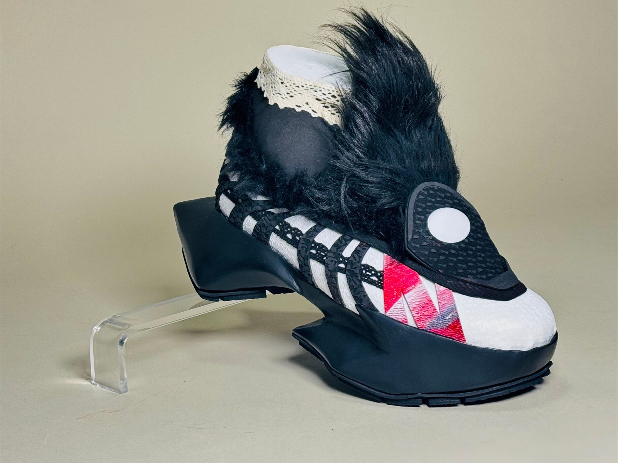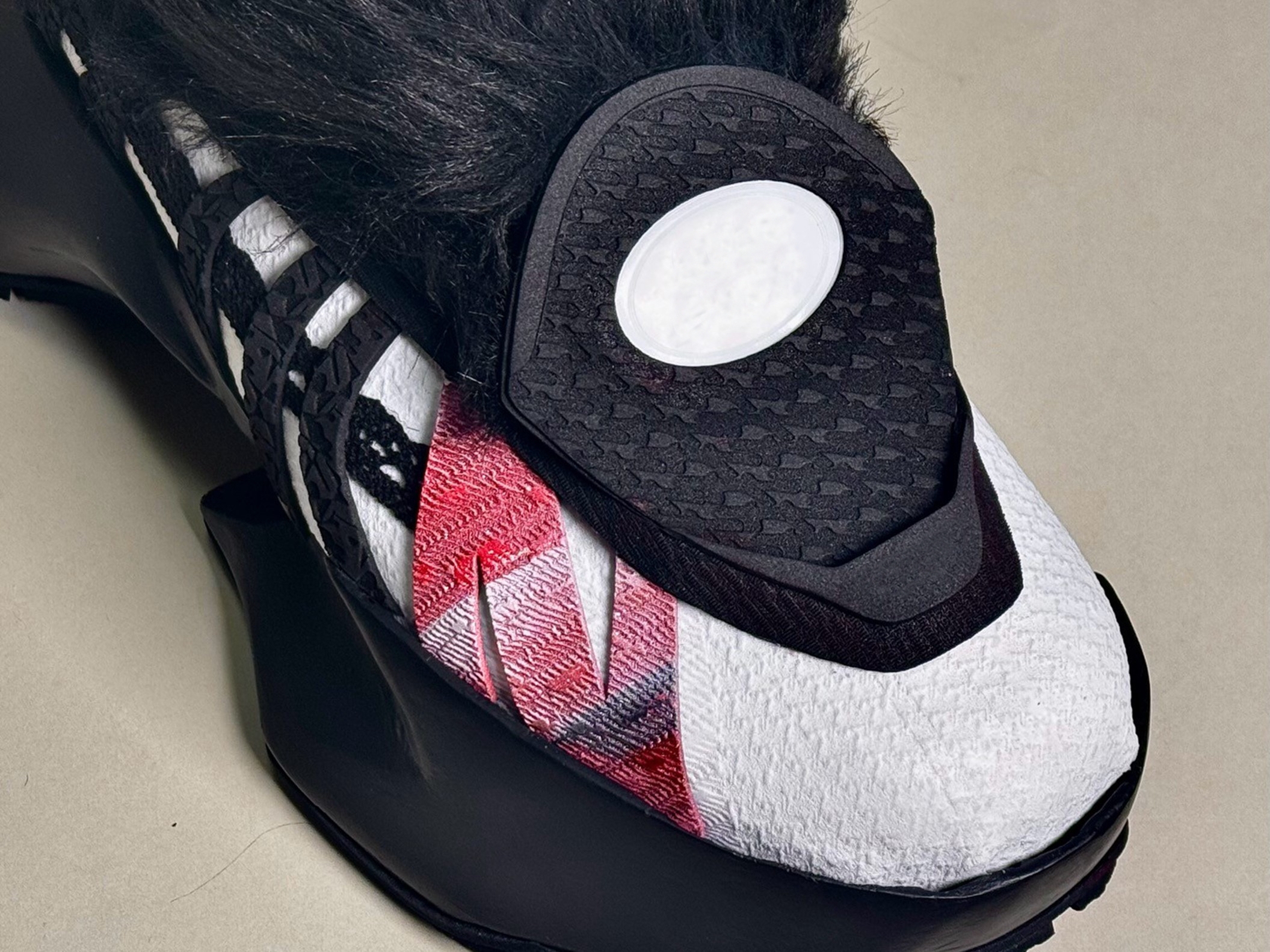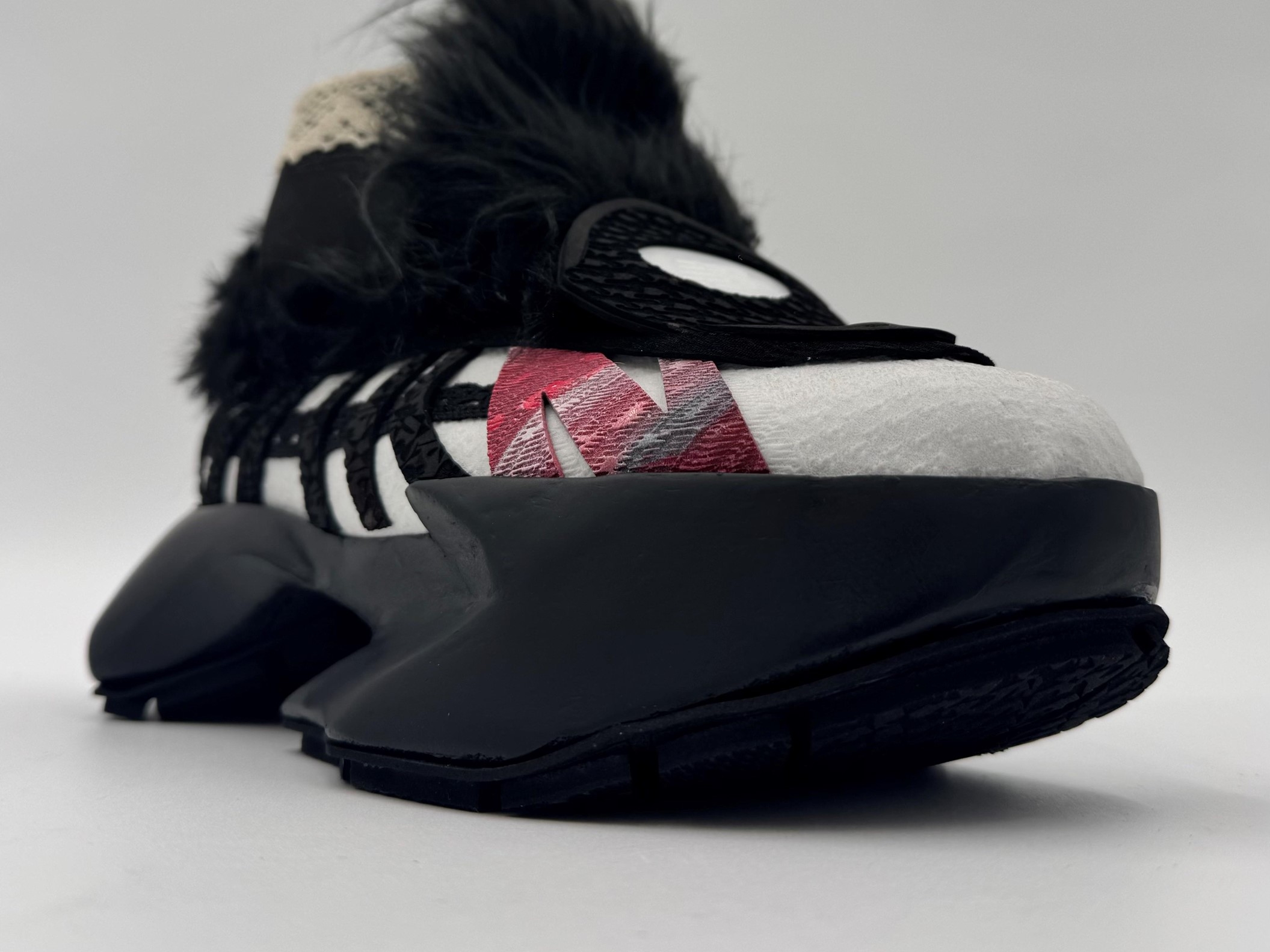 Blending the moth’s elusive wingbeat, the mantis’s lethal precision, and the black swan’s graceful spin, the Phantom Ballerina is both dancer and predator. All-black, rounded midsole stands solid as dark stone; layered uppers ripple like wings in shifting light— every step, a silent approach before the strike.