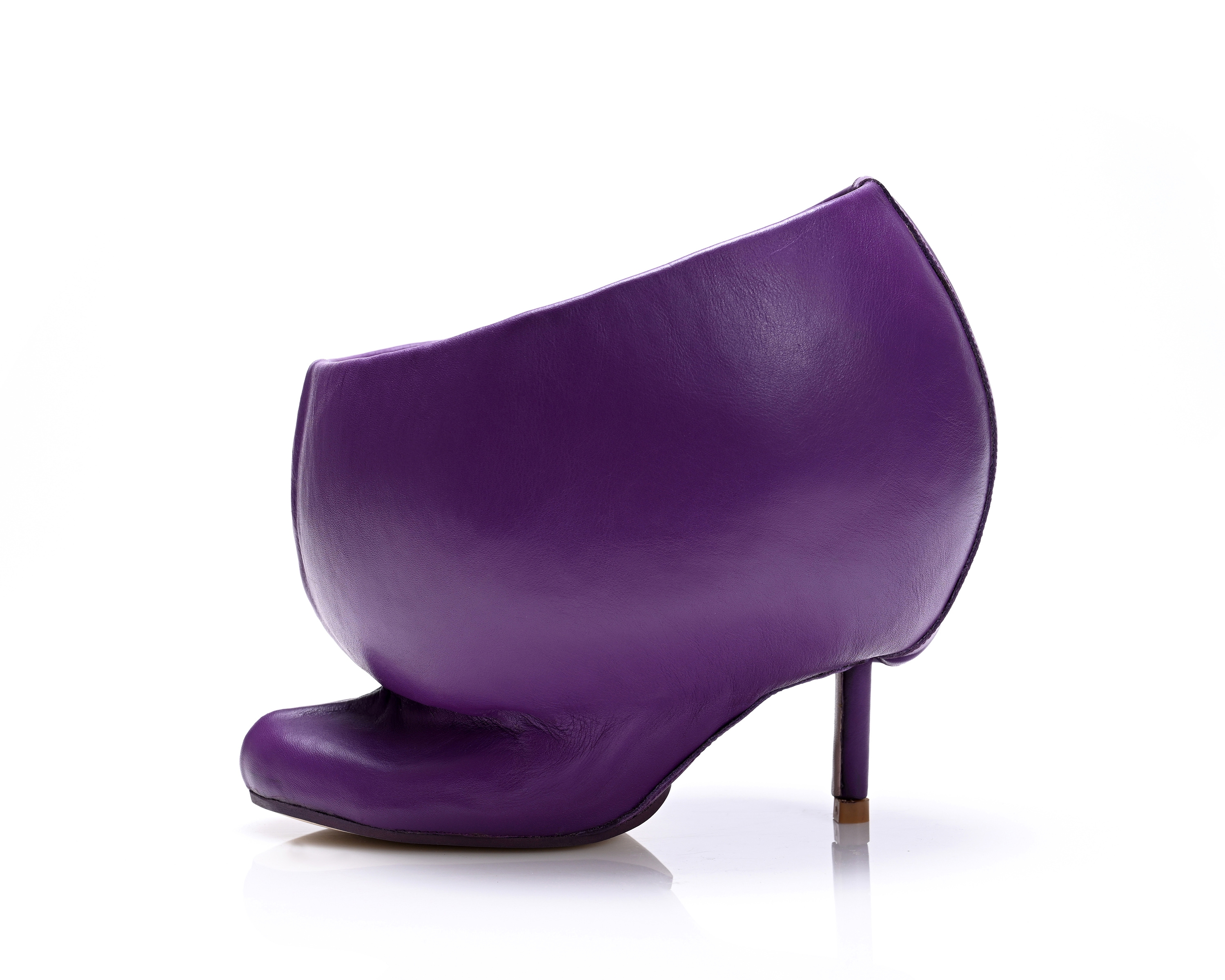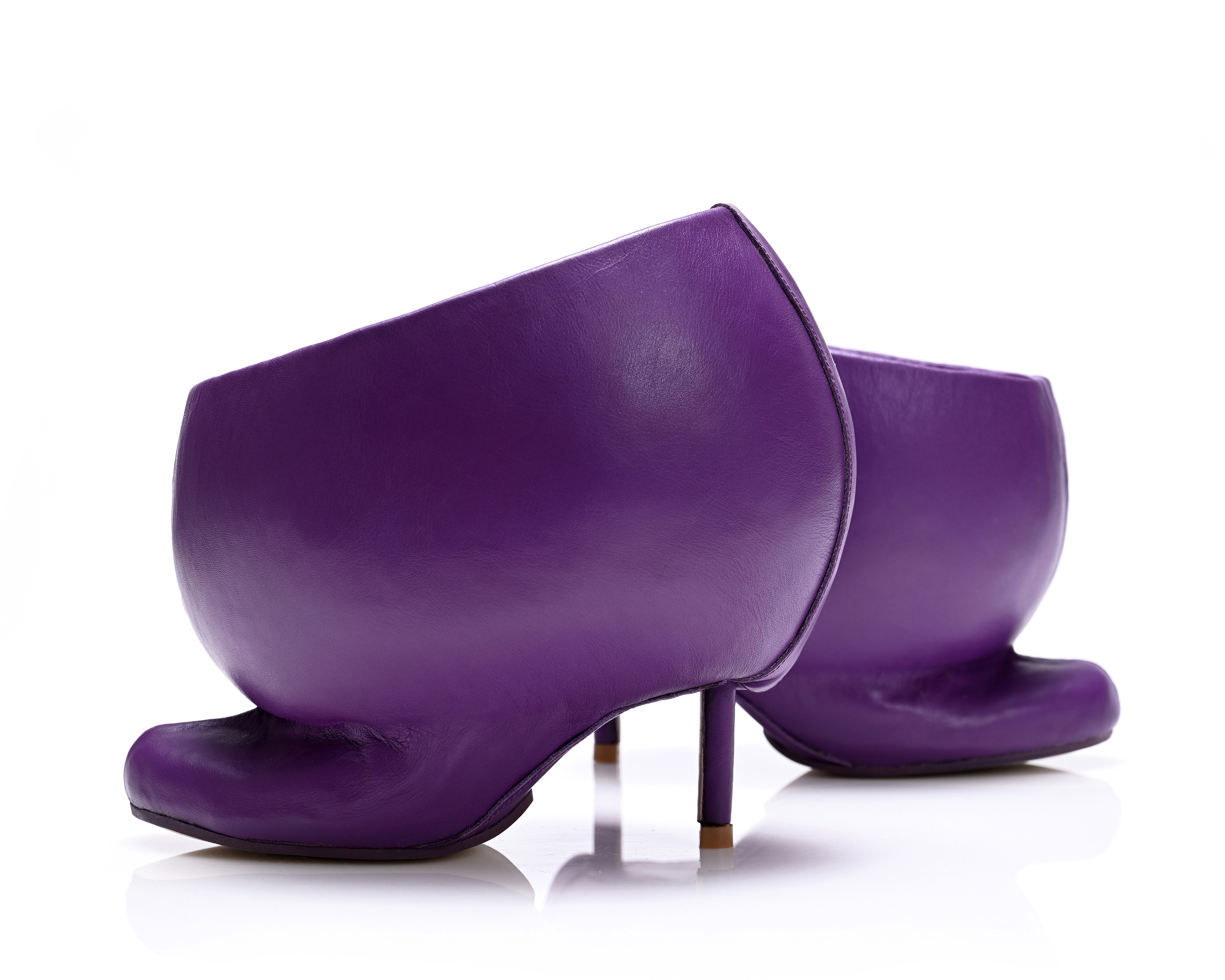 This work explores the nature of disorienting transition, capturing a moment of disruption. The familiar lower part of the footwear serves as a foundation, anchoring the design. However, it is abruptly altered as traditional shoe-like features are stripped away in favor of abstraction. The monochromatic color enhances the footwear’s unconventional form and exaggerated volume. Despite its avant-garde appearance, the internal mule structure ensures the shoe remains functional, grounding the surreal in practicality. Ultimately, this design embodies a moment of intense change and impact.