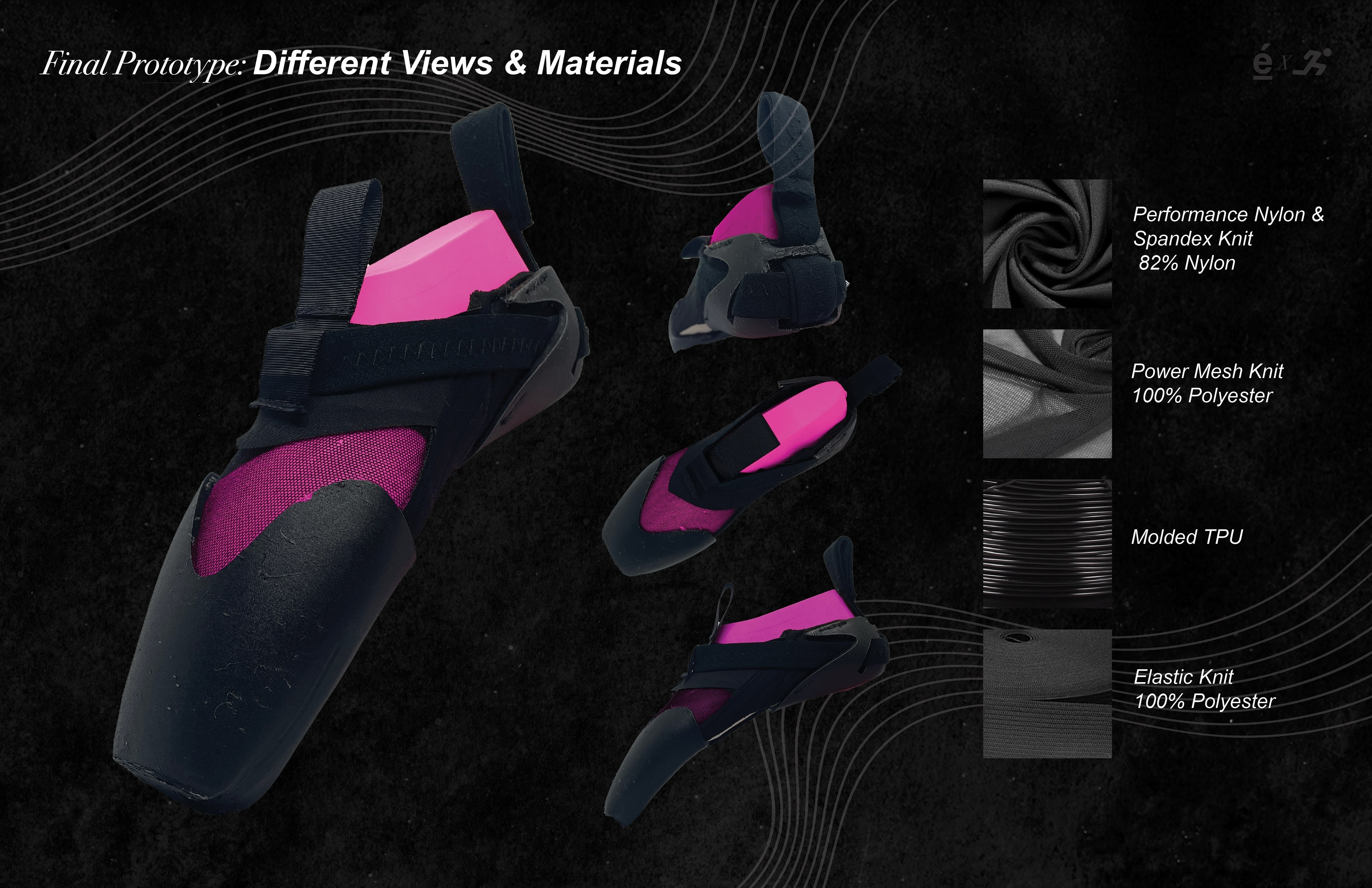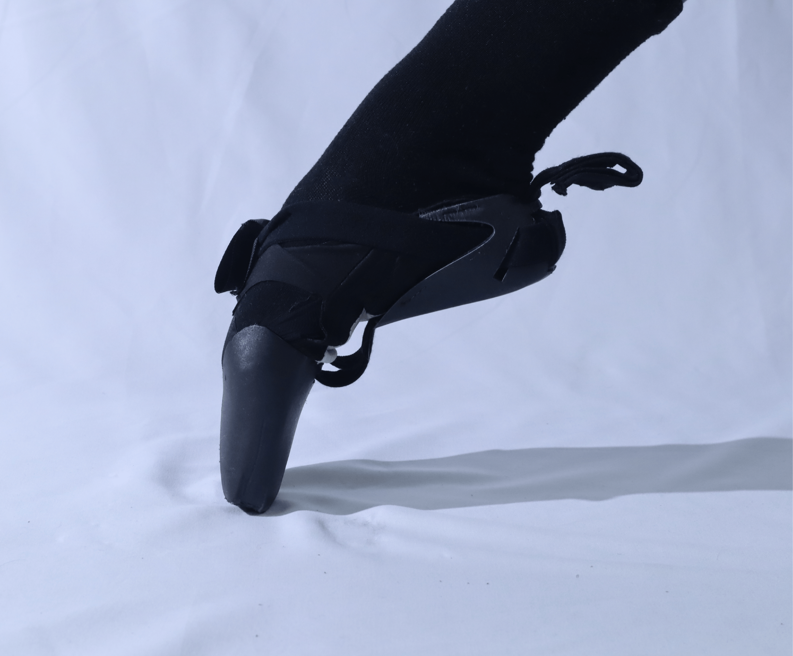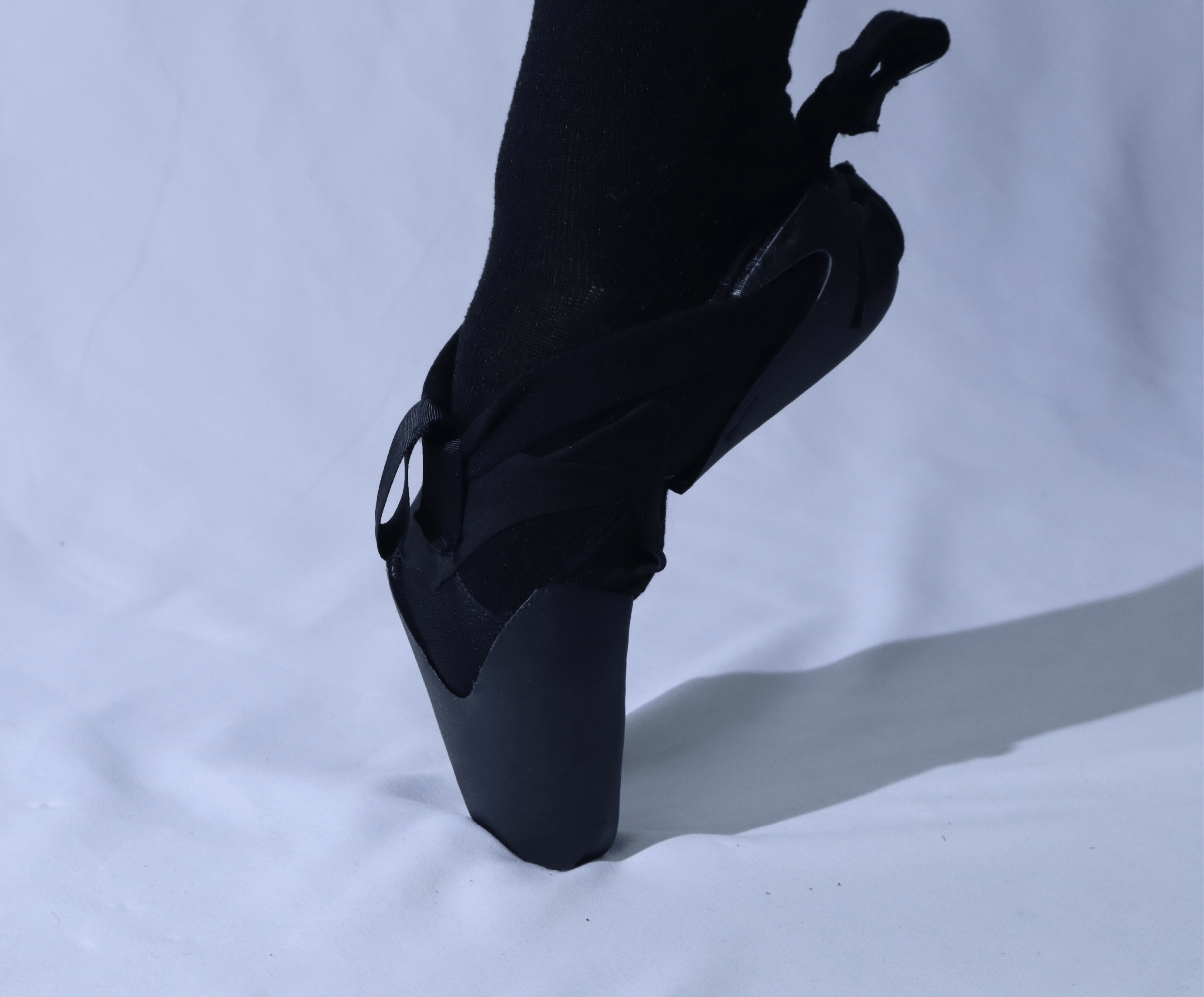 elevé features adjustable elastic straps, 3D Printed TPU toe and heel cages, as well as soft sweat wicking materials, all with intent to support dancers as they get on point.